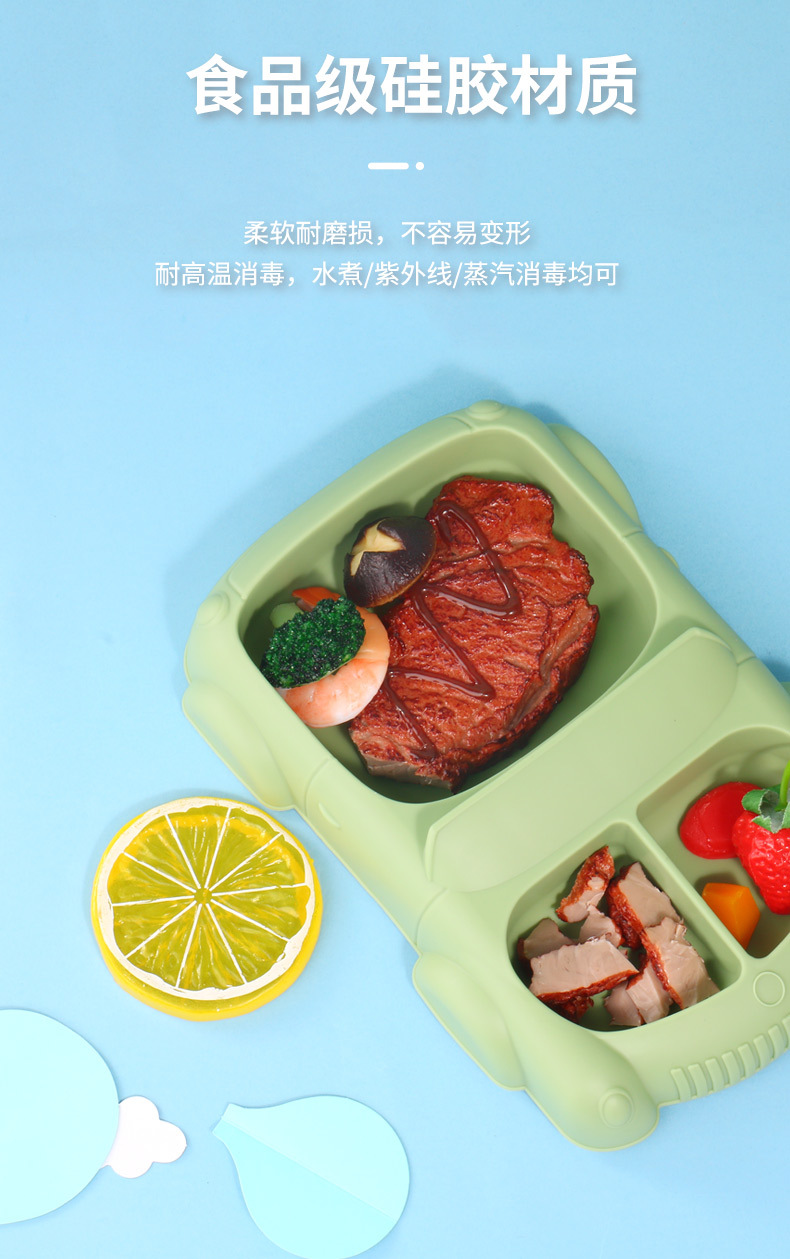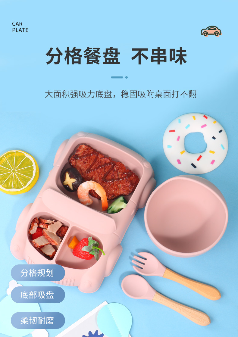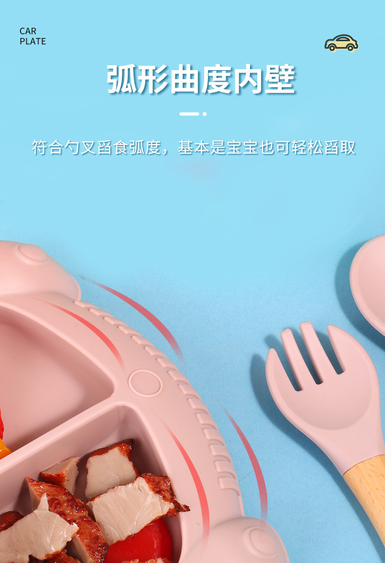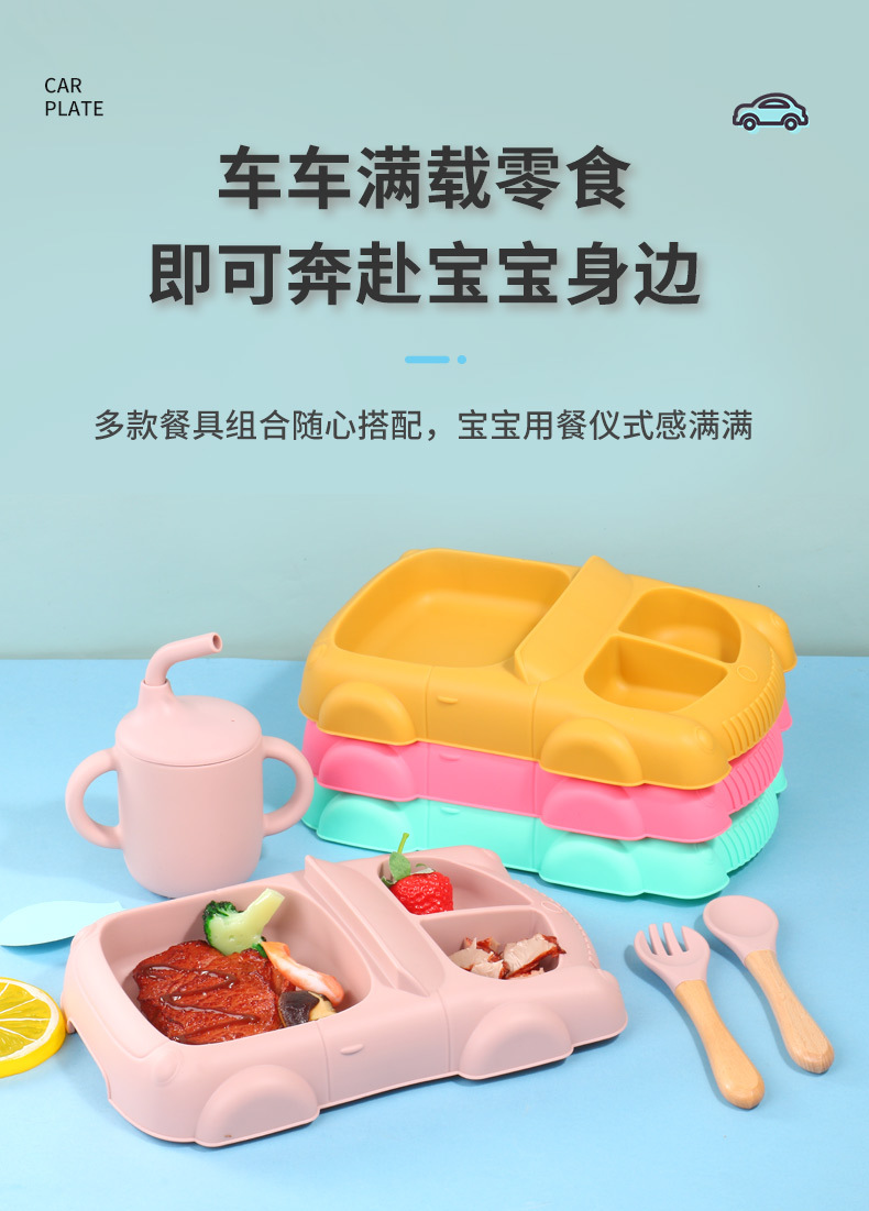 工厂新品婴儿硅胶餐盘大吸盘餐具套装8件套卡通儿童汽车硅胶餐盘