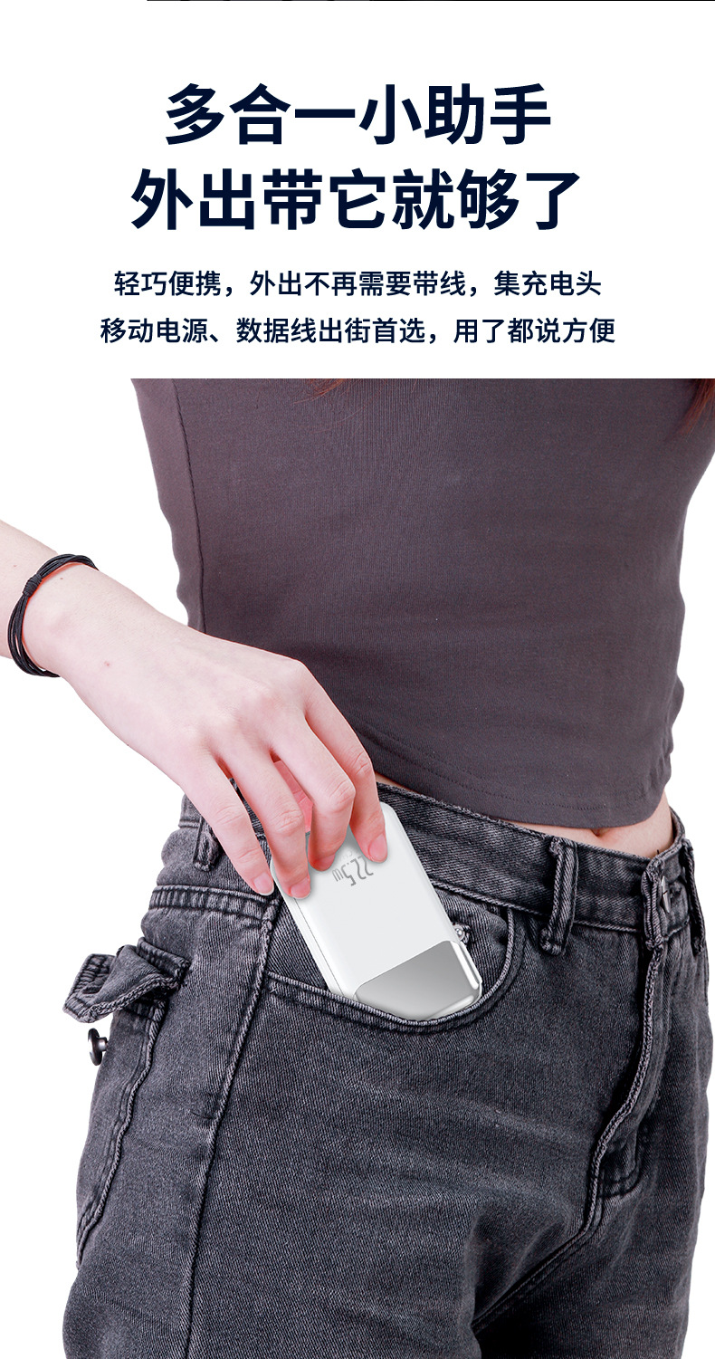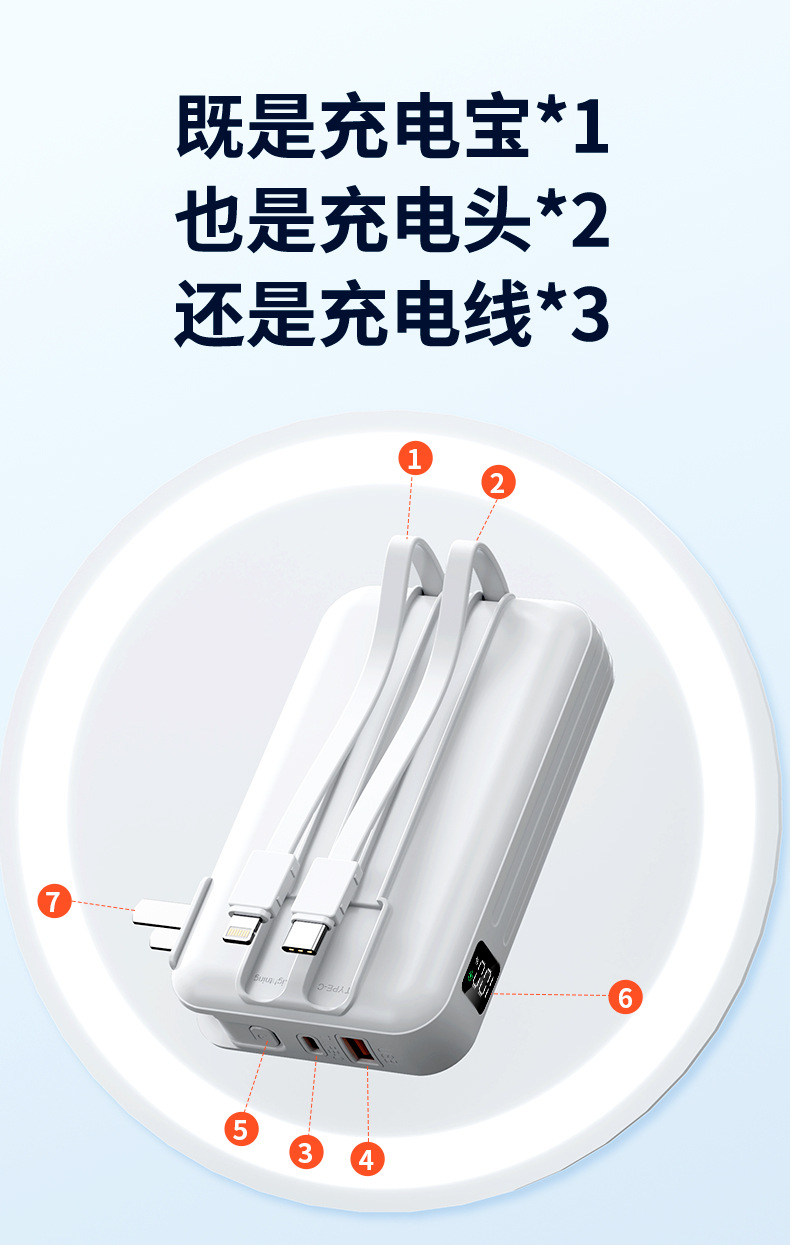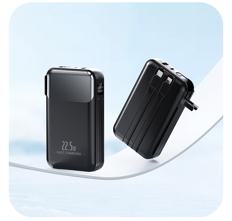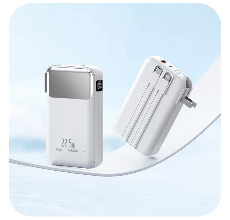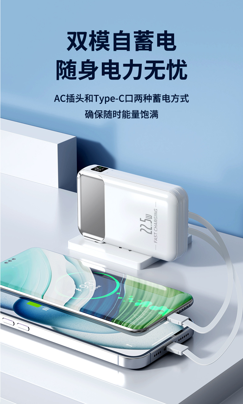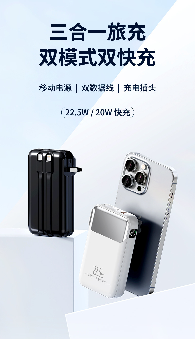 跨境AC插头充电宝便携墙插三合一自带线大容量22.5W快充移动电源