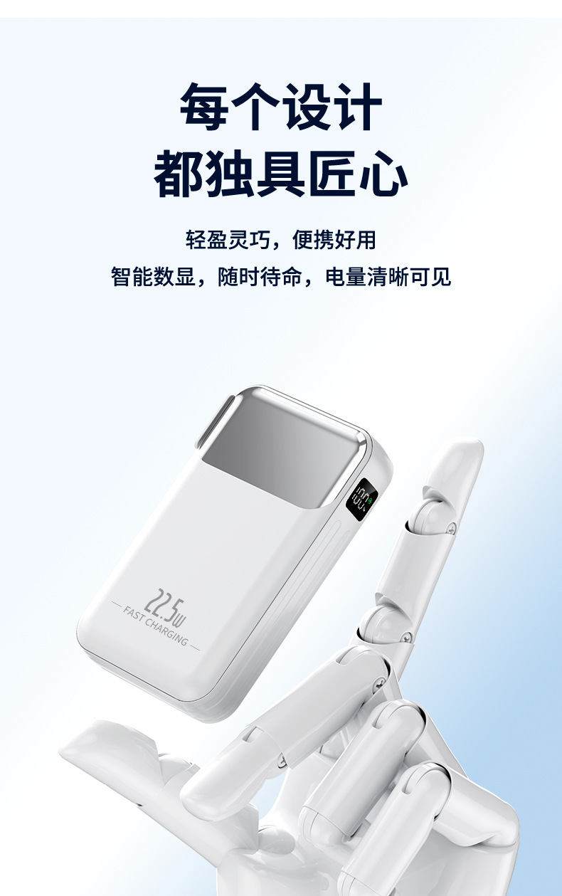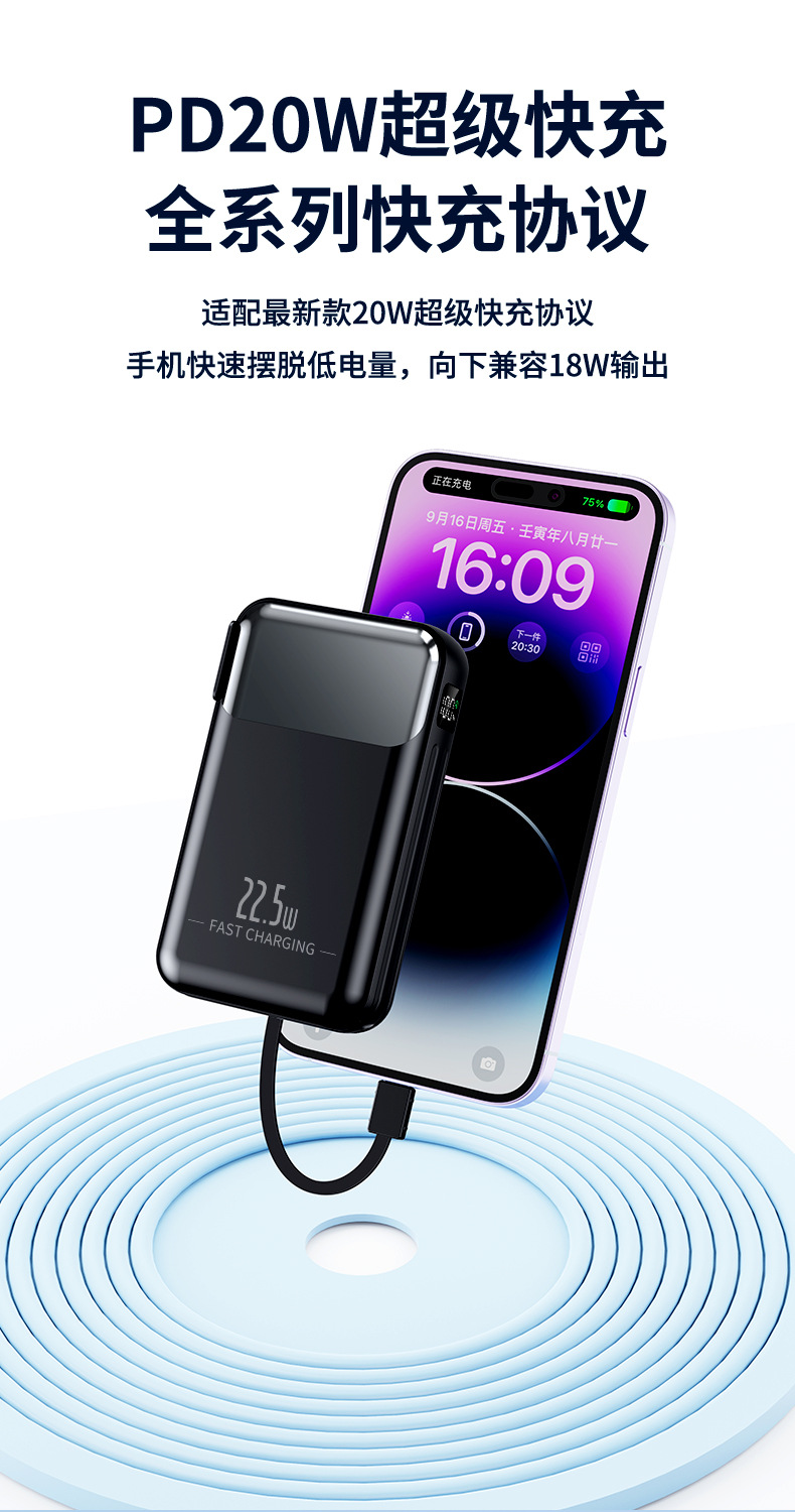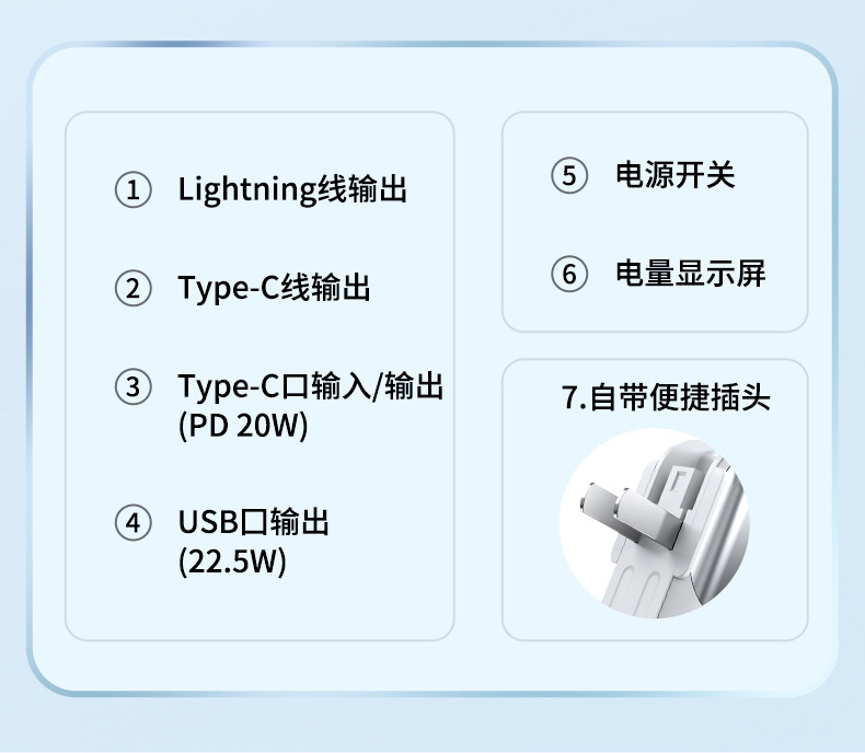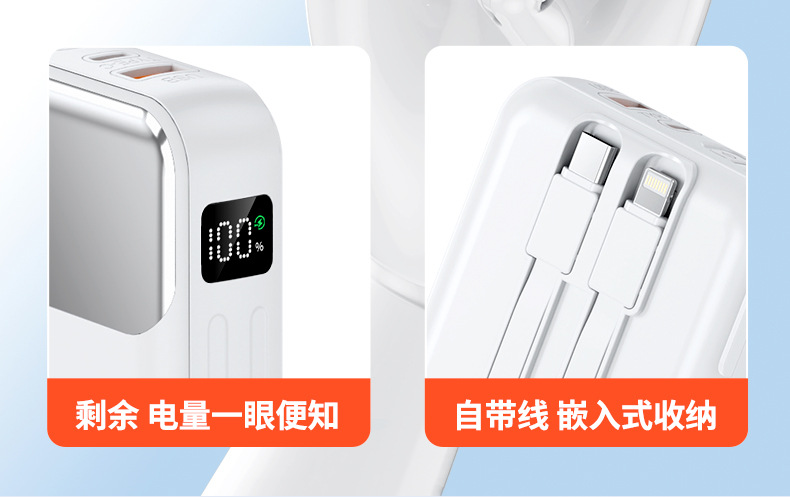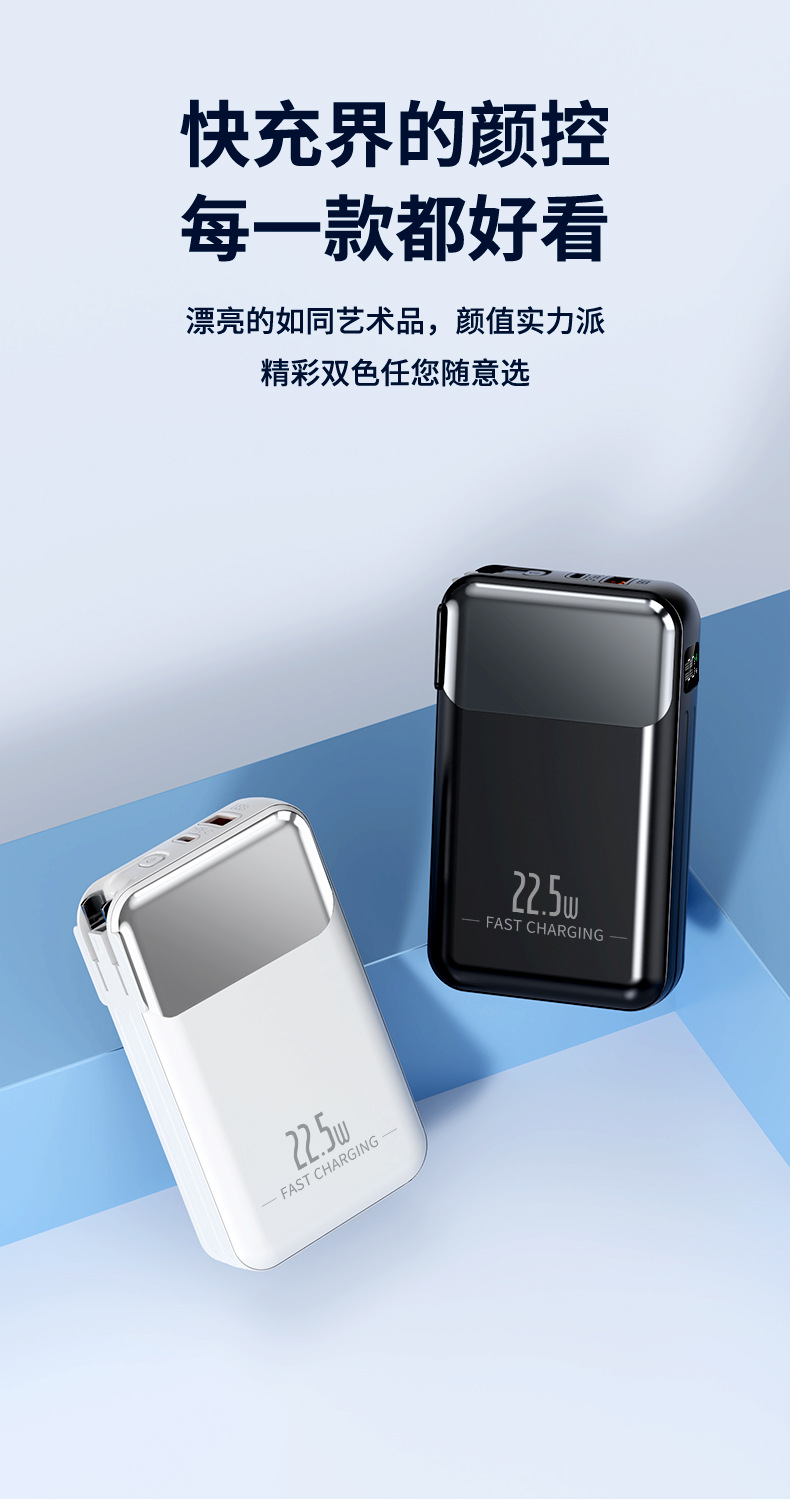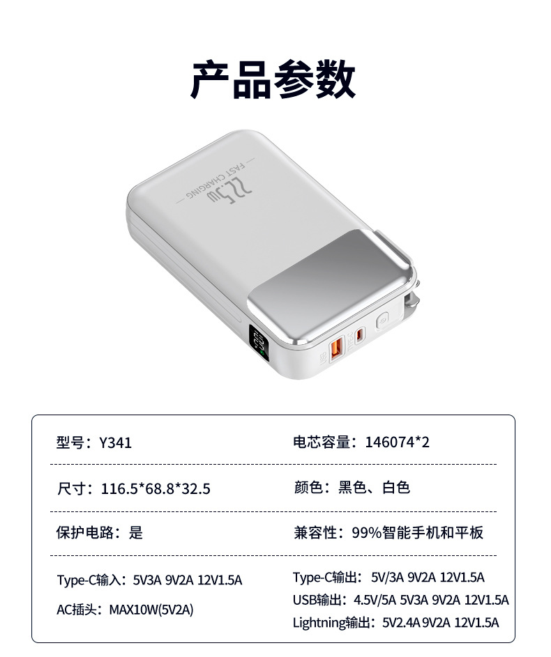 跨境AC插头充电宝便携墙插三合一自带线大容量22.5W快充移动电源