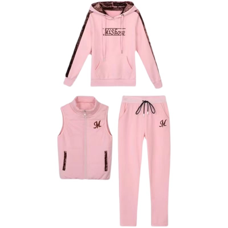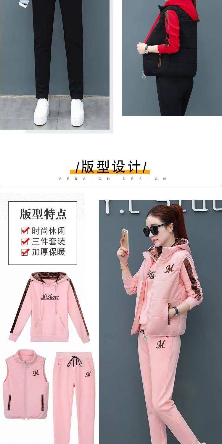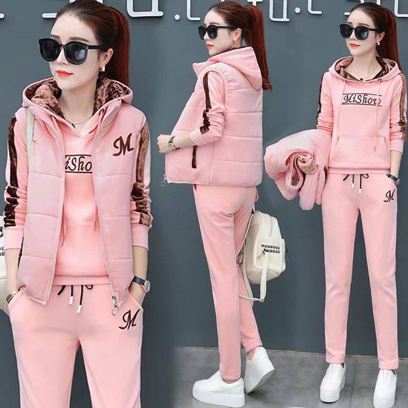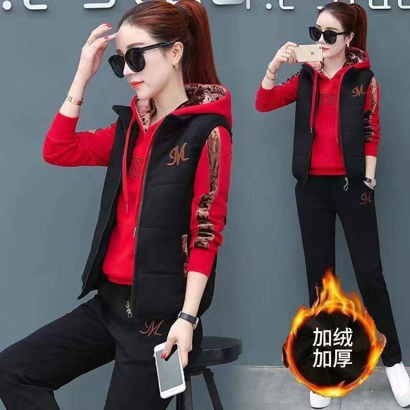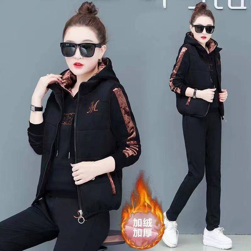 加绒加厚大码运动服套装女秋冬2024新款休闲三件套冬季时尚套装女