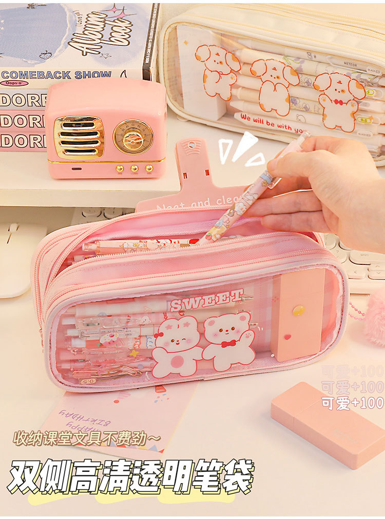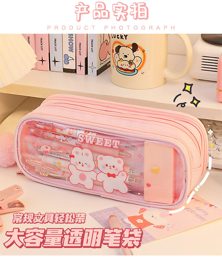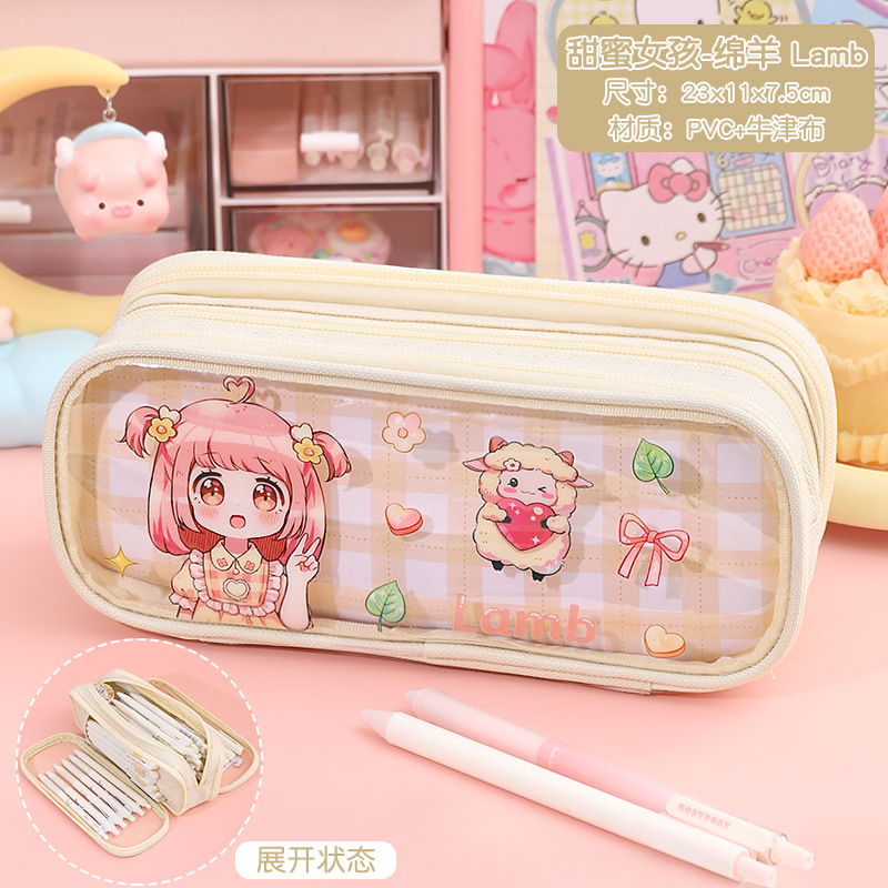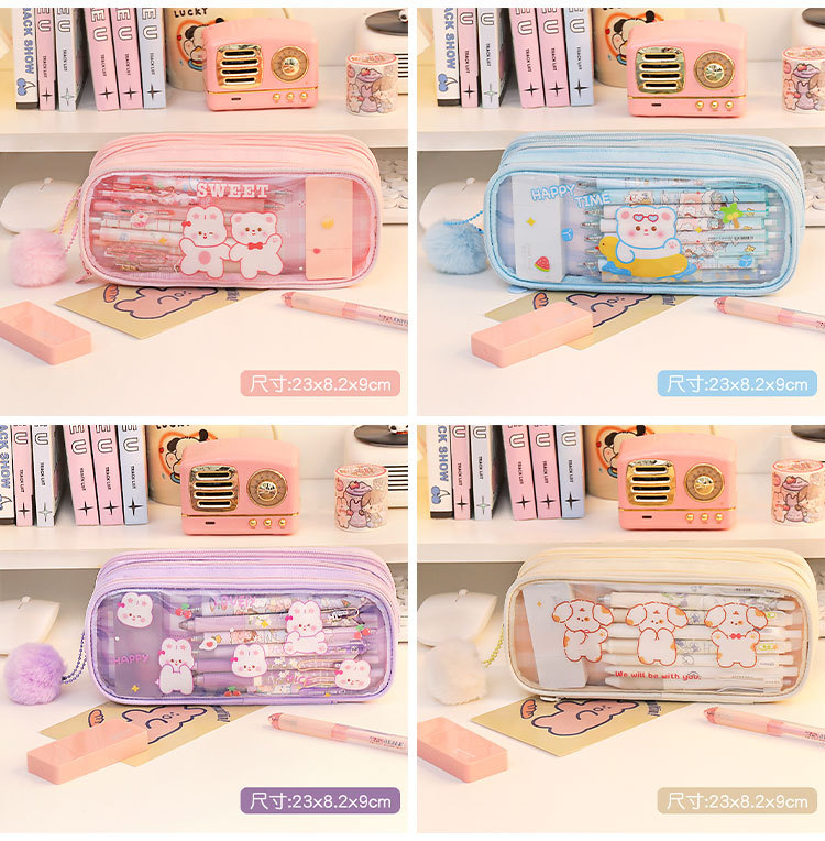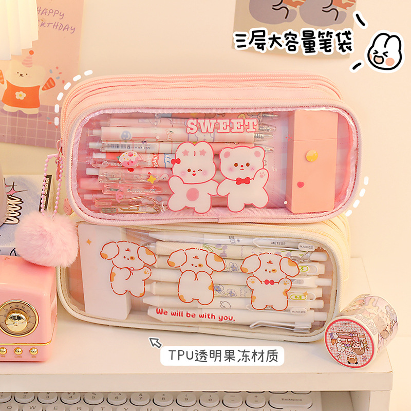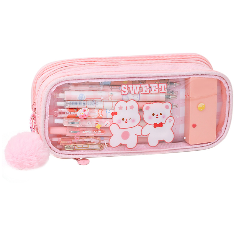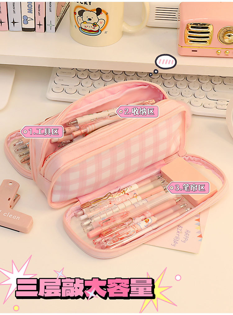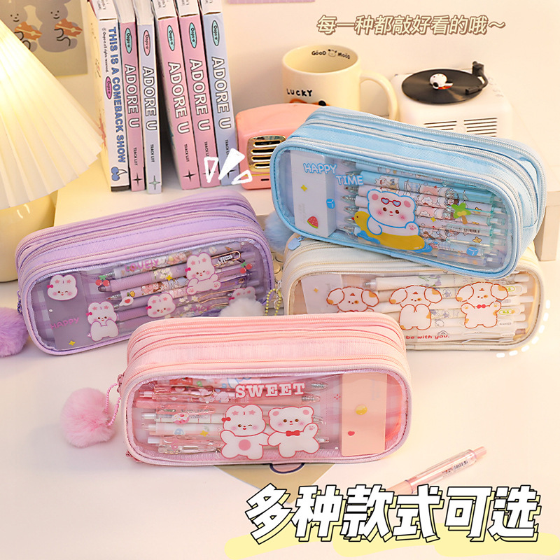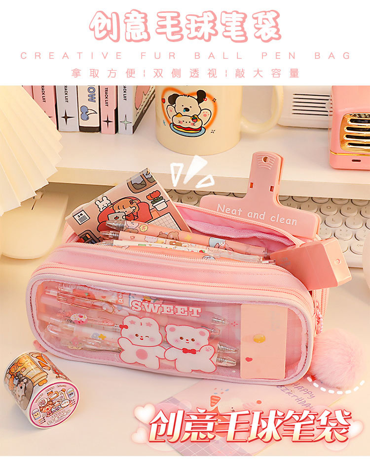 可爱创意毛球笔袋中学生大容量文具三层文具袋高颜值女生收纳包
