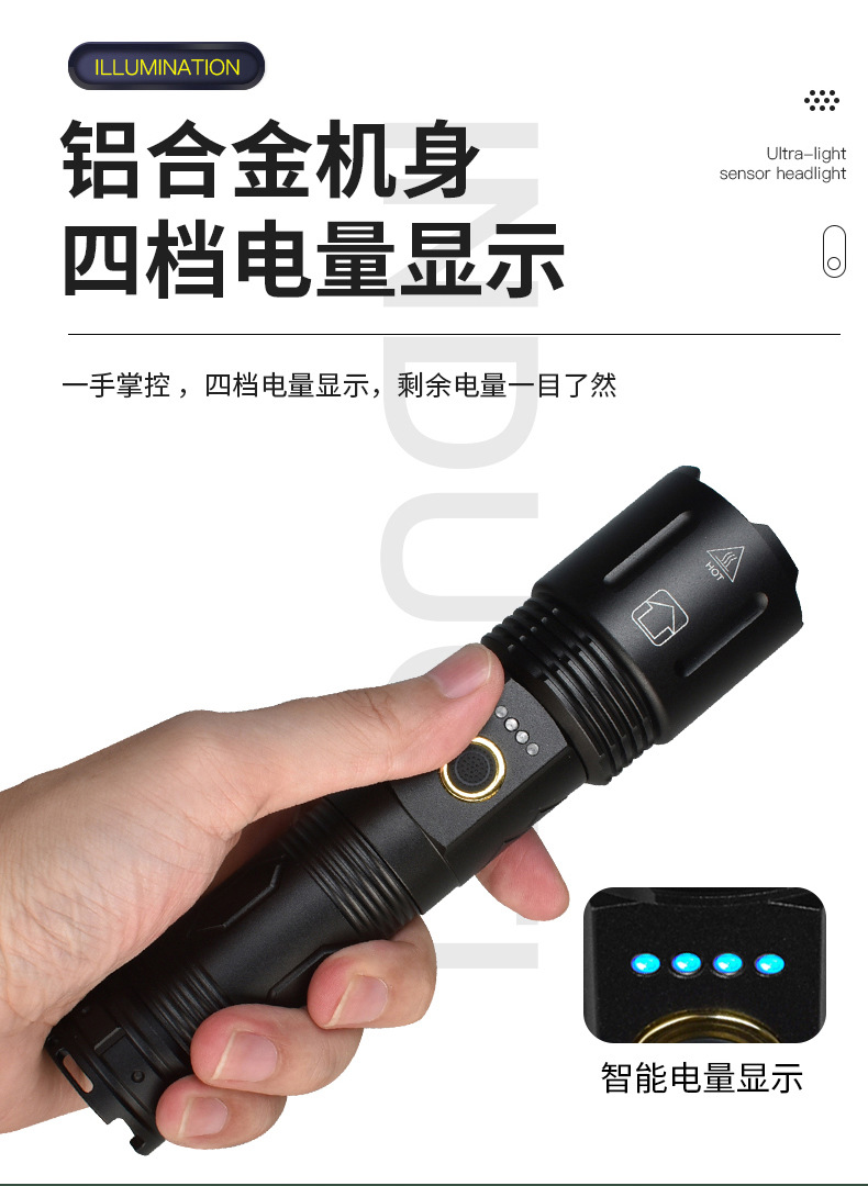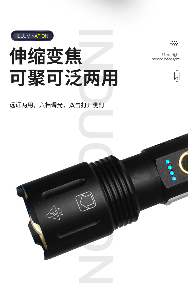 外贸专供强光铝合金可充电手电筒 夜间作业带COB