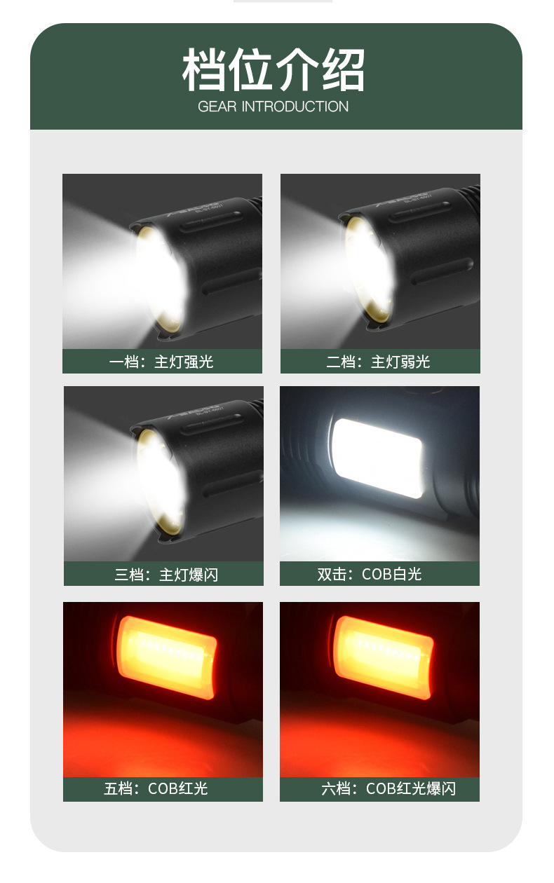 功能: 强-弱-闪-双击COB白-COB红-COB红闪