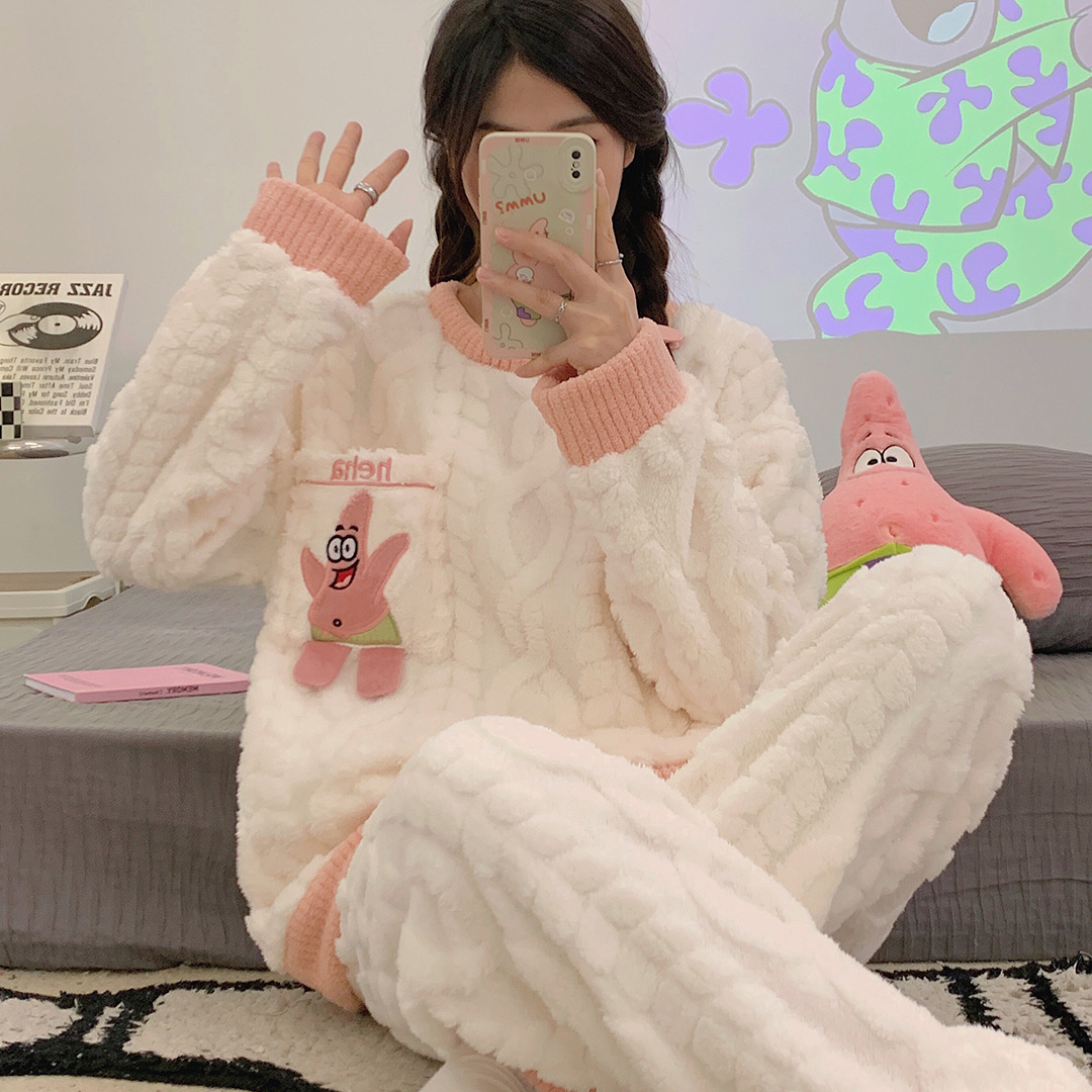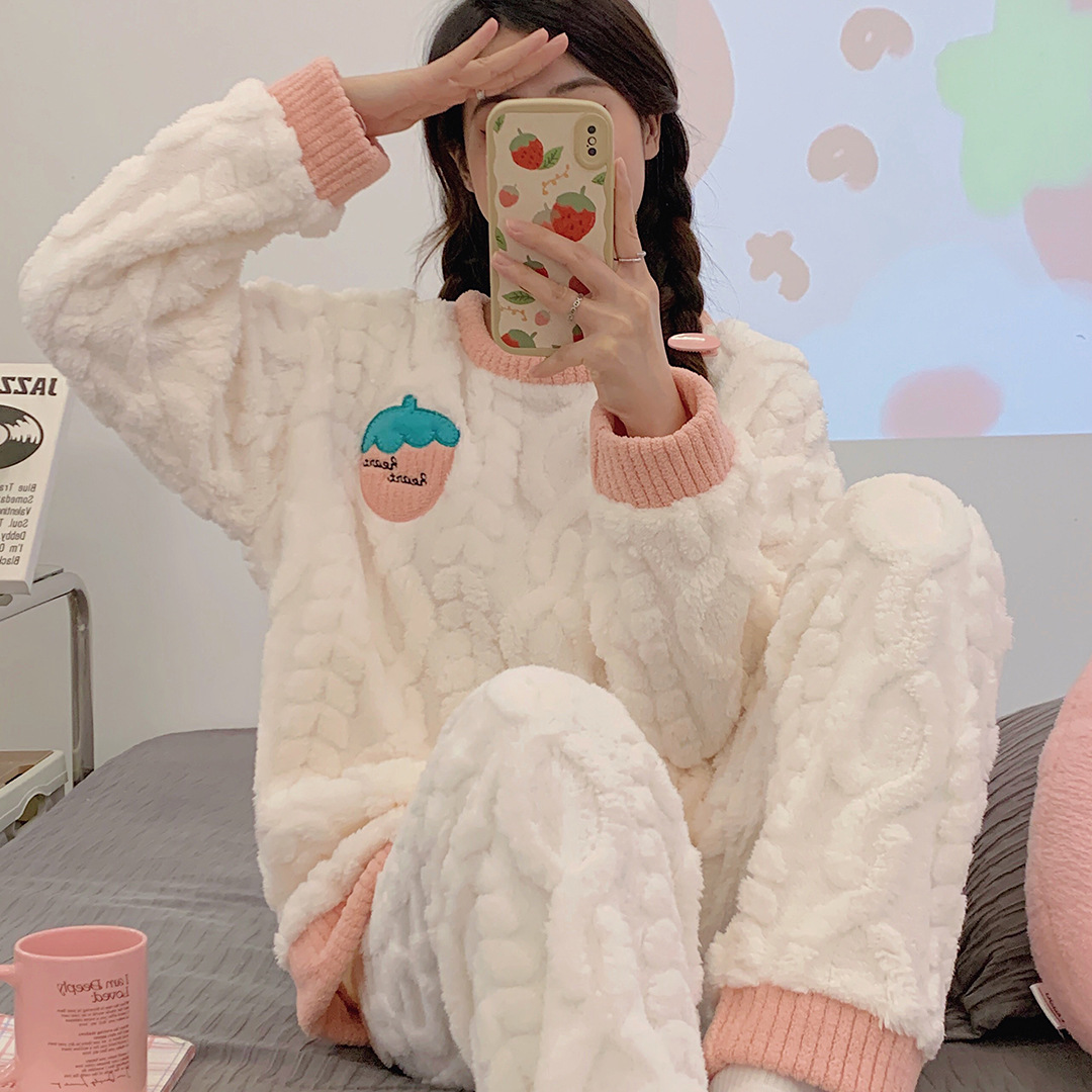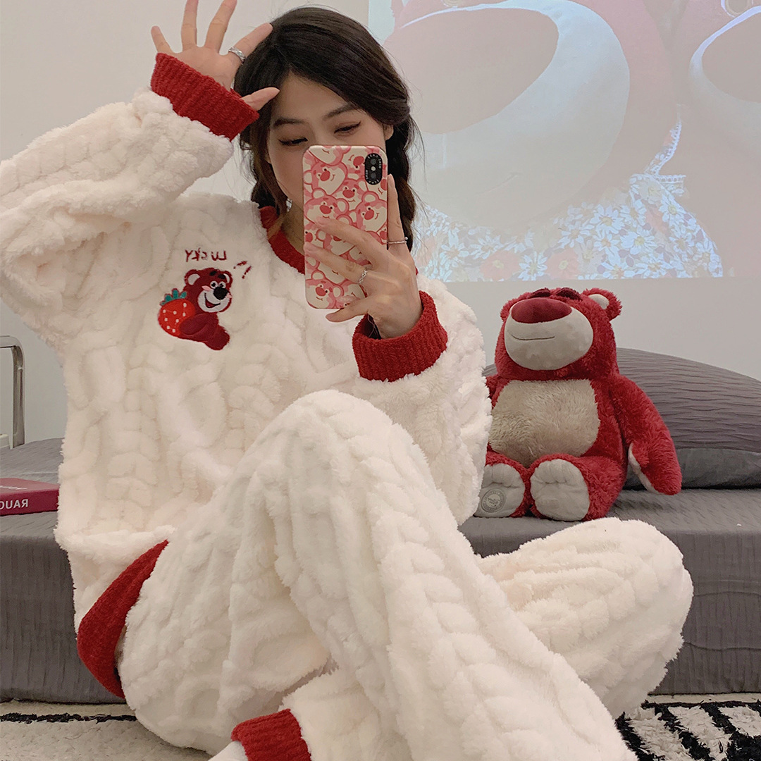 秋冬季卡通可爱草莓熊刺绣圆领法兰绒睡衣女提花宽松保暖直播套装