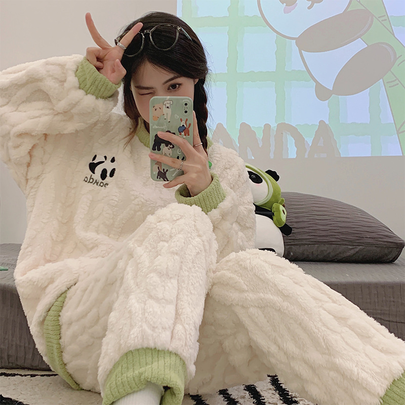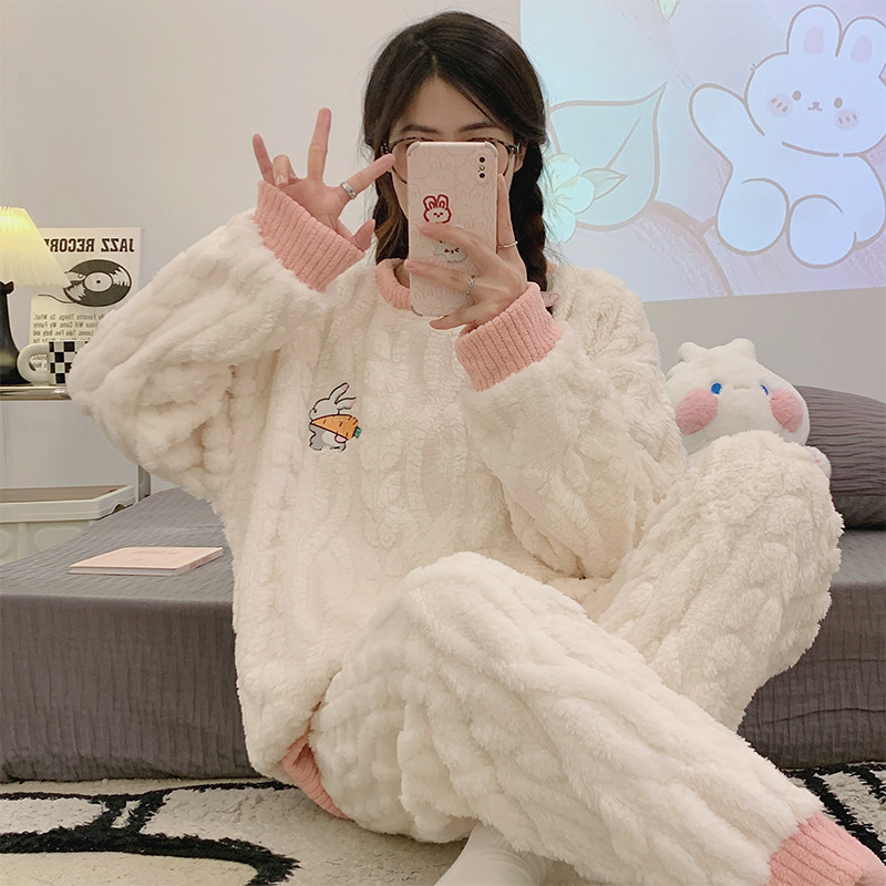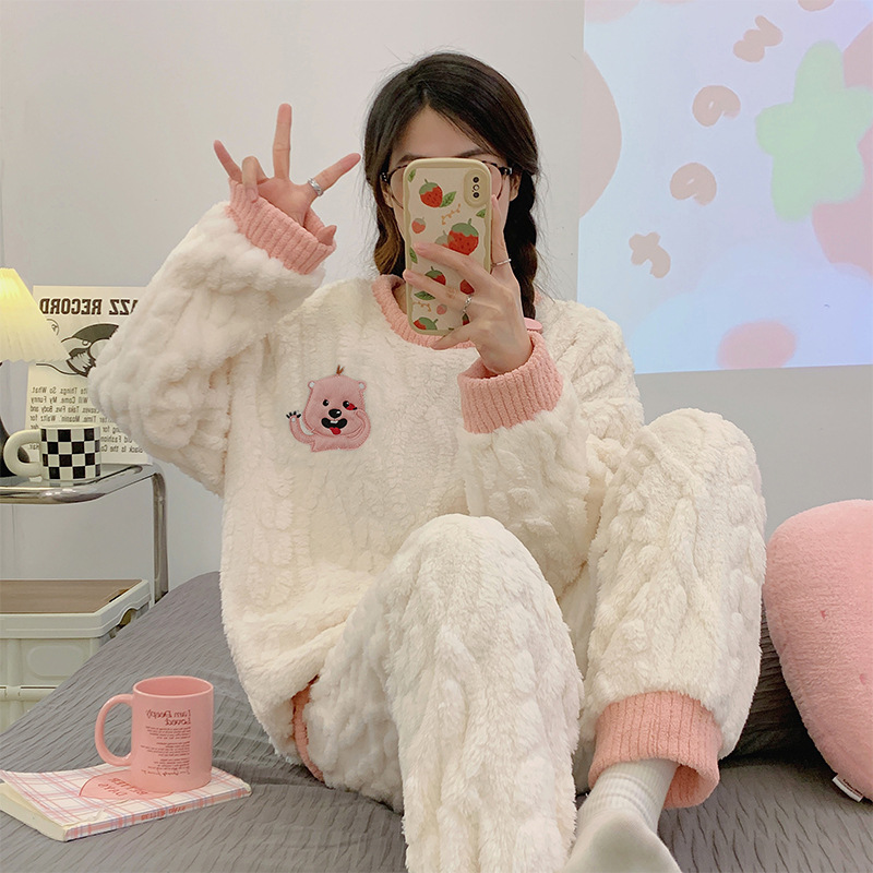 睡衣秋冬季女士长袖加绒加厚珊瑚绒卡通学生宽松家居服套装可外穿