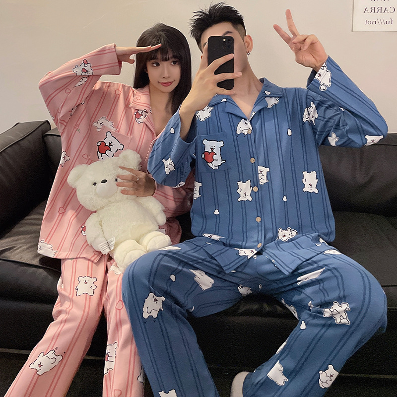 2024年秋冬季新款情侣睡衣女长袖长裤英文翻领开衫男士家居服套装