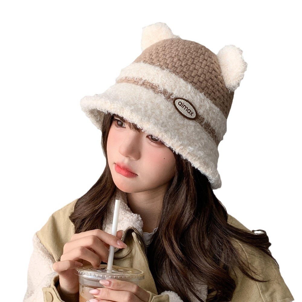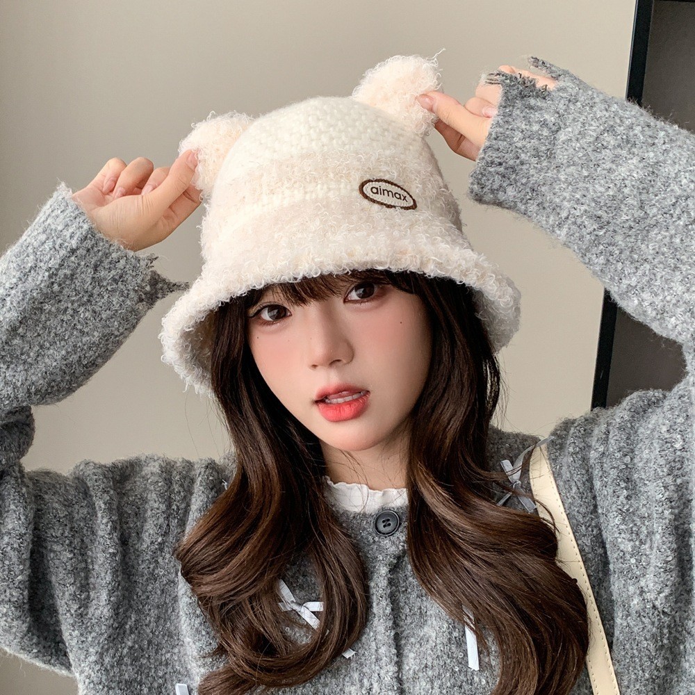 24年秋冬新款韩版可爱小熊毛绒渔夫帽女大头围素颜显脸小盆帽保暖