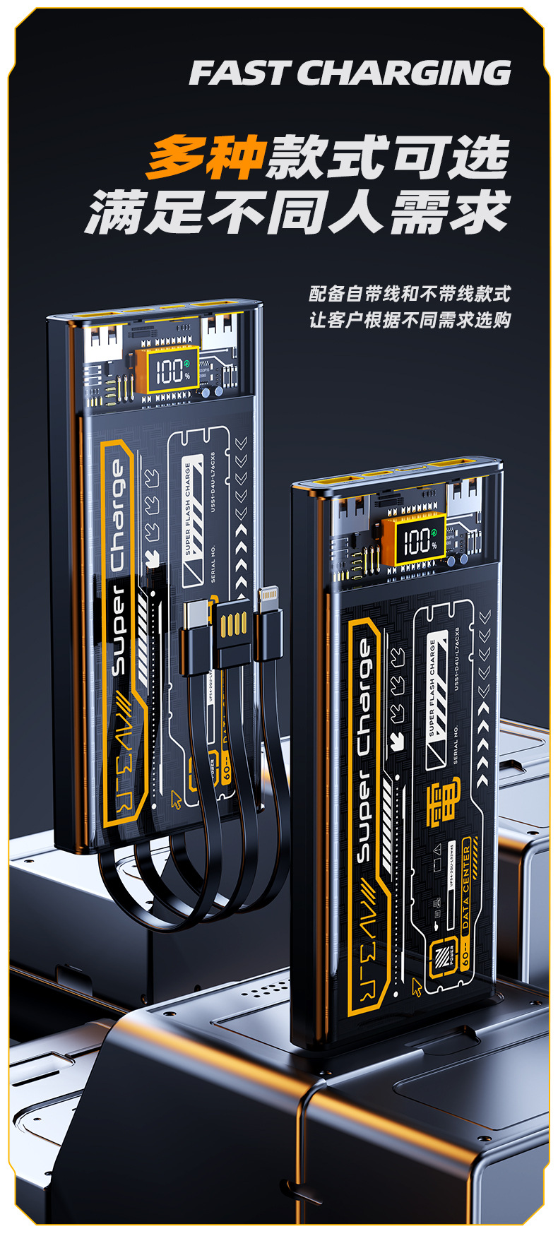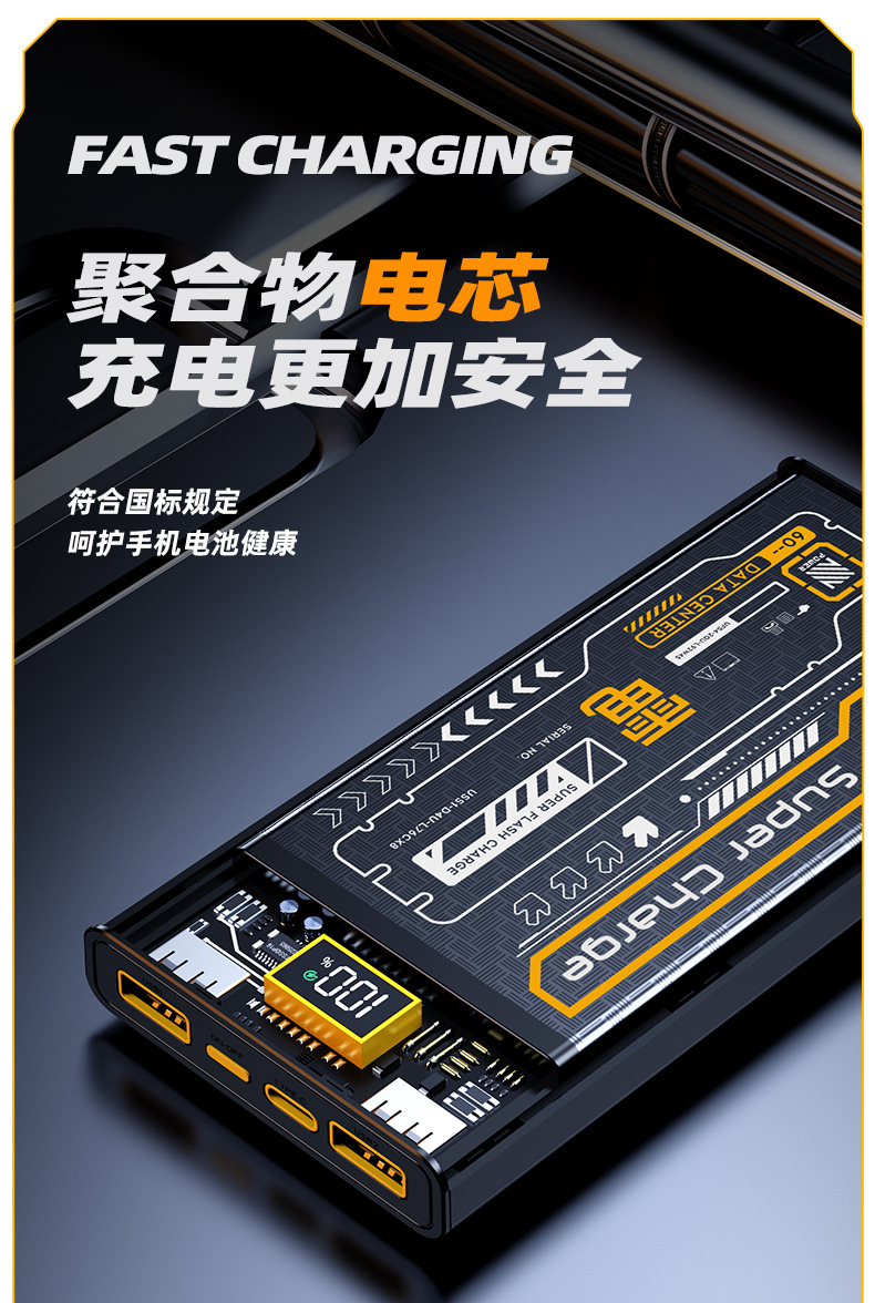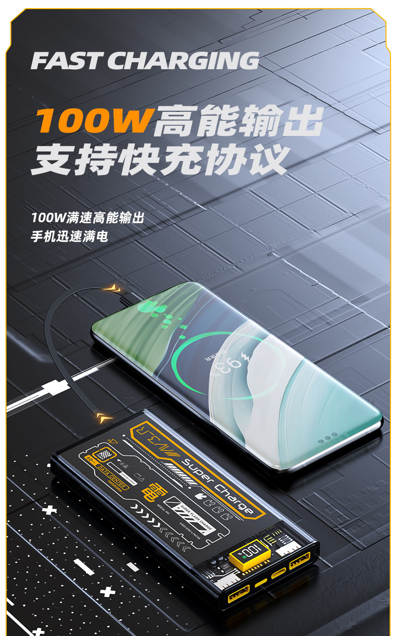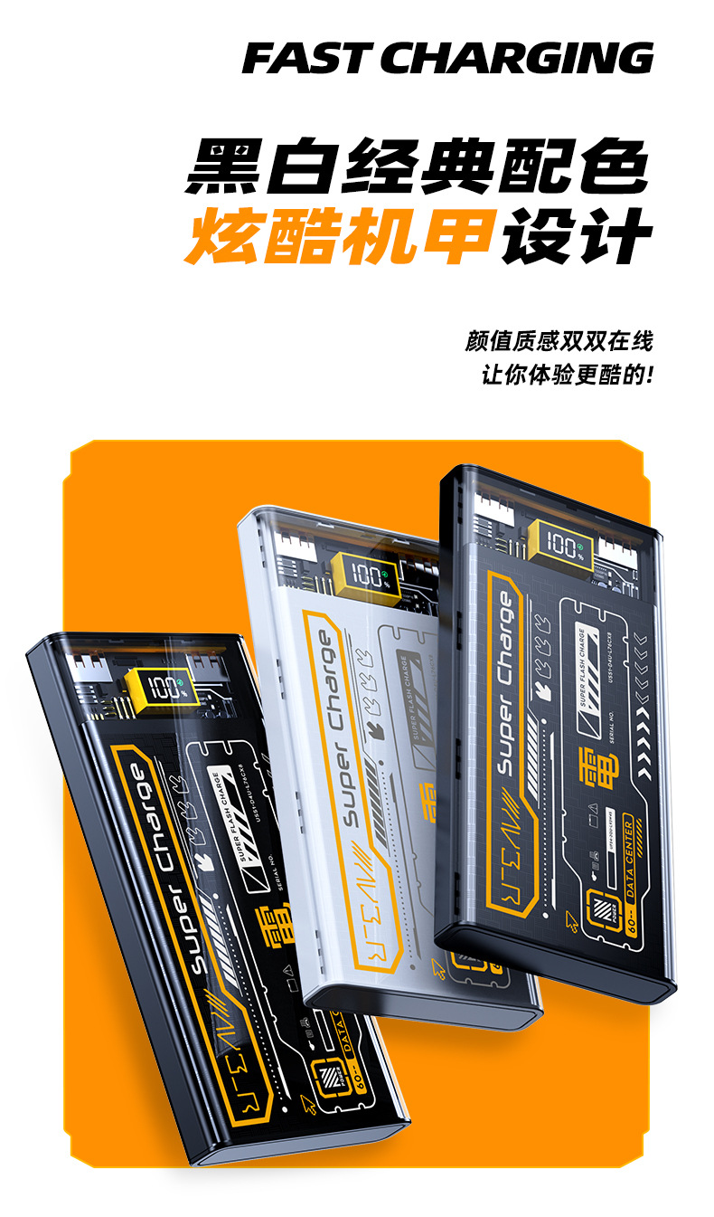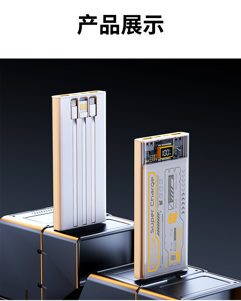 跨境 透明机甲风22.5W超级快充移动电源自带线20000毫安充电宝