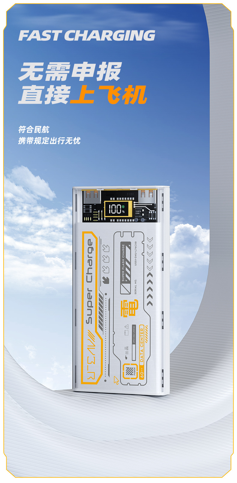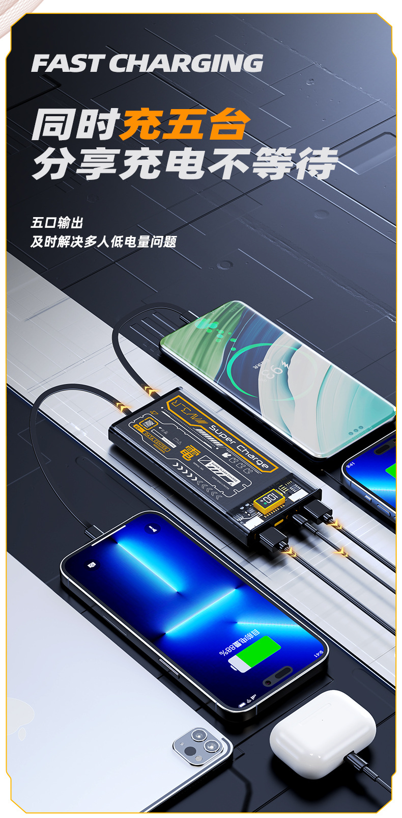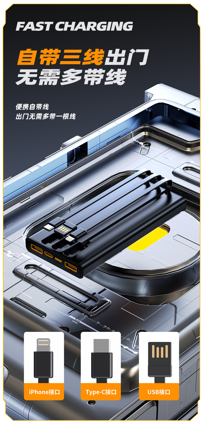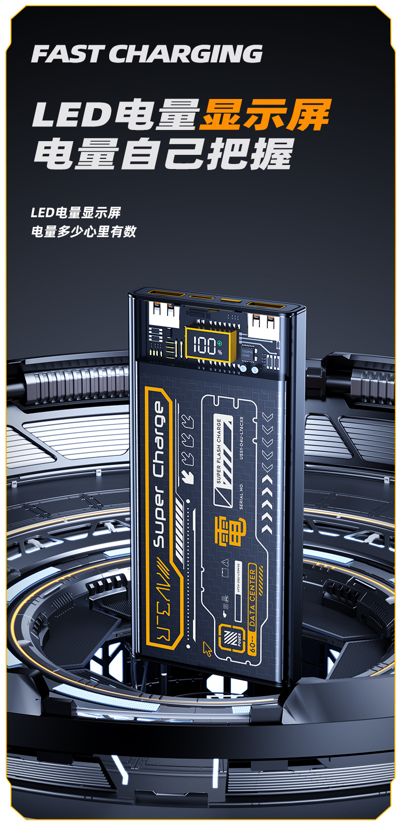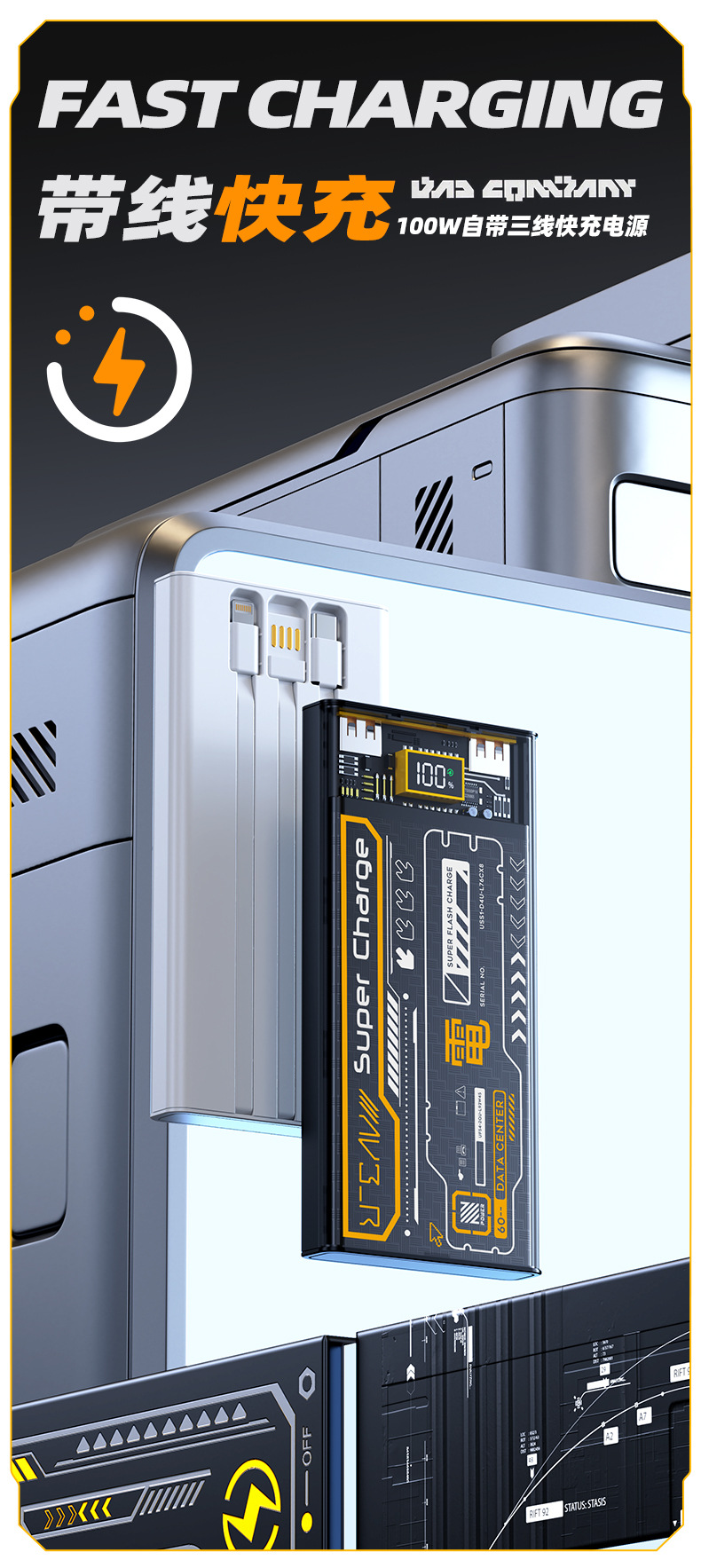 跨境 透明机甲风22.5W超级快充移动电源自带线20000毫安充电宝
