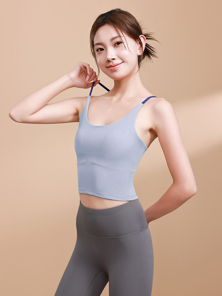 新款拼色细肩吊带瑜伽文胸亲肤裸感健身背心高弹防震聚拢运动内衣