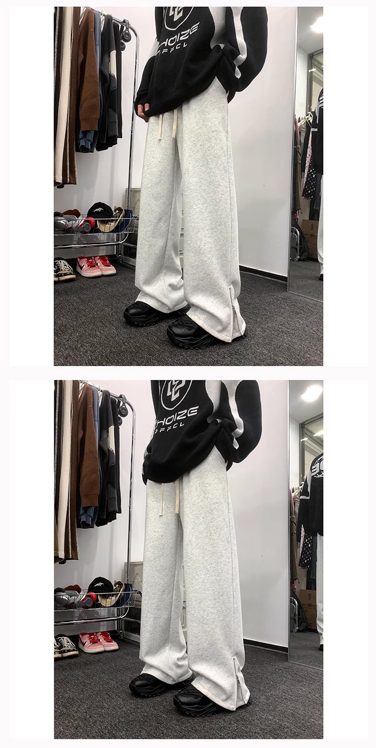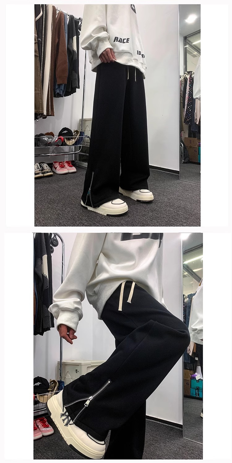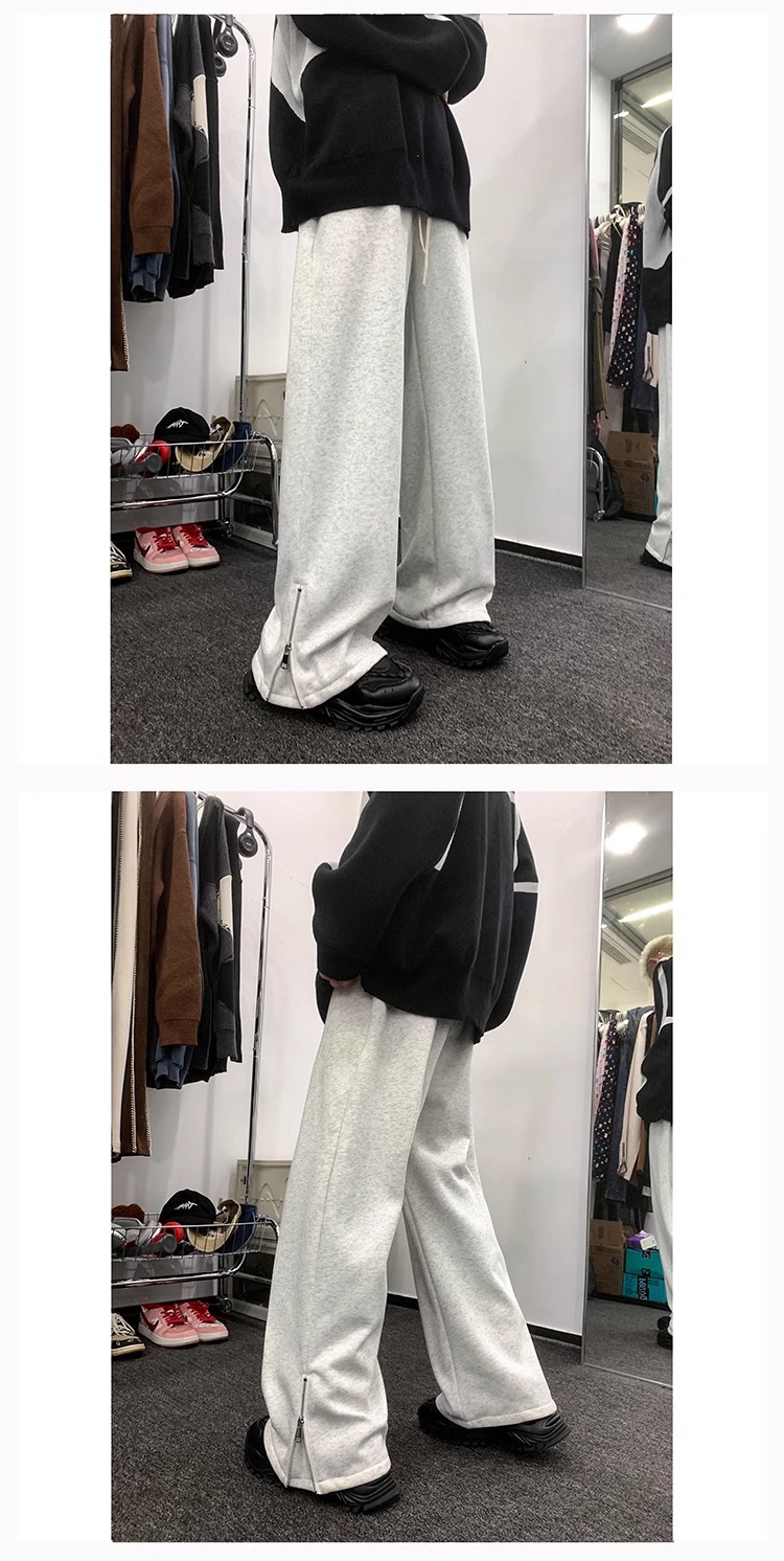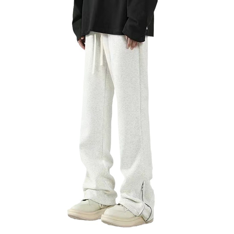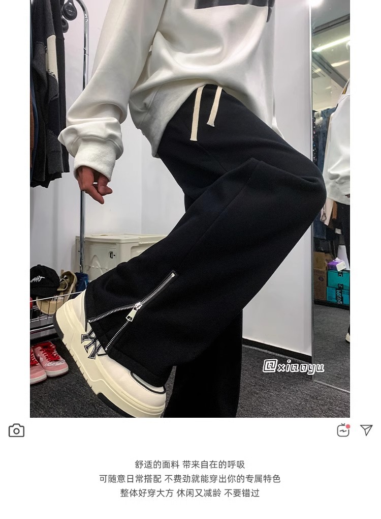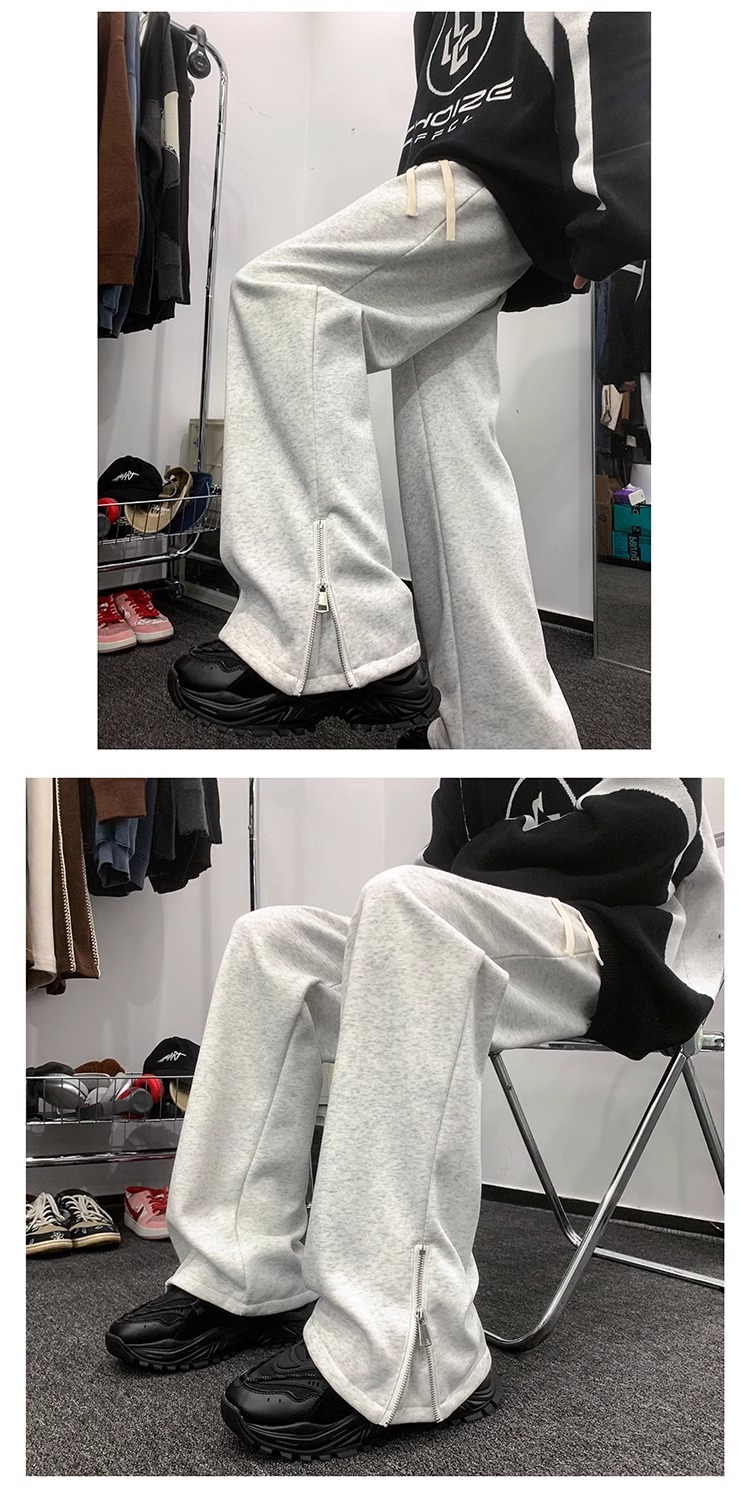 美式潮牌拉链休闲灰色卫裤男款高街vibe风直筒运动阔腿微喇裤子男