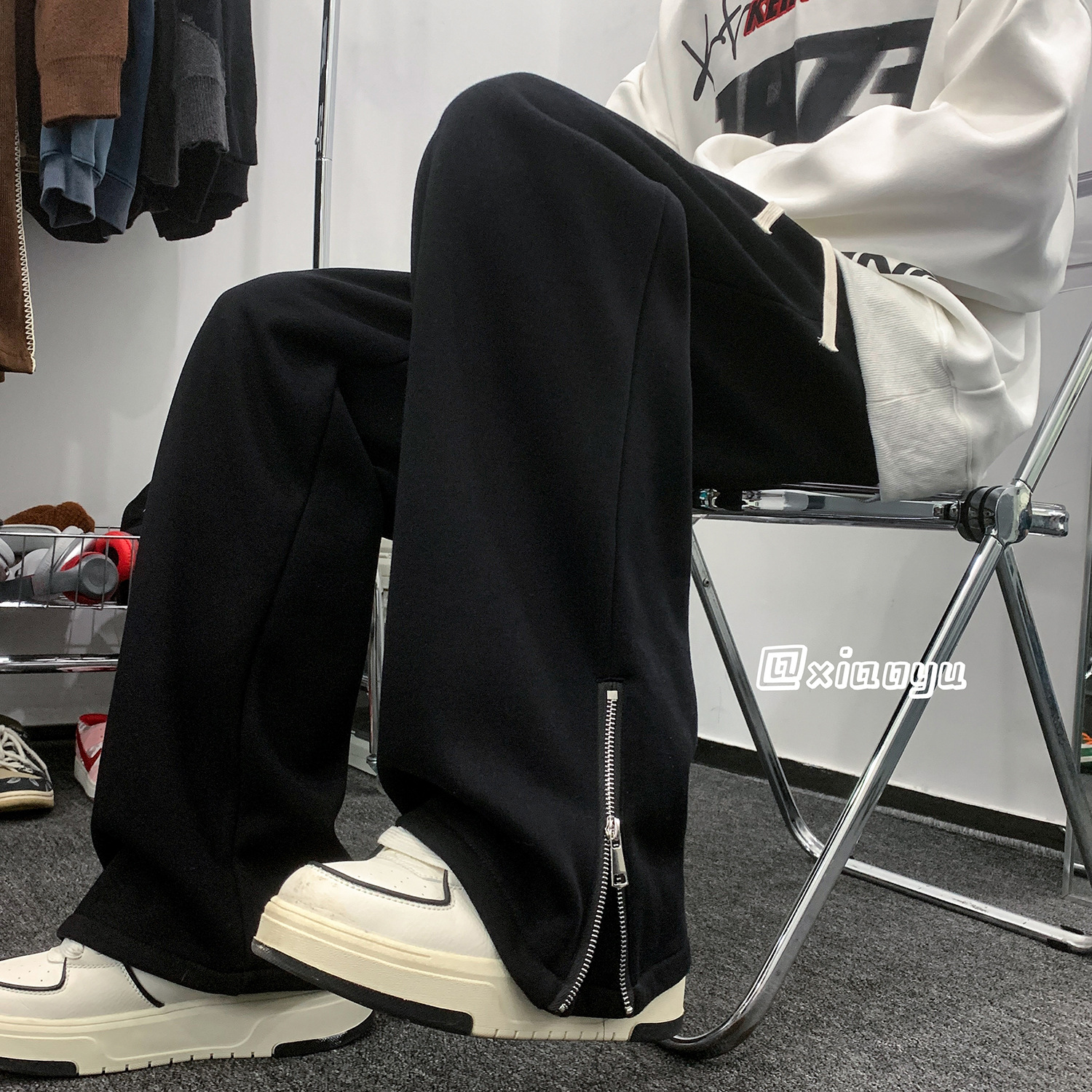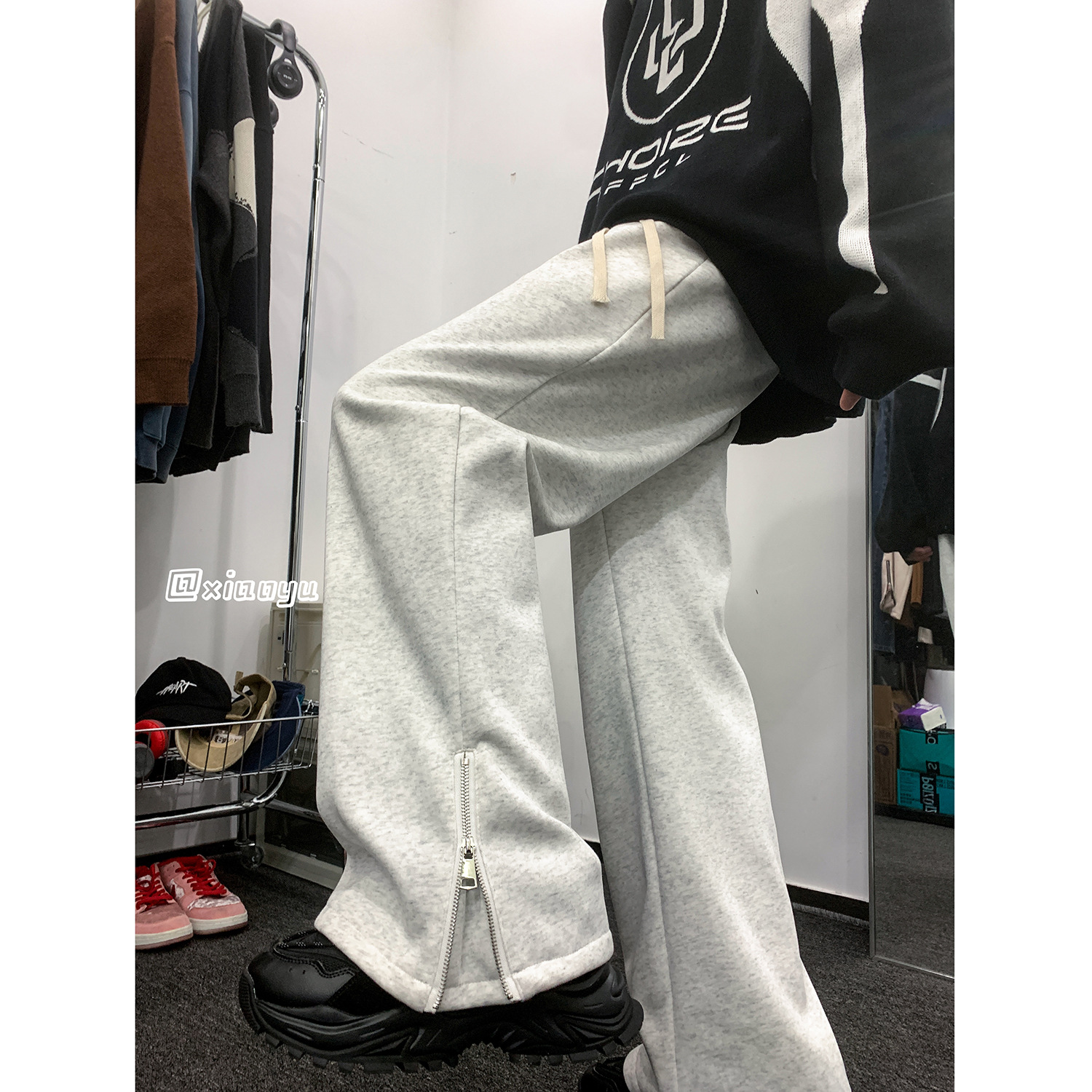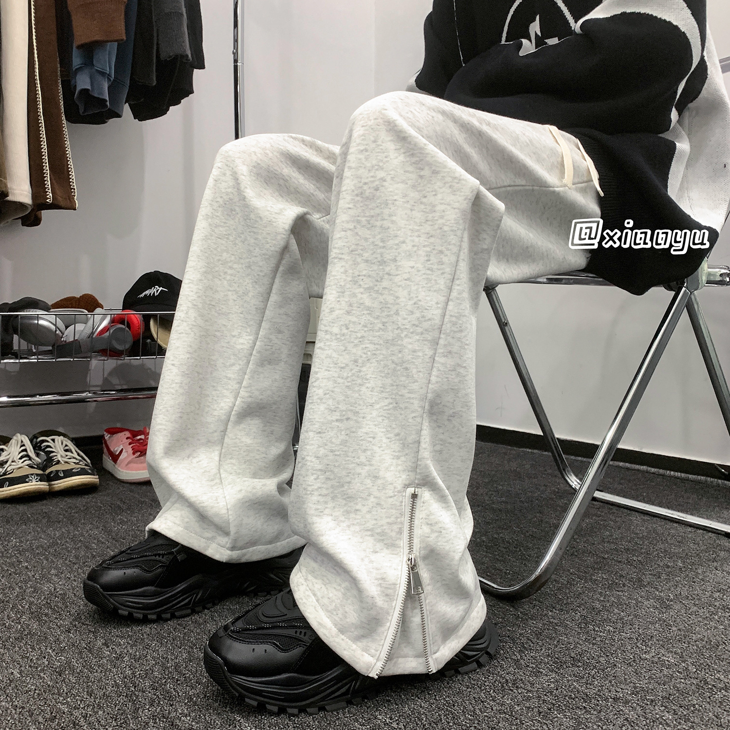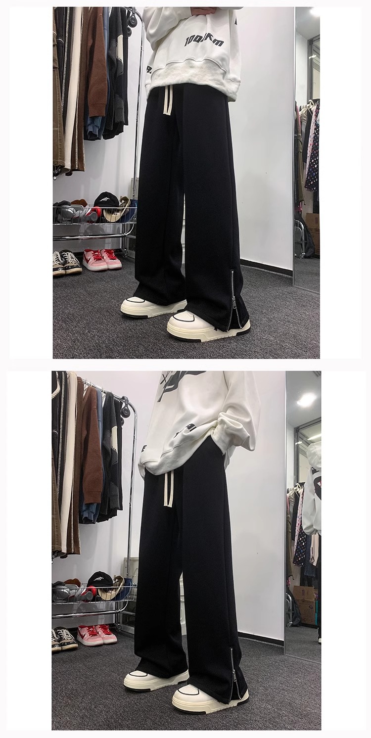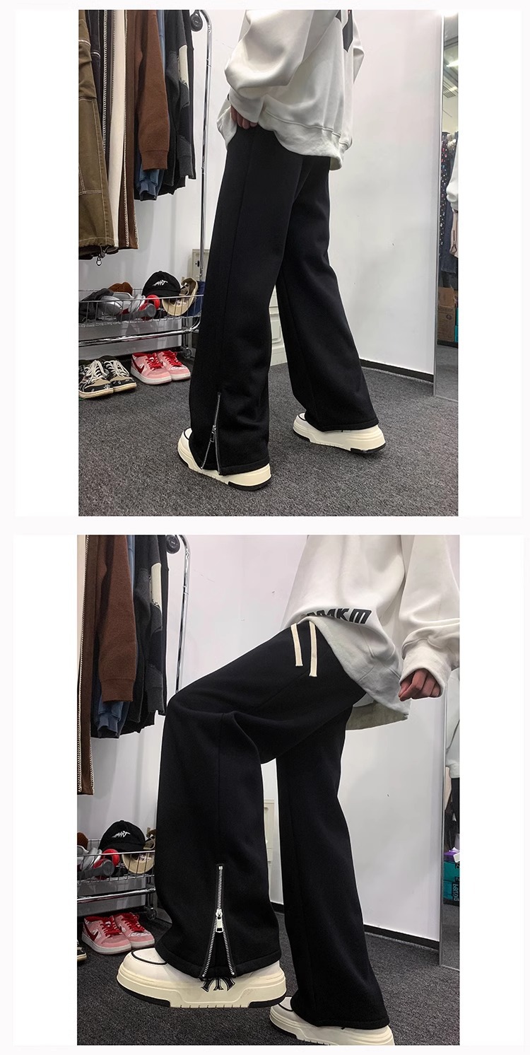 美式潮牌拉链休闲灰色卫裤男款高街vibe风直筒运动阔腿微喇裤子男