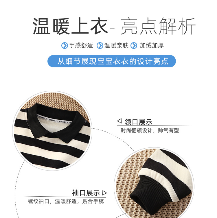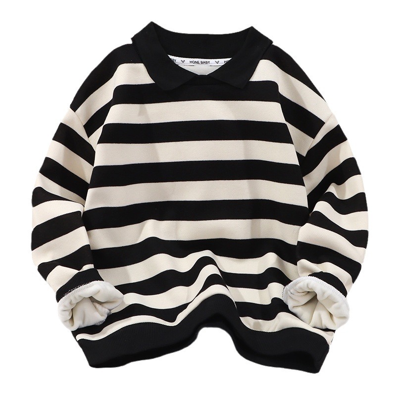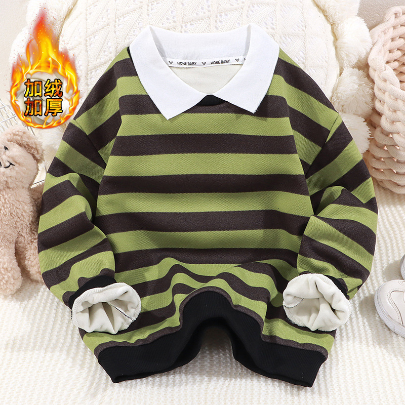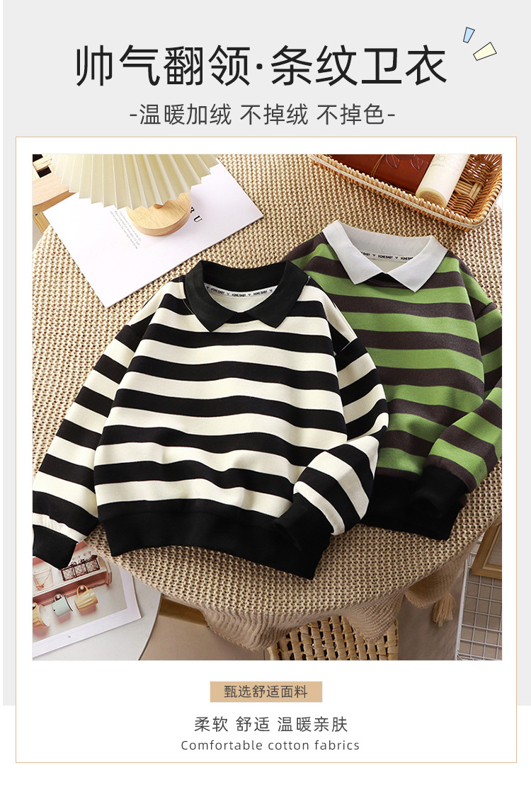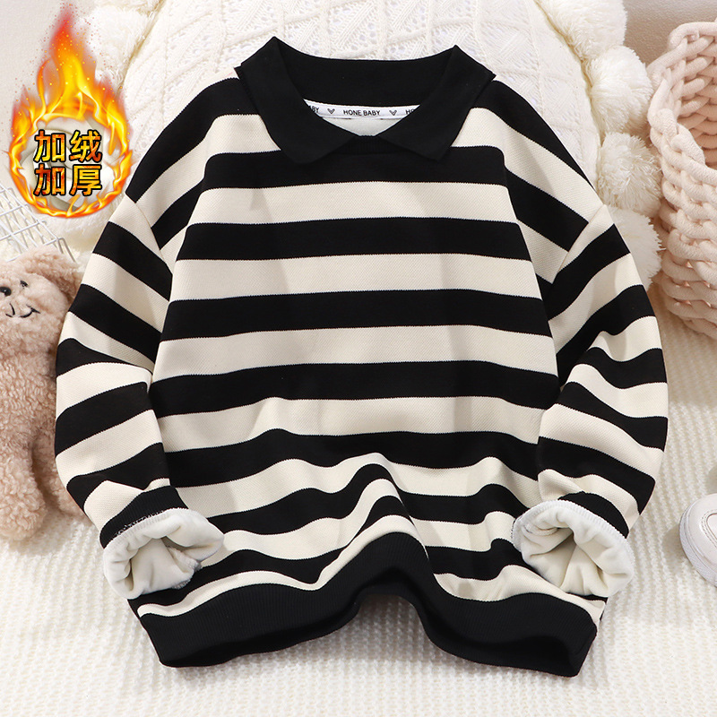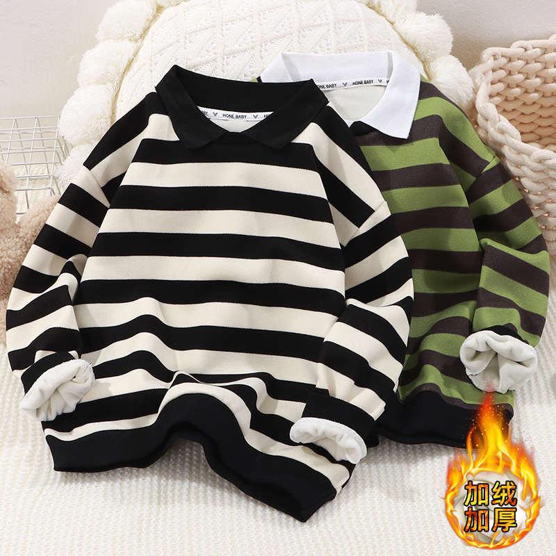 秋冬季新款儿童加绒卫衣男童翻领polo衫条纹卫衣时尚保暖童装上衣