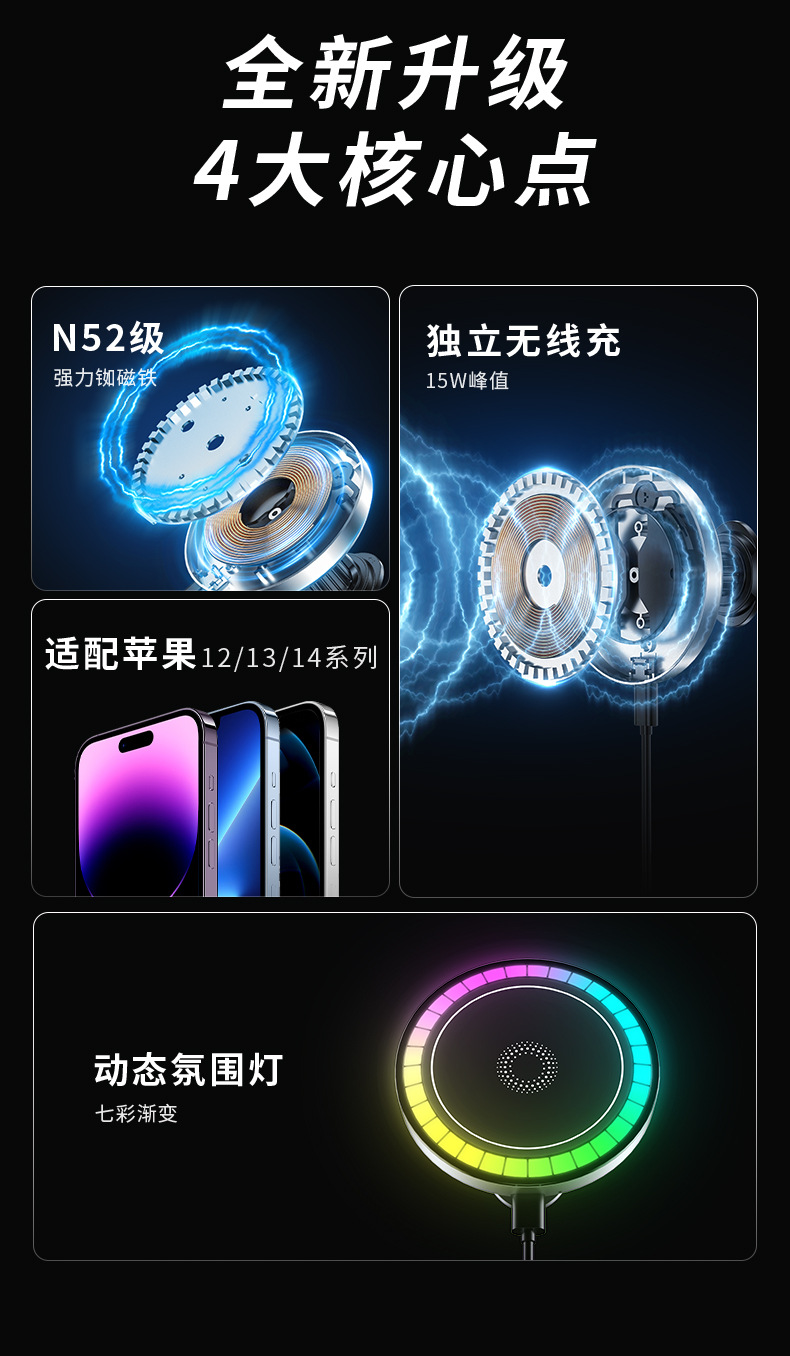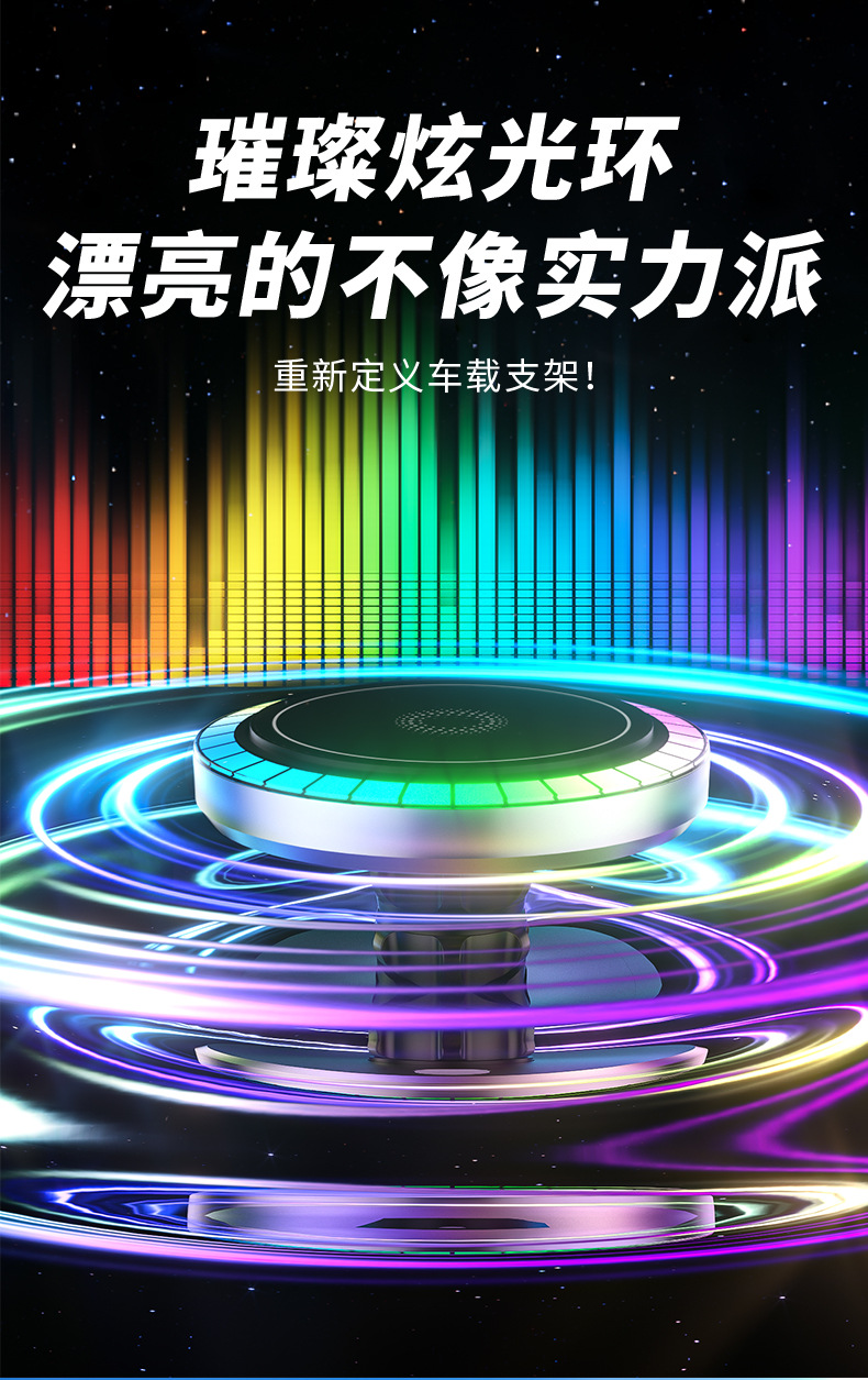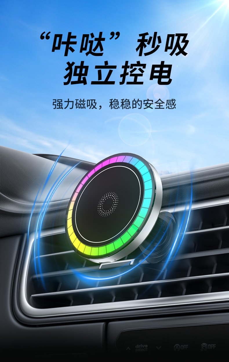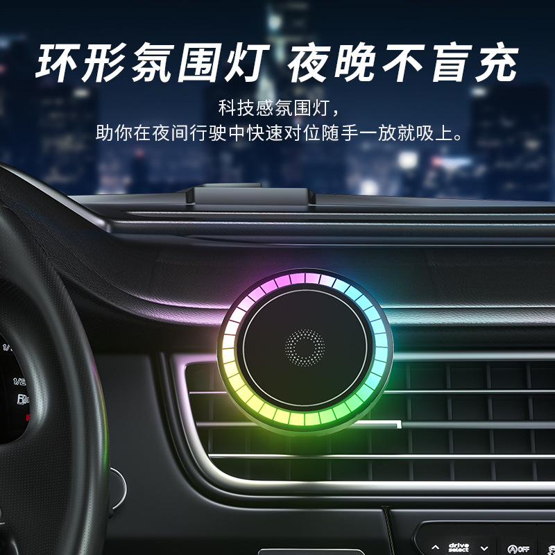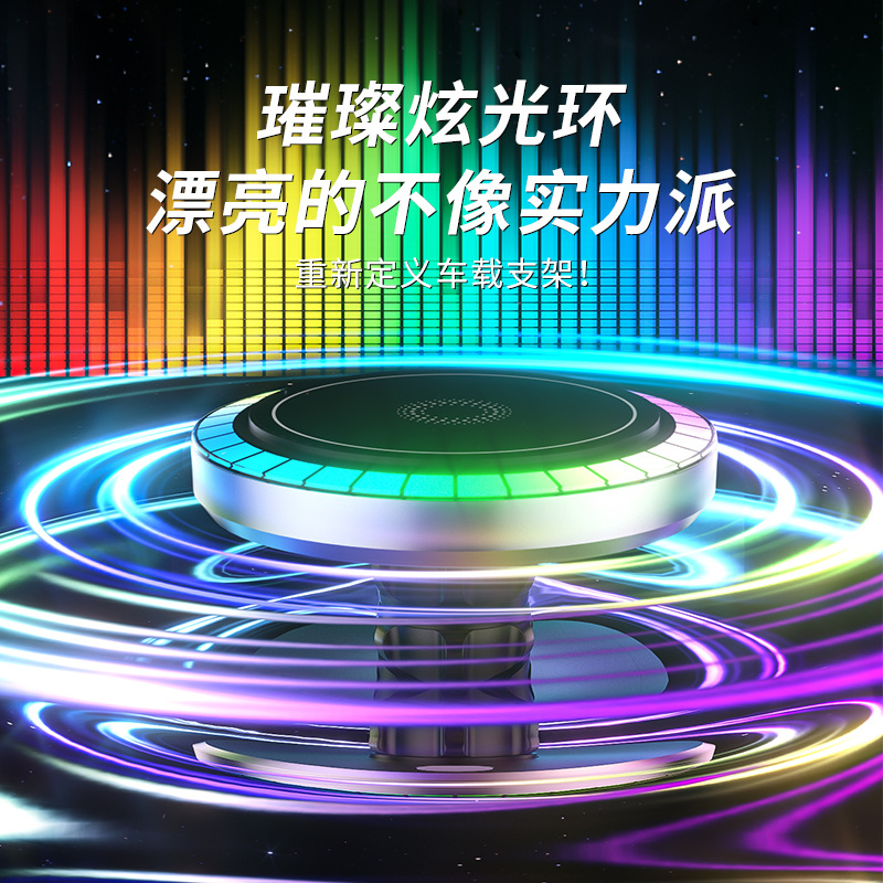 汽车用品无线充磁吸车载手机支架七彩声音律动快充出风口