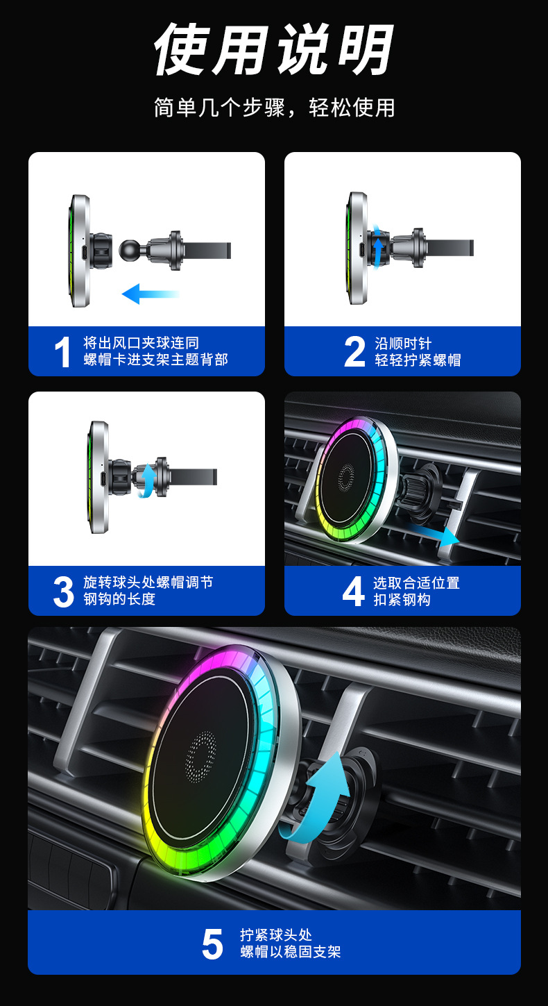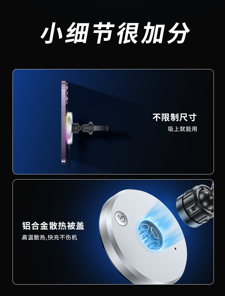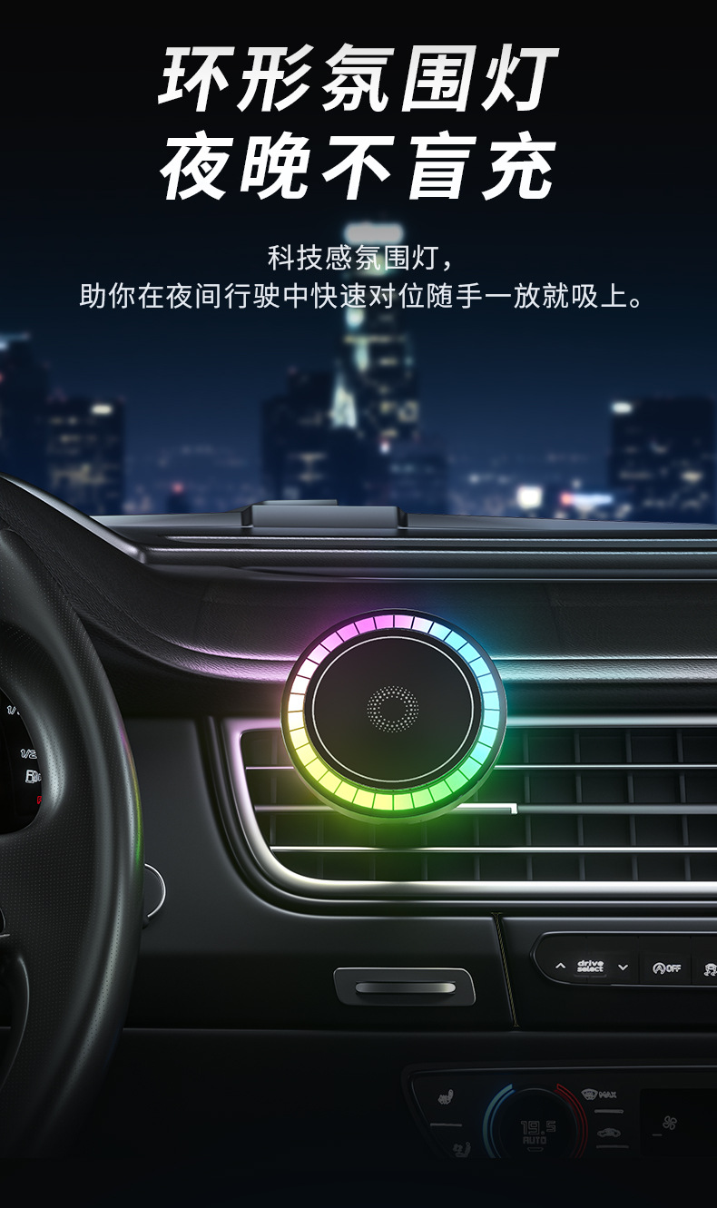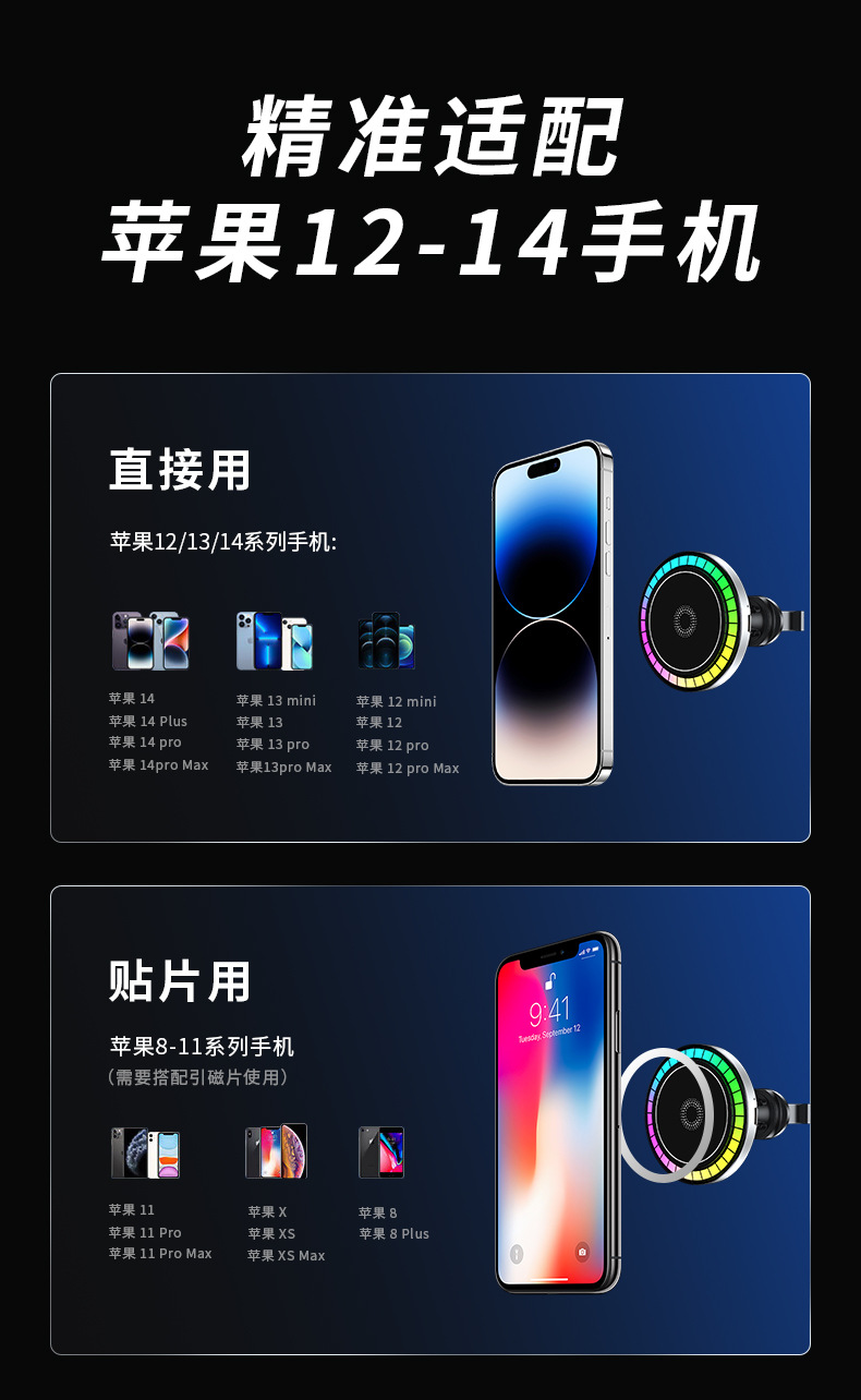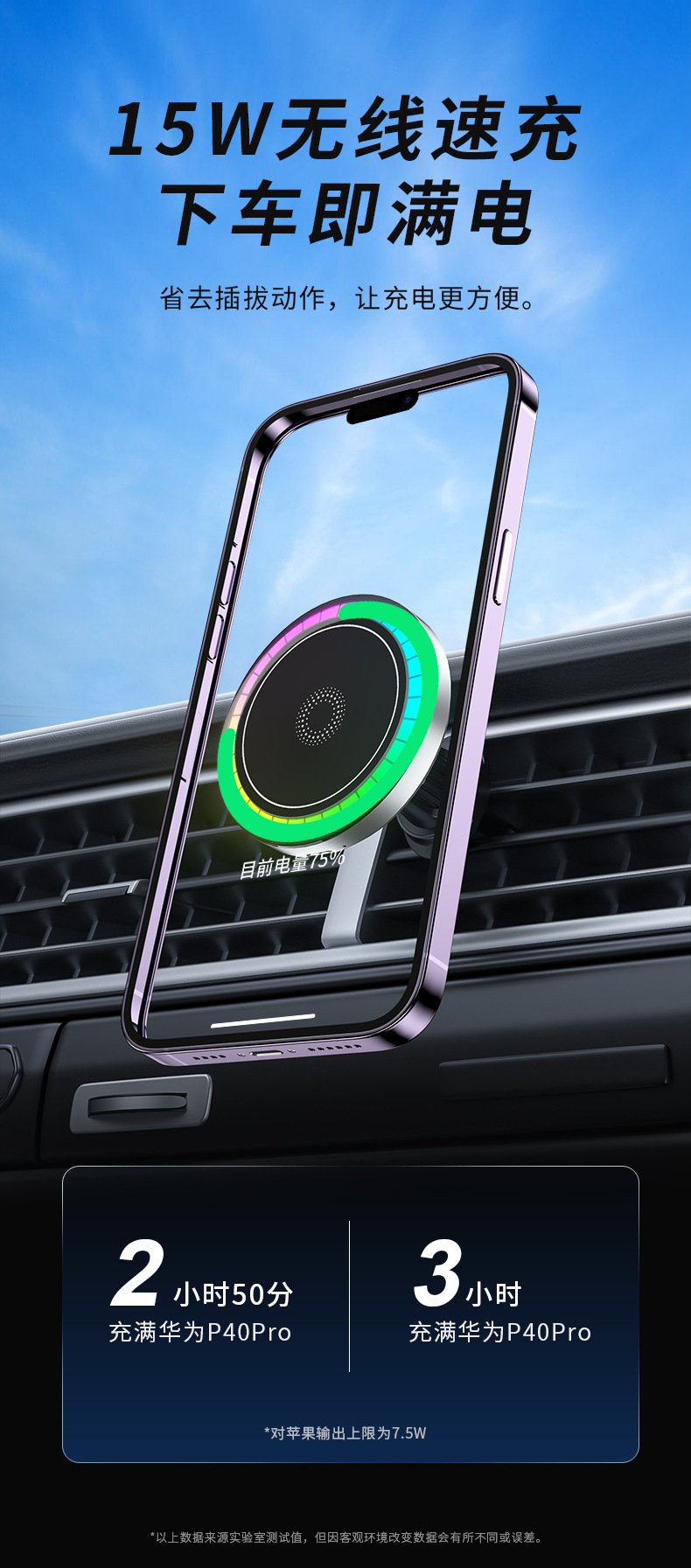 汽车用品无线充磁吸车载手机支架七彩声音律动快充出风口