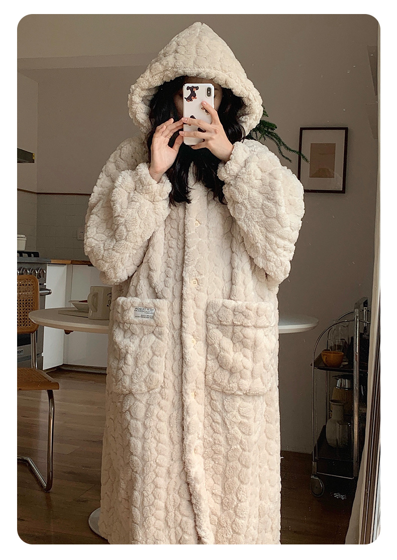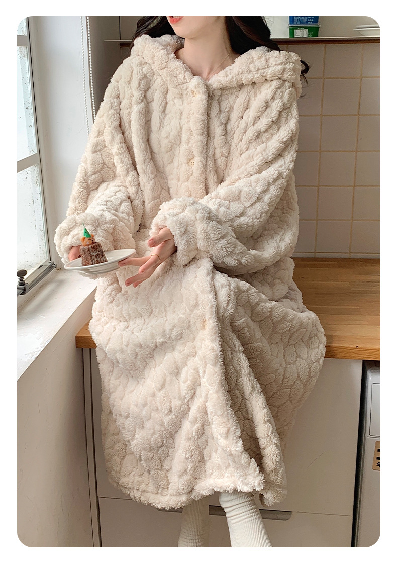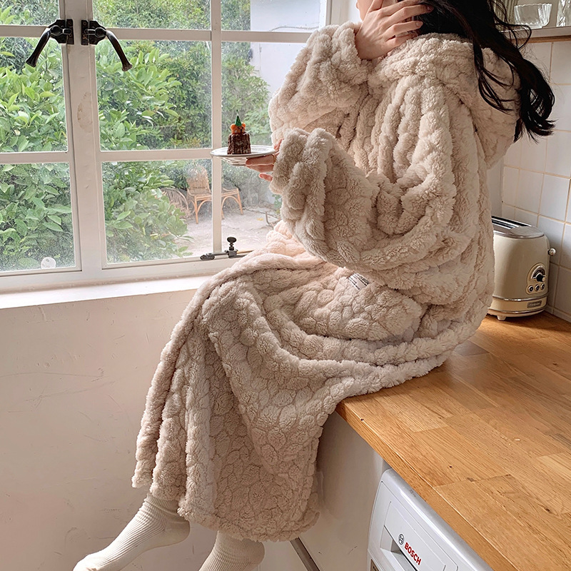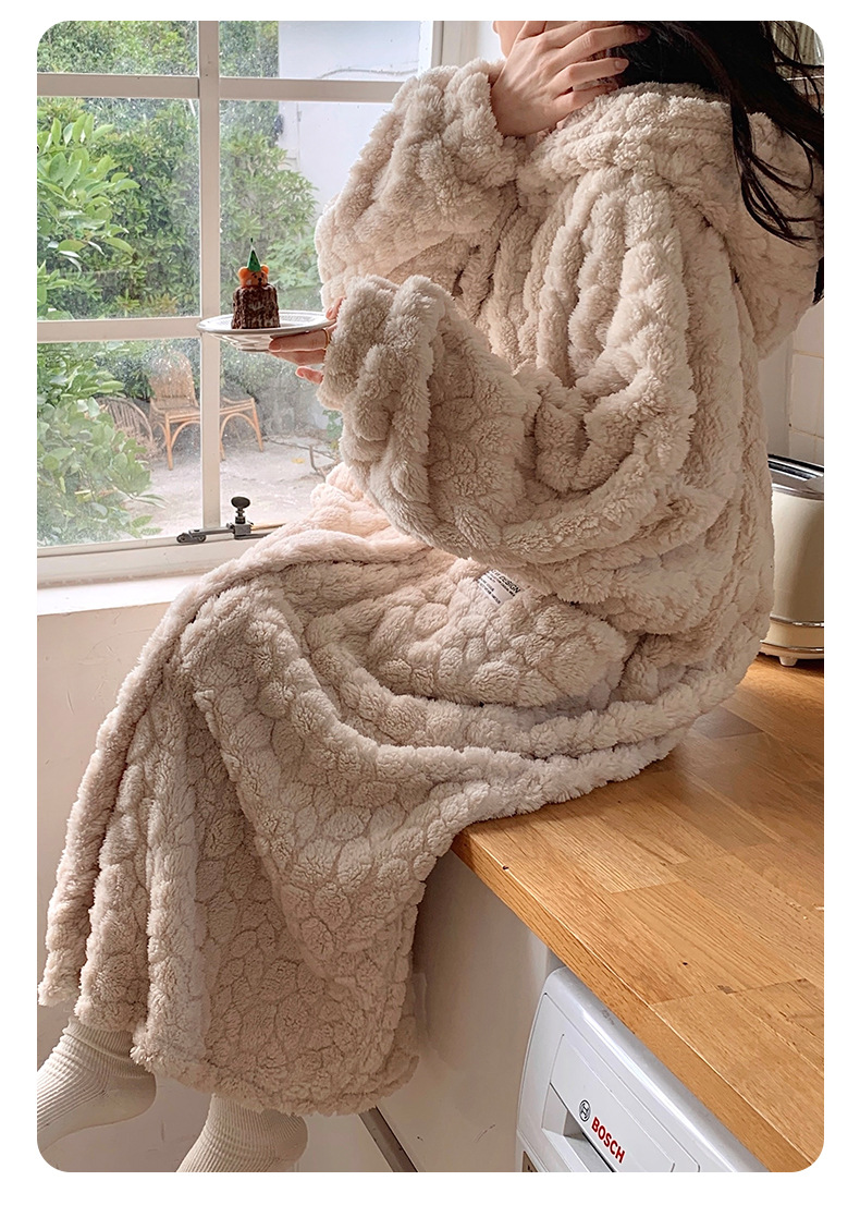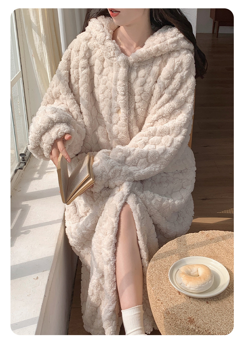 人气慵懒风睡袍女法兰绒开衫连帽睡衣长袍冬季宽松舒适珊瑚绒睡袍