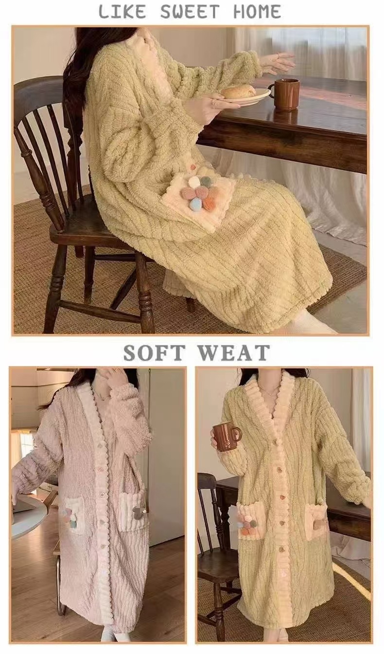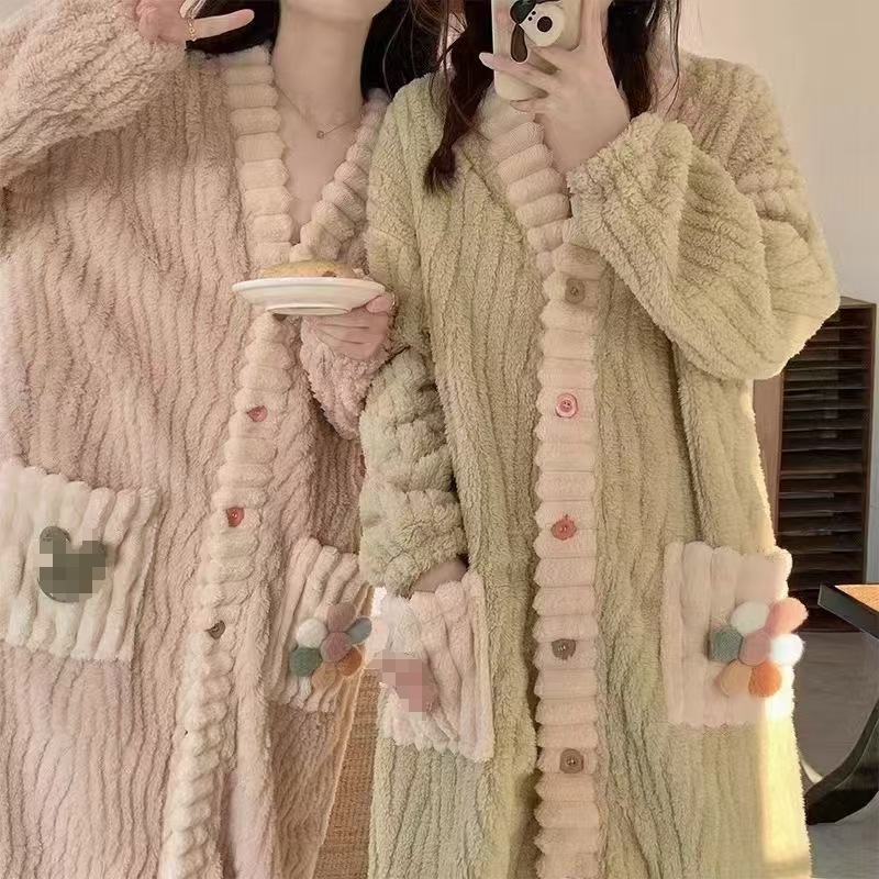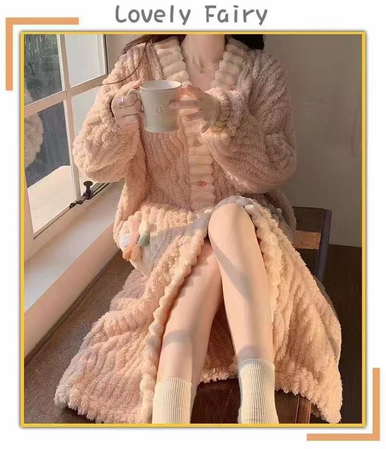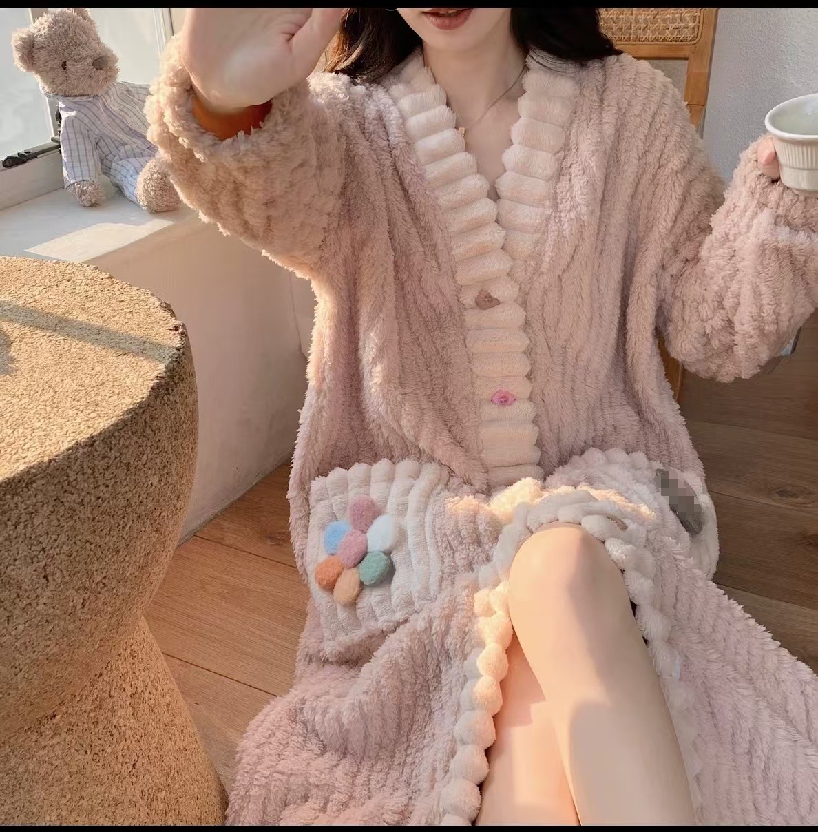 法兰绒睡袍女秋冬加厚彩虹开衫套装长款大码珊瑚绒保暖家居服睡裙