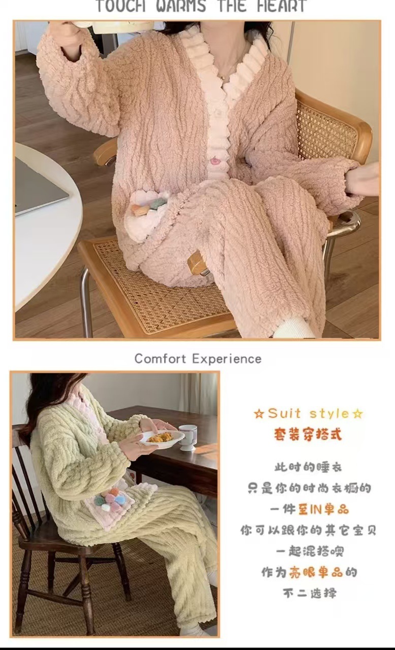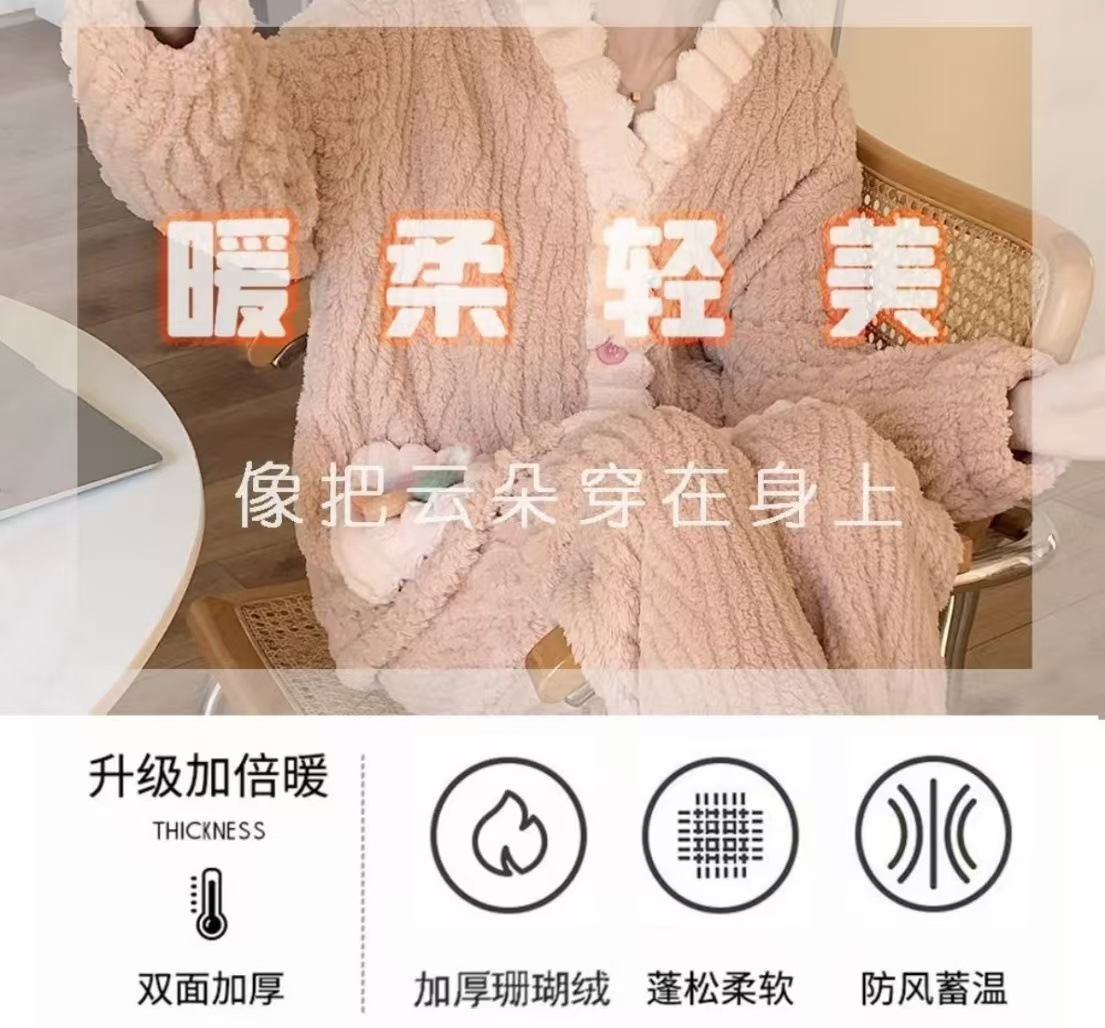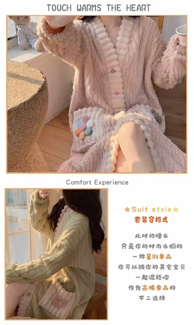 法兰绒睡袍女秋冬加厚彩虹开衫套装长款大码珊瑚绒保暖家居服睡裙