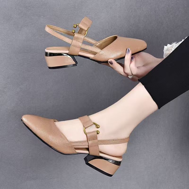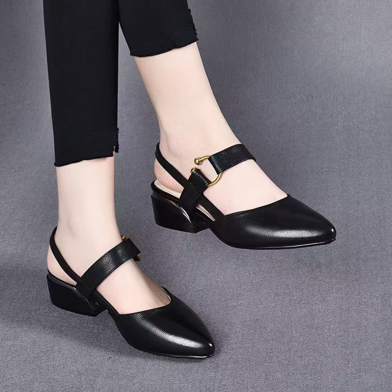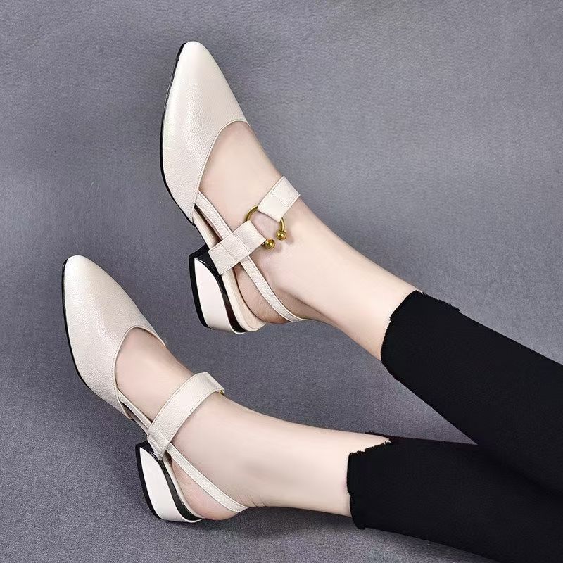 PLOVER高跟真皮凉鞋女包头新款法式中跟粗跟女鞋尖头一字扣女凉鞋