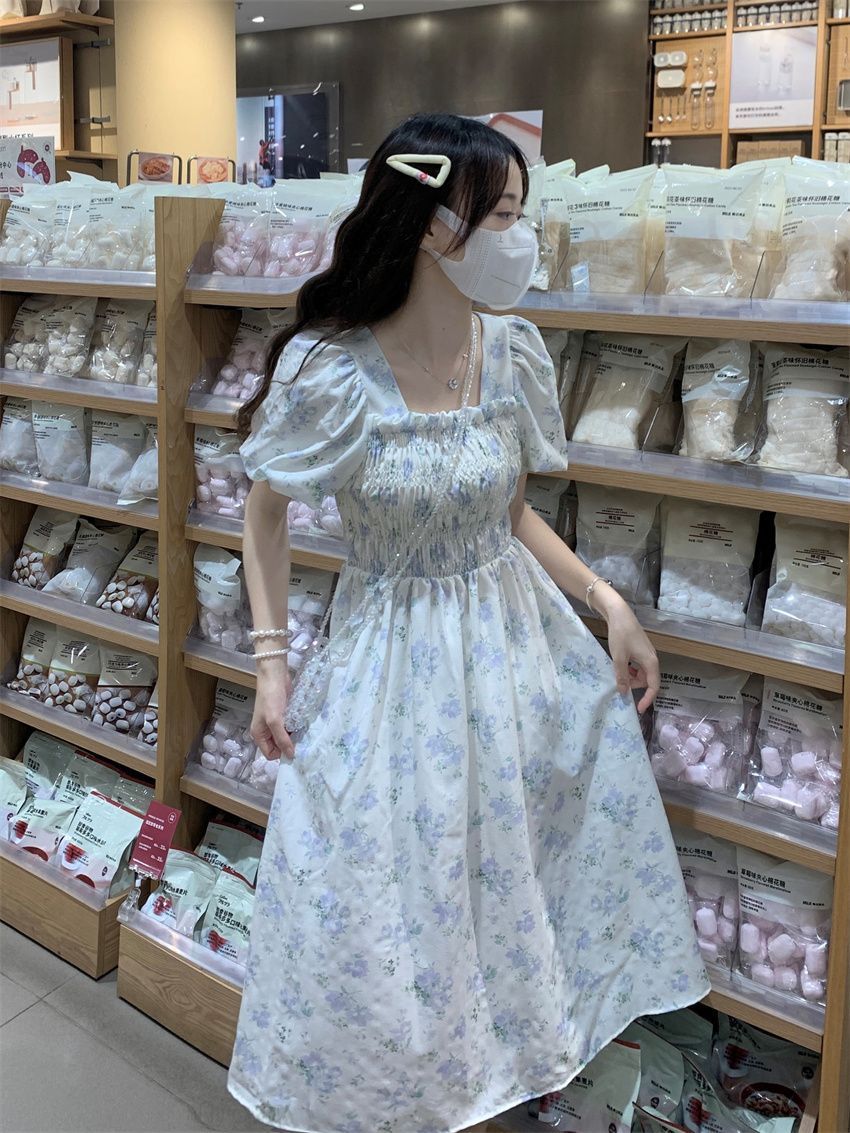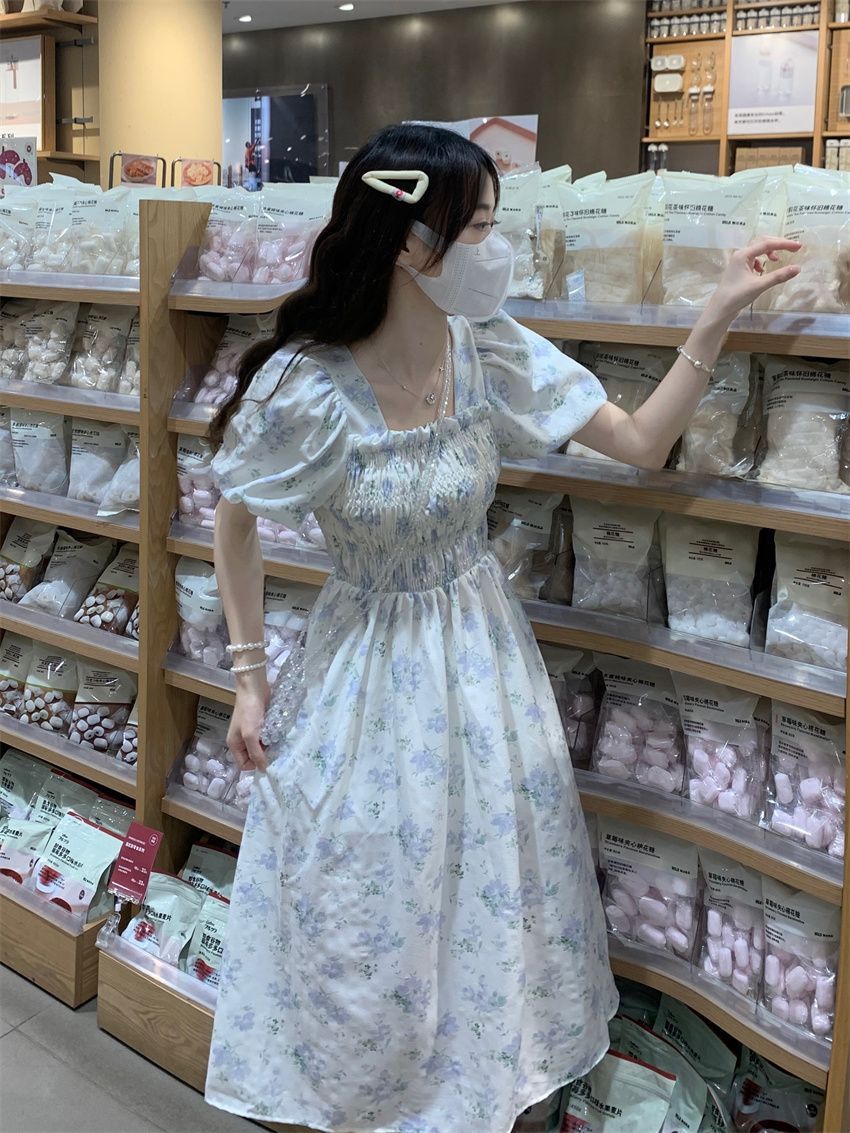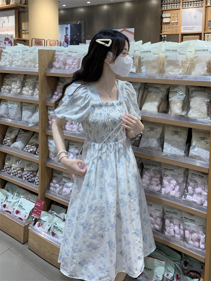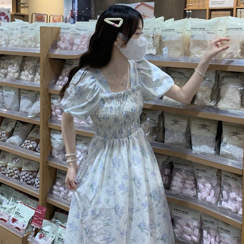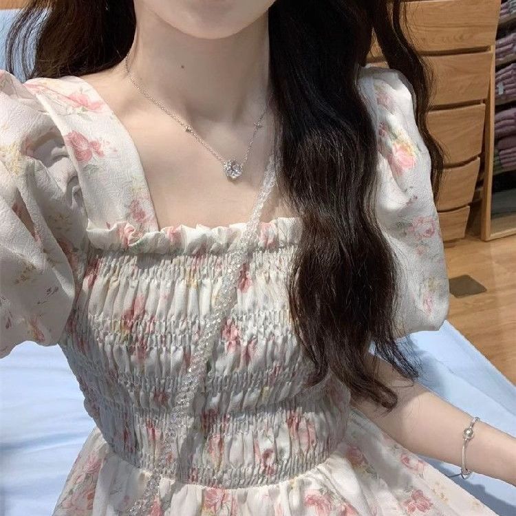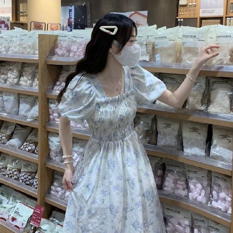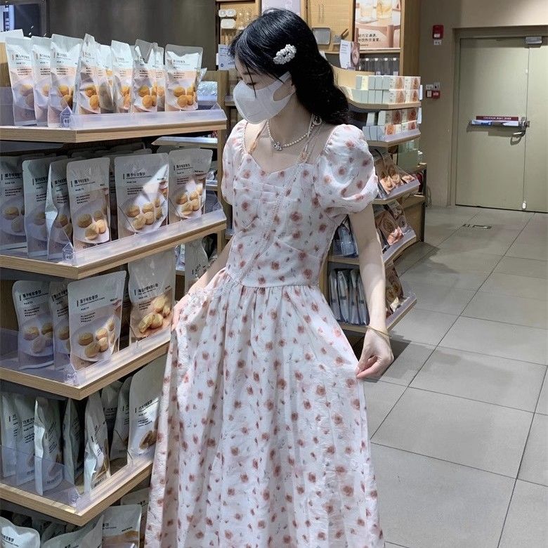 法式方领碎花连衣裙女2024夏季新款小个子气质收腰泡泡袖仙女长裙