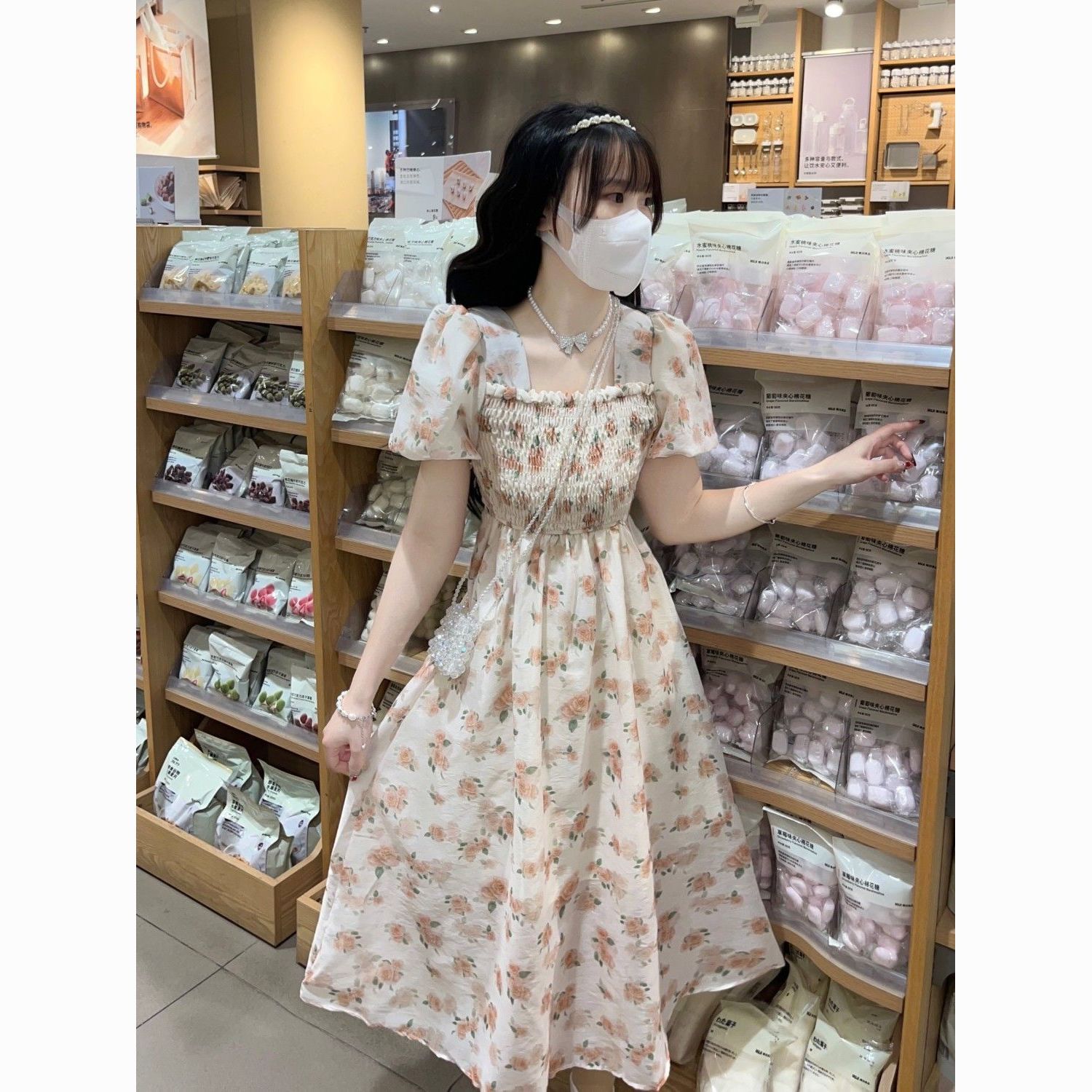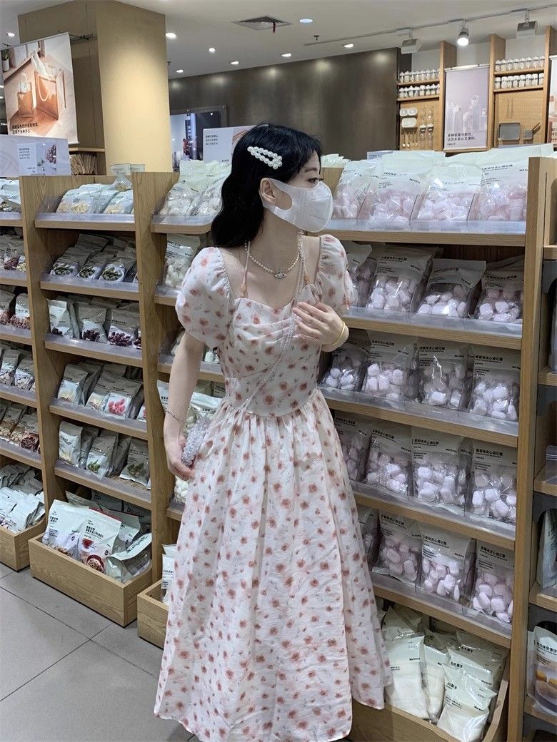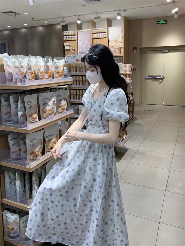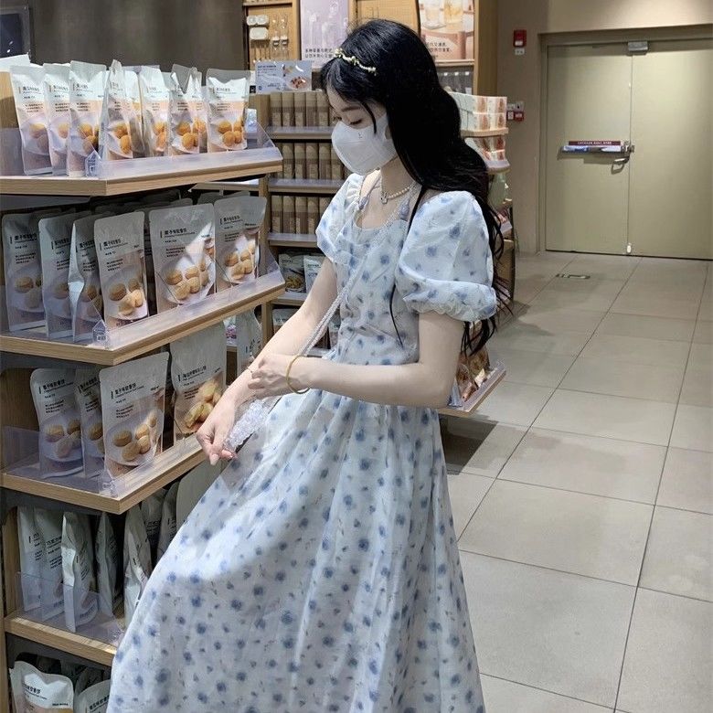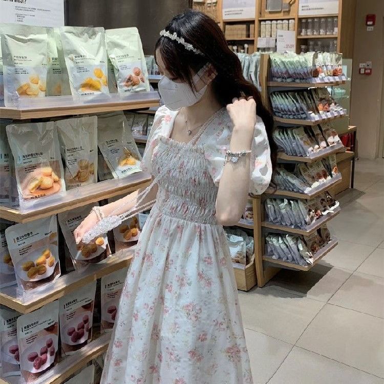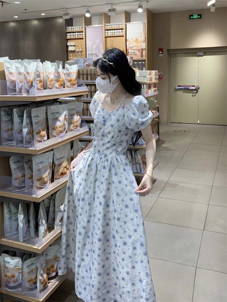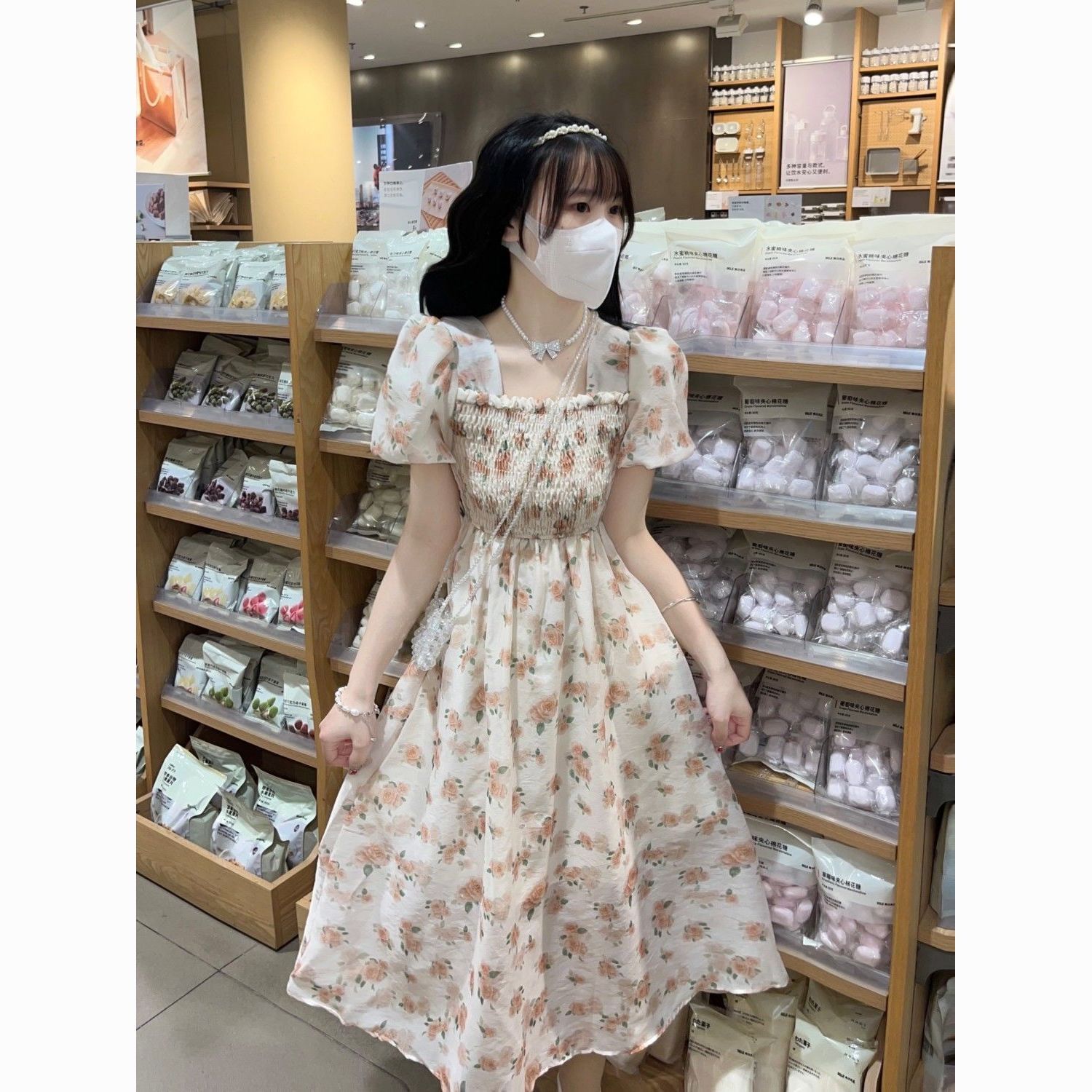 法式方领碎花连衣裙女2024夏季新款小个子气质收腰泡泡袖仙女长裙