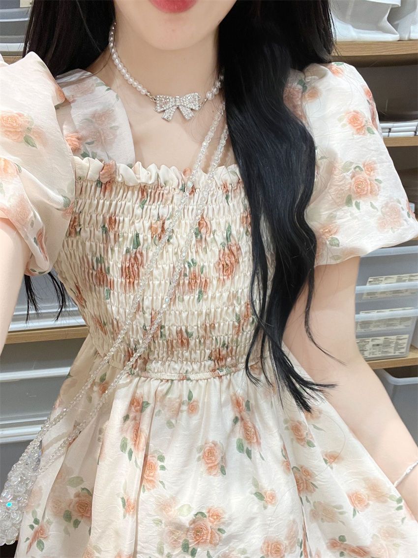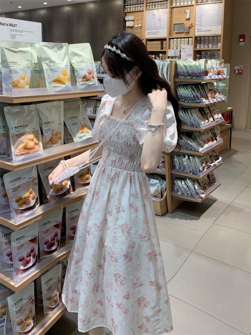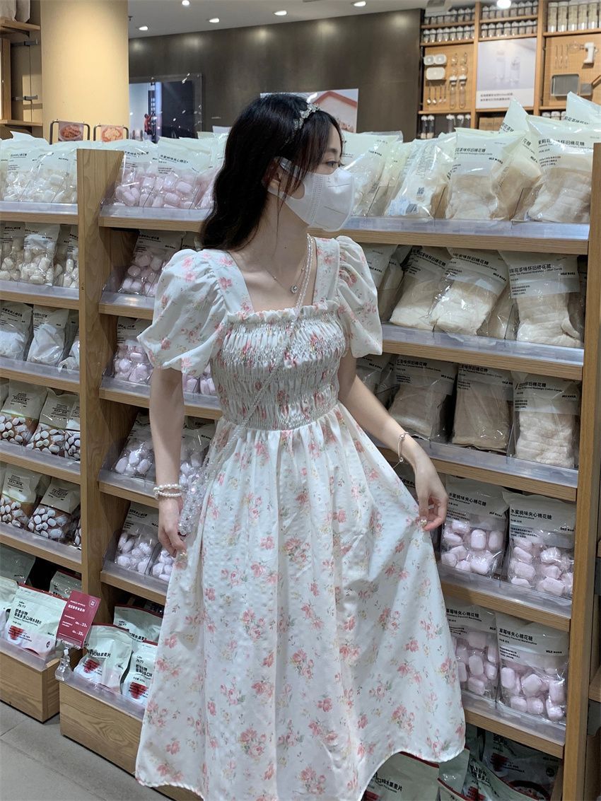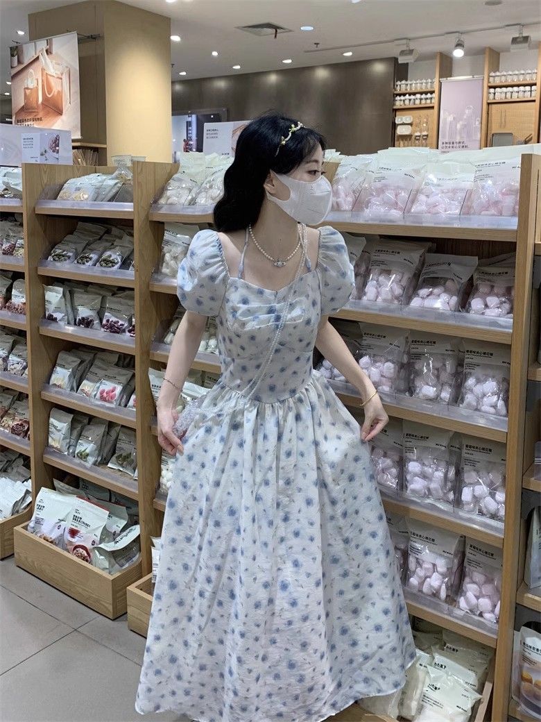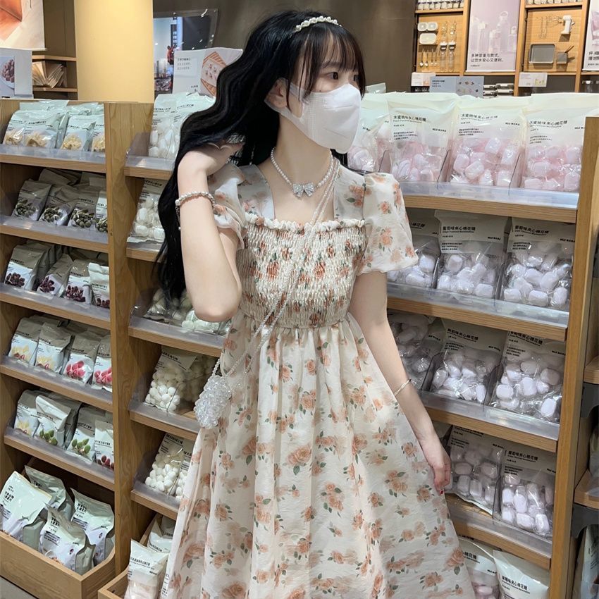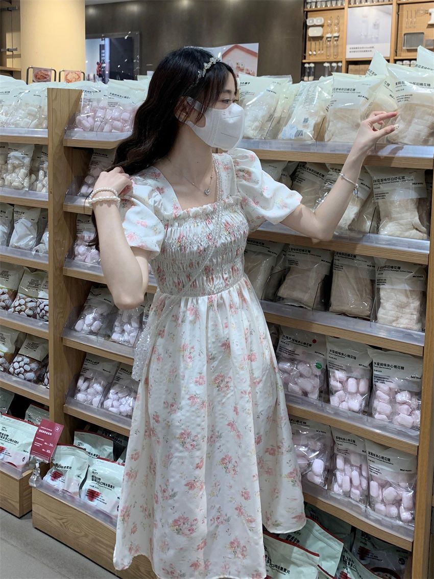 法式方领碎花连衣裙女2024夏季新款小个子气质收腰泡泡袖仙女长裙