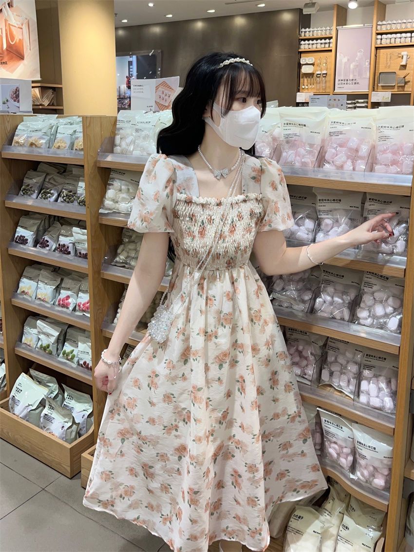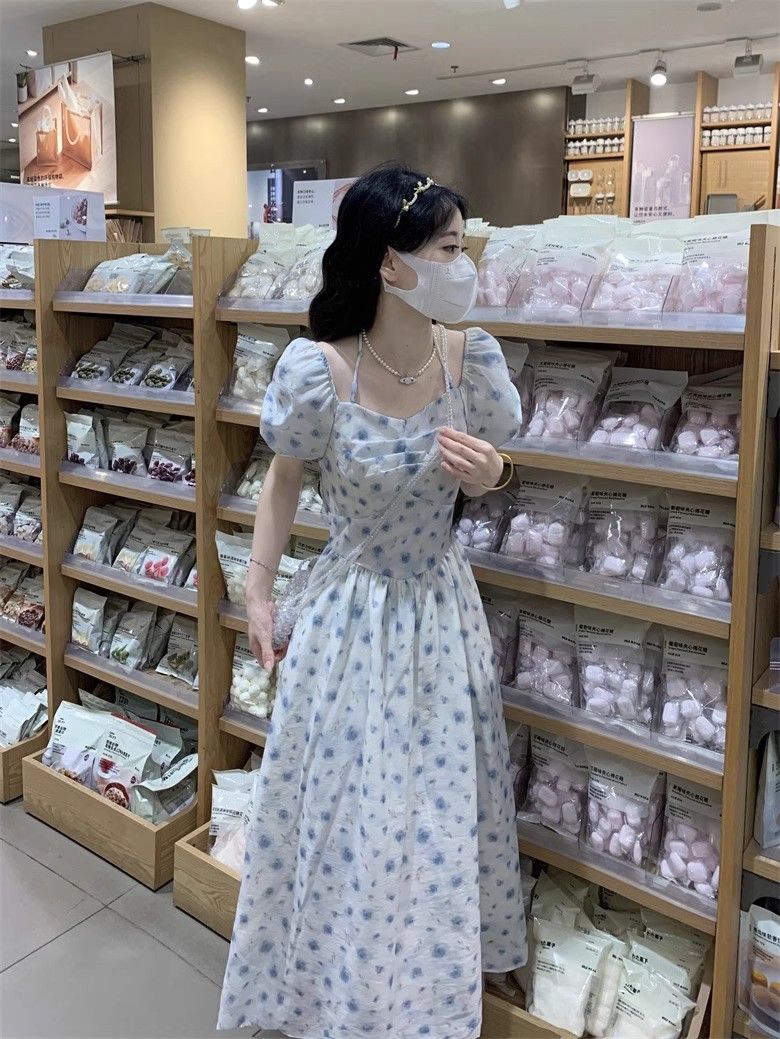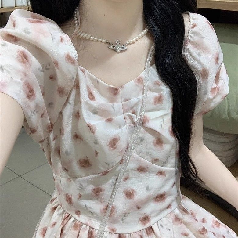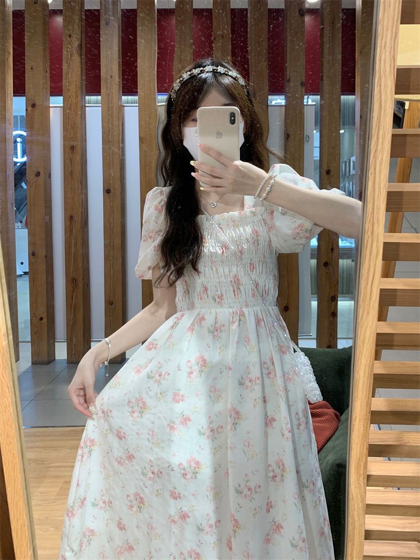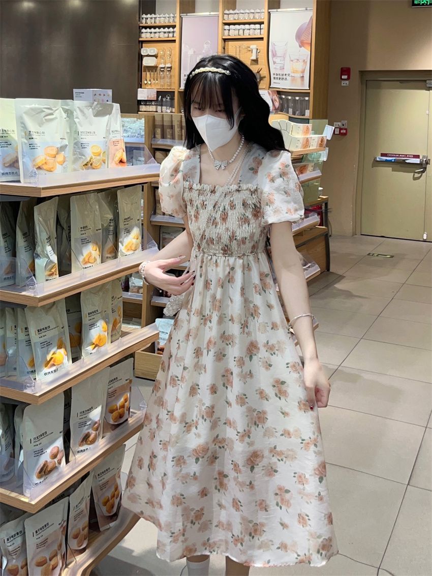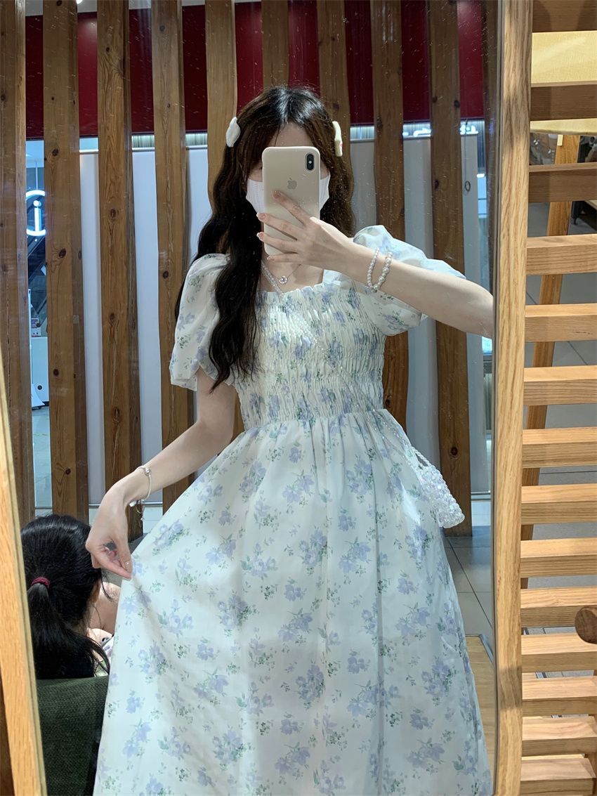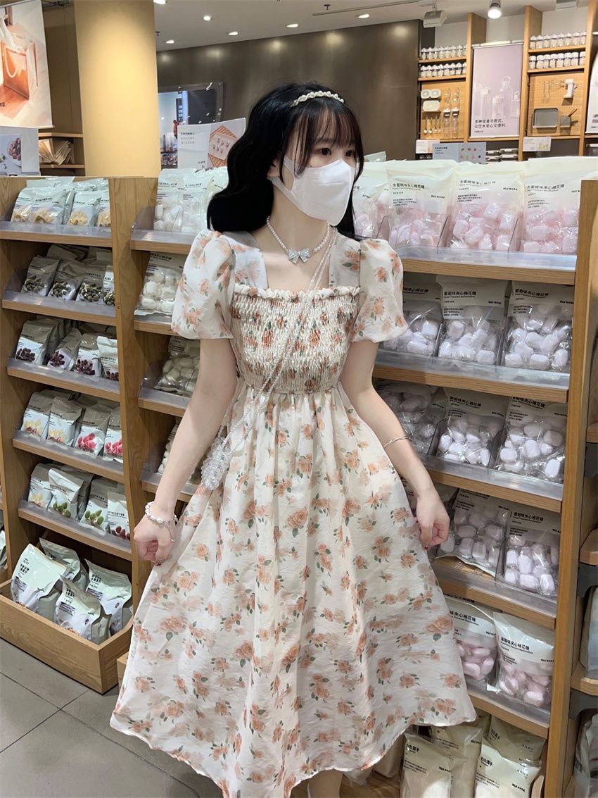法式方领碎花连衣裙女2024夏季新款小个子气质收腰泡泡袖仙女长裙
