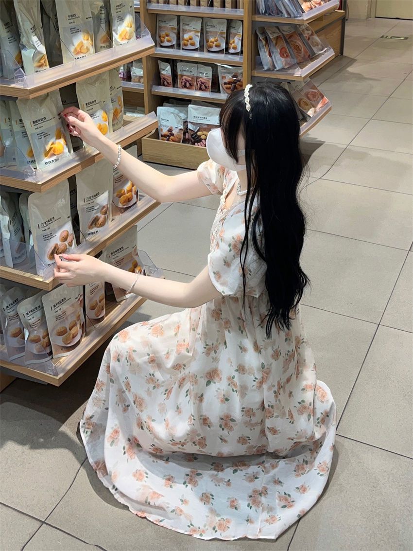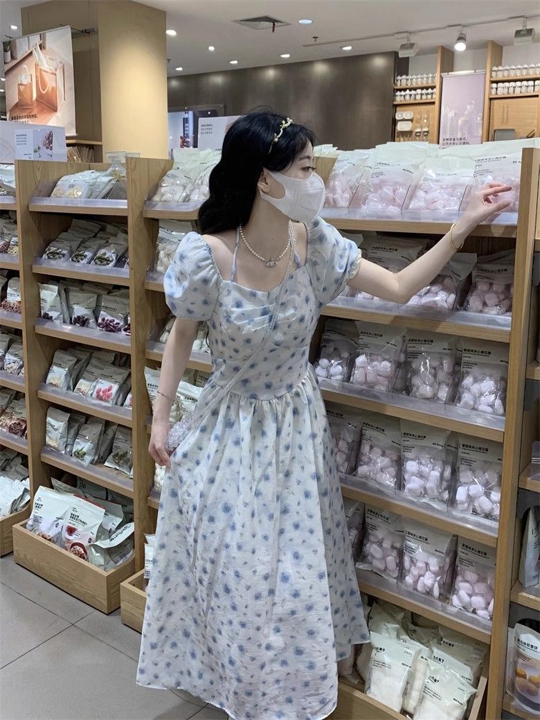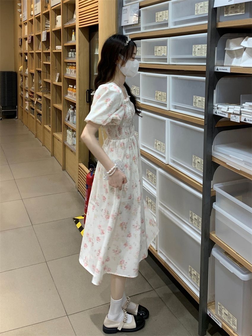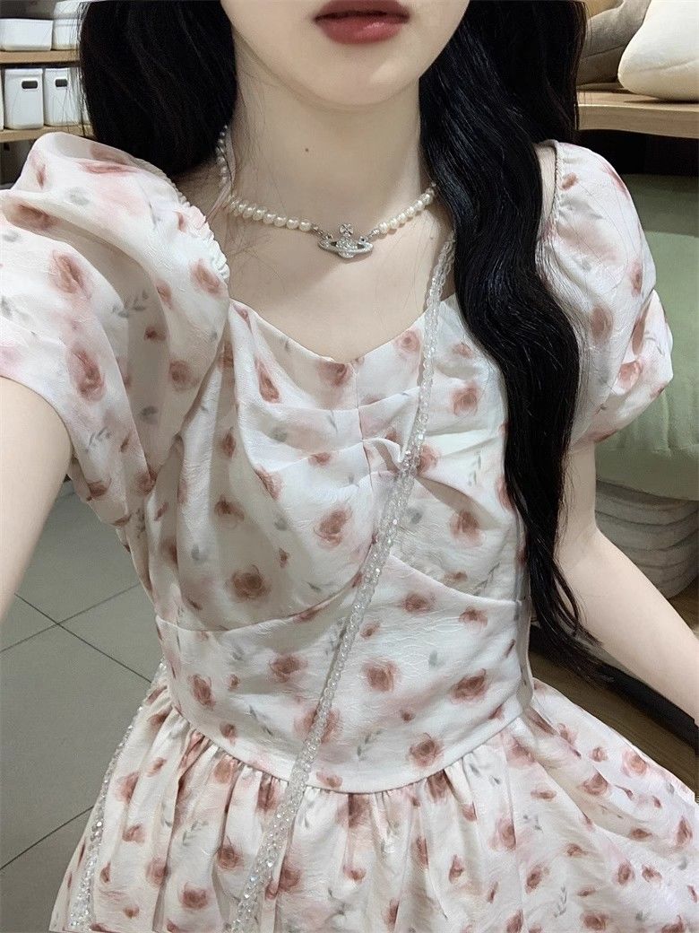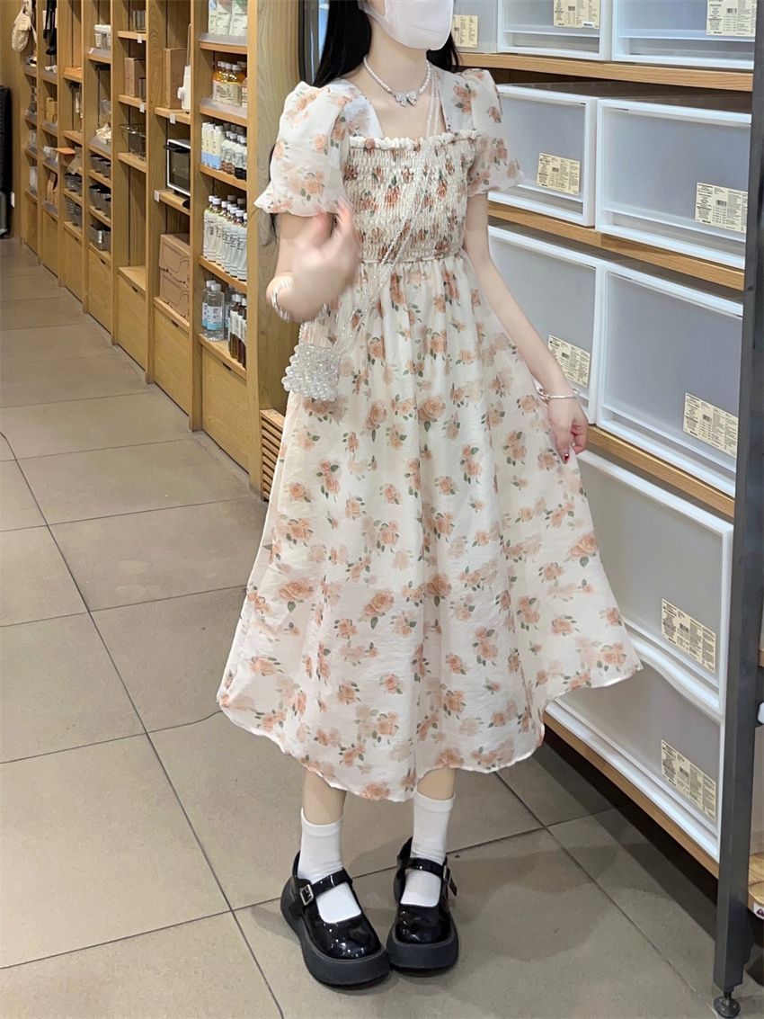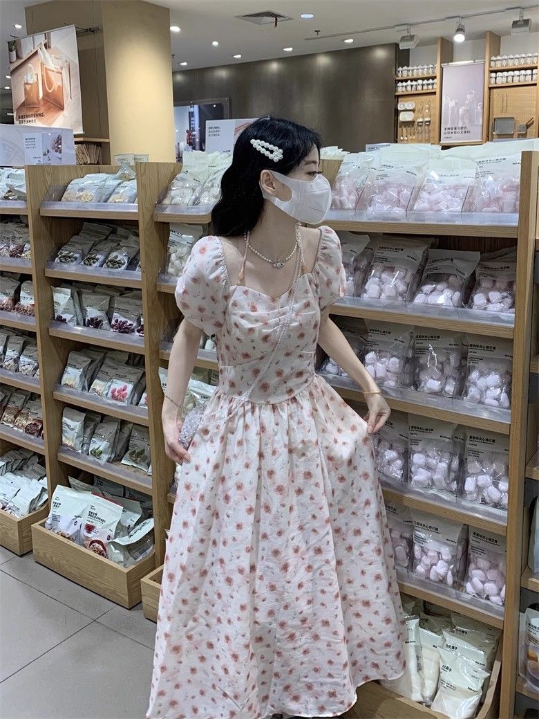 法式方领碎花连衣裙女2024夏季新款小个子气质收腰泡泡袖仙女长裙