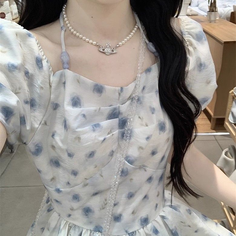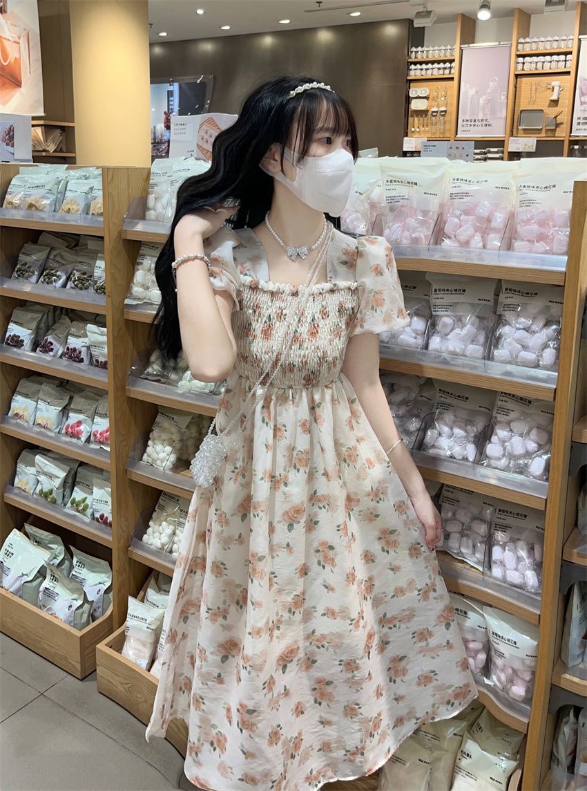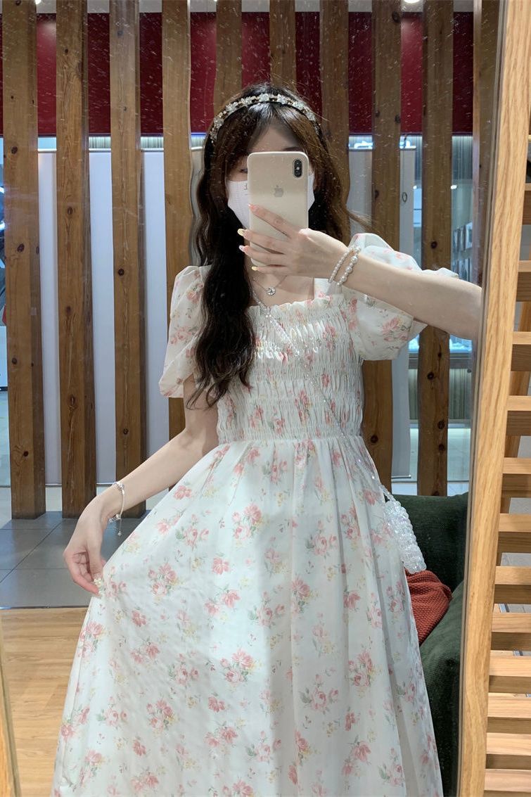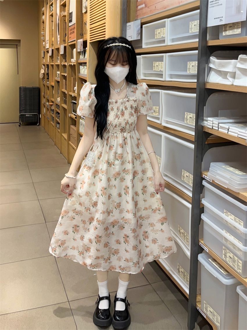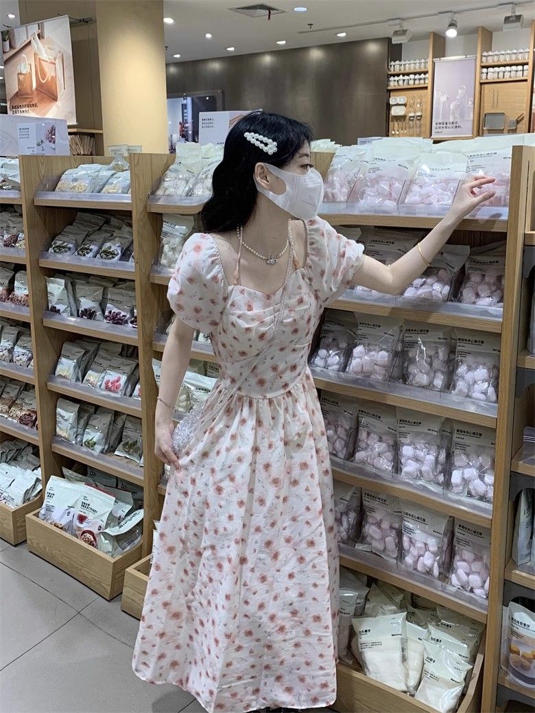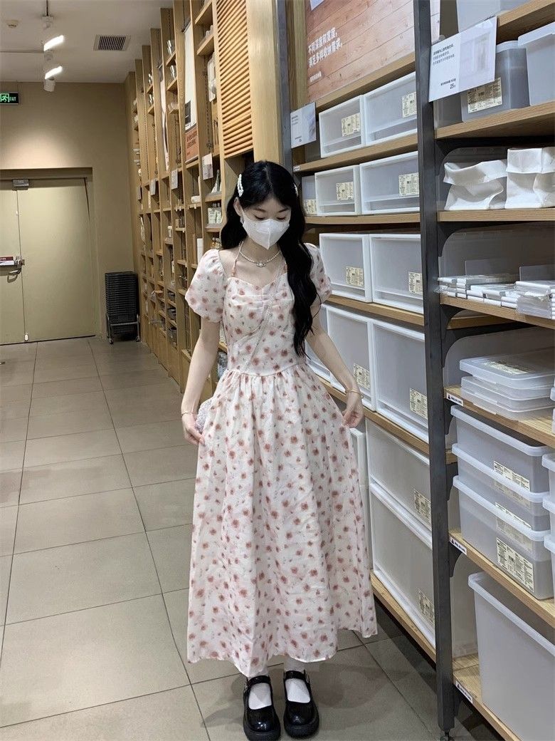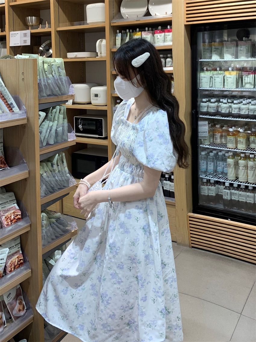 法式方领碎花连衣裙女2024夏季新款小个子气质收腰泡泡袖仙女长裙
