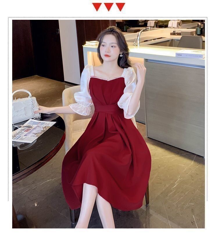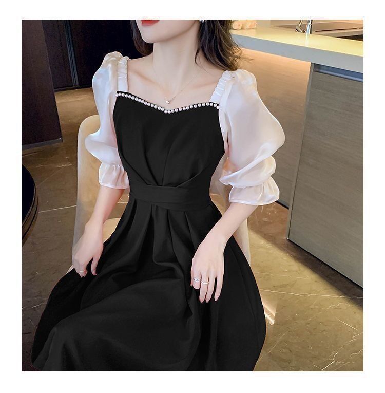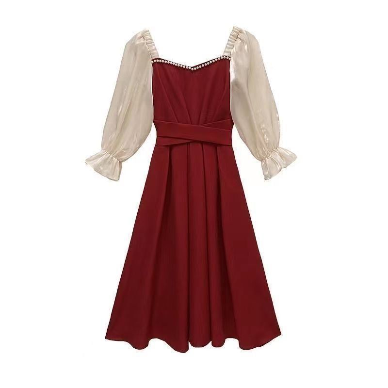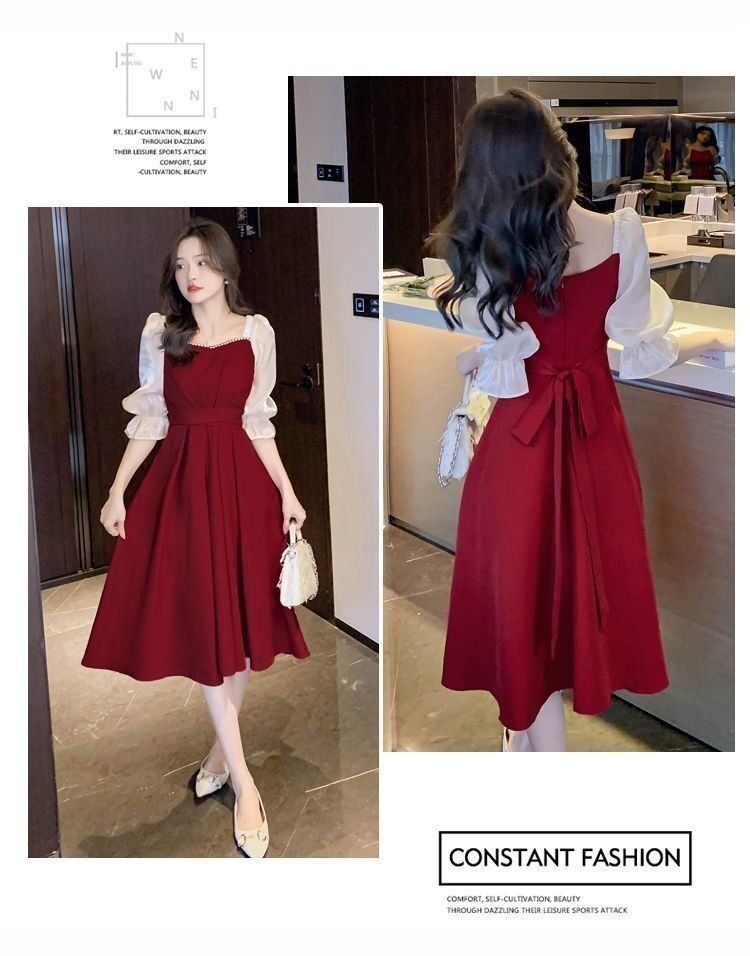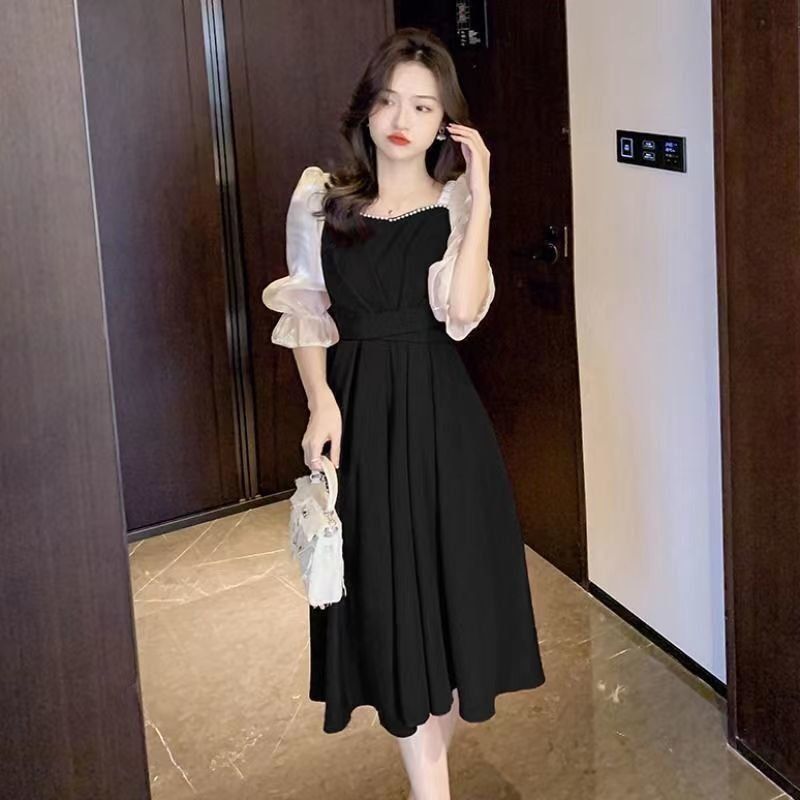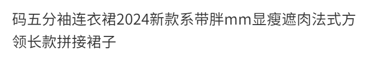 码五分袖连衣裙2024新款系带胖mm显瘦遮肉法式方领长款拼接裙子