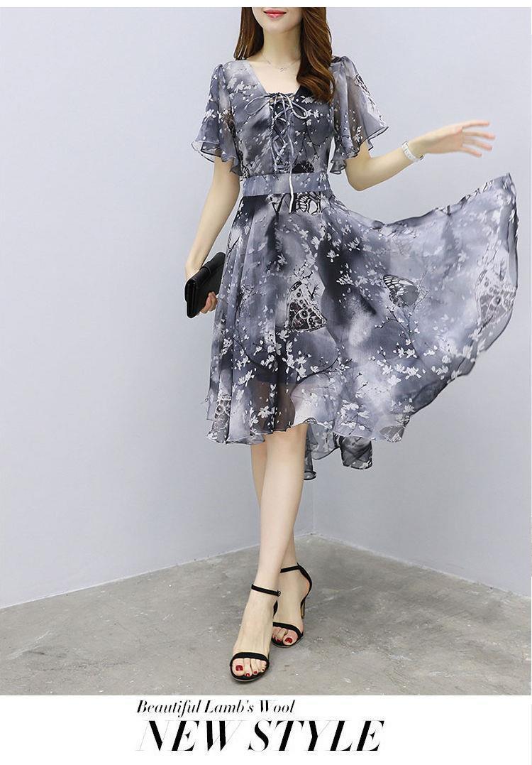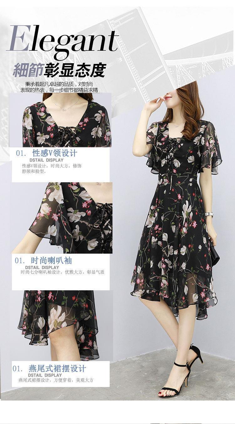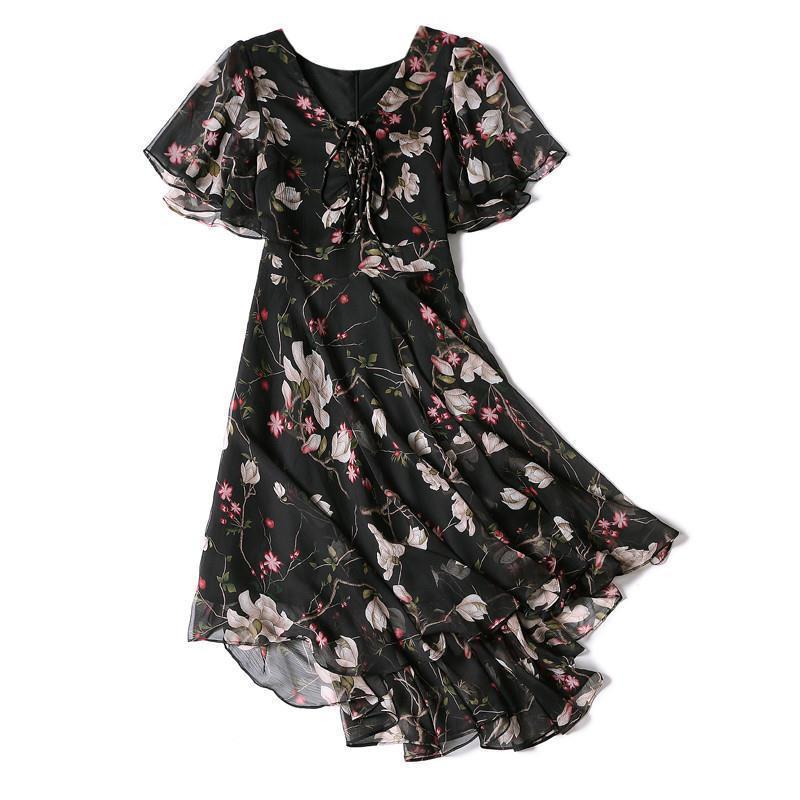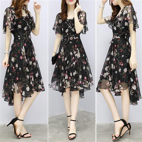 印花碎花连衣裙2024年新款茶歇法式不规则前短后长修身显瘦薄裙子