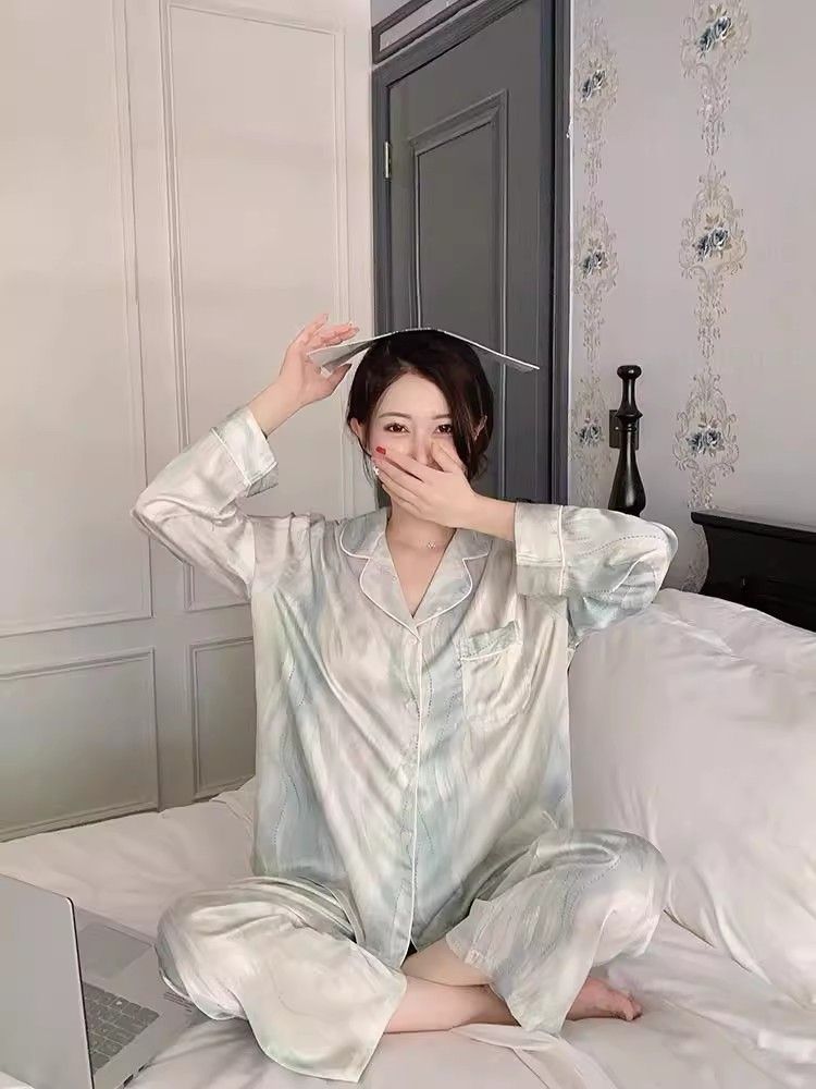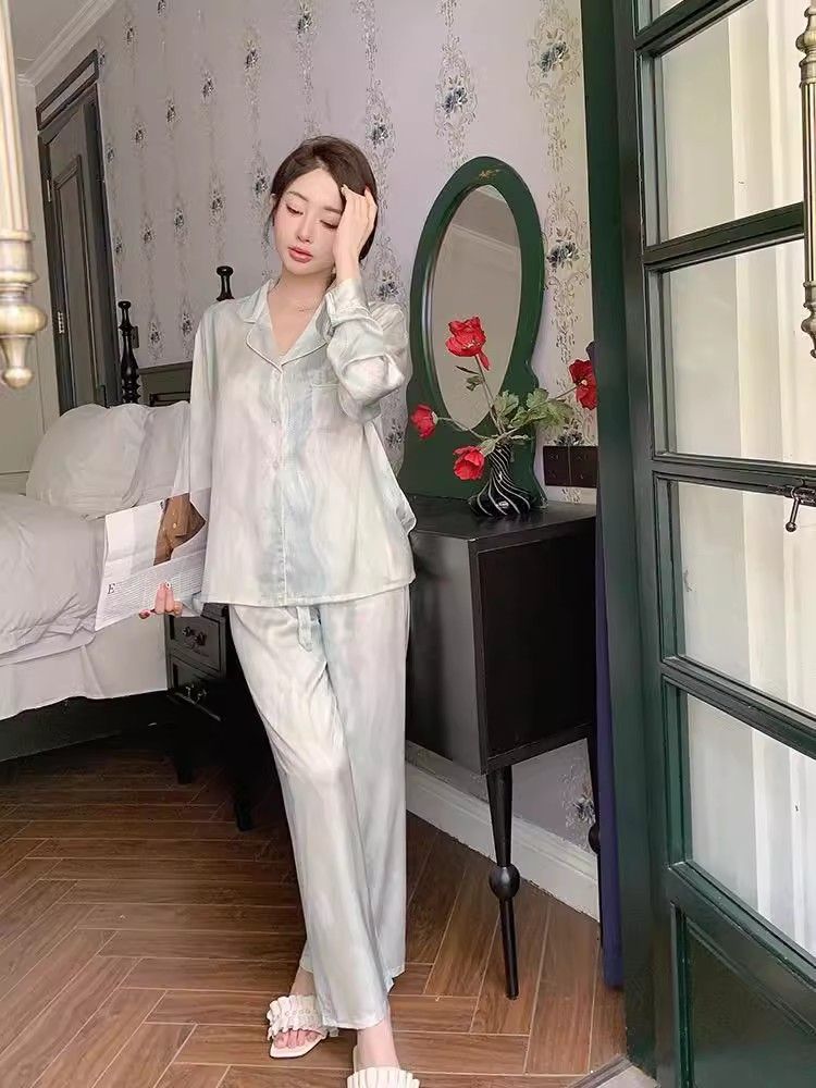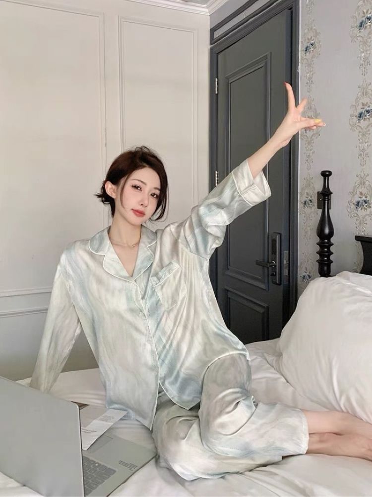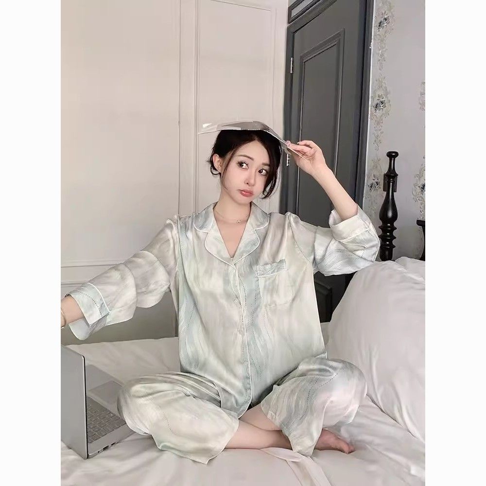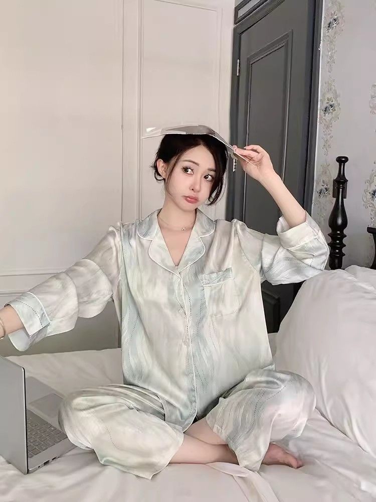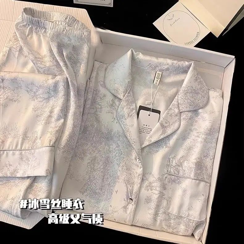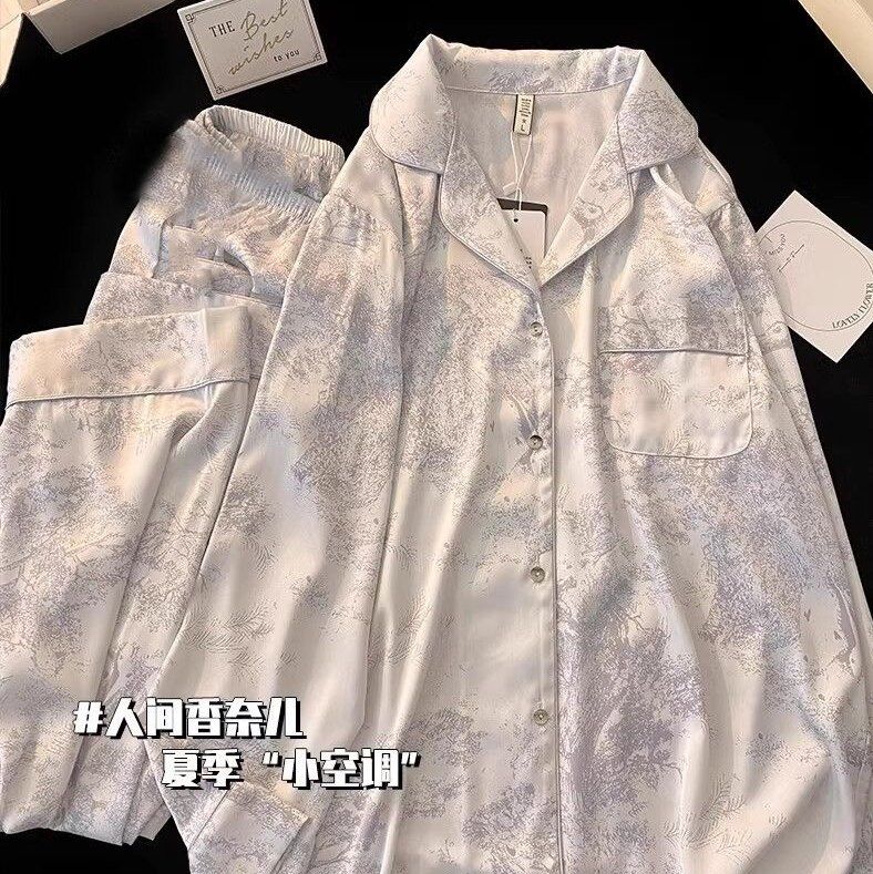 春夏薄款轻奢高级感长袖长裤冰丝睡衣女春秋季休闲大码家居服套装