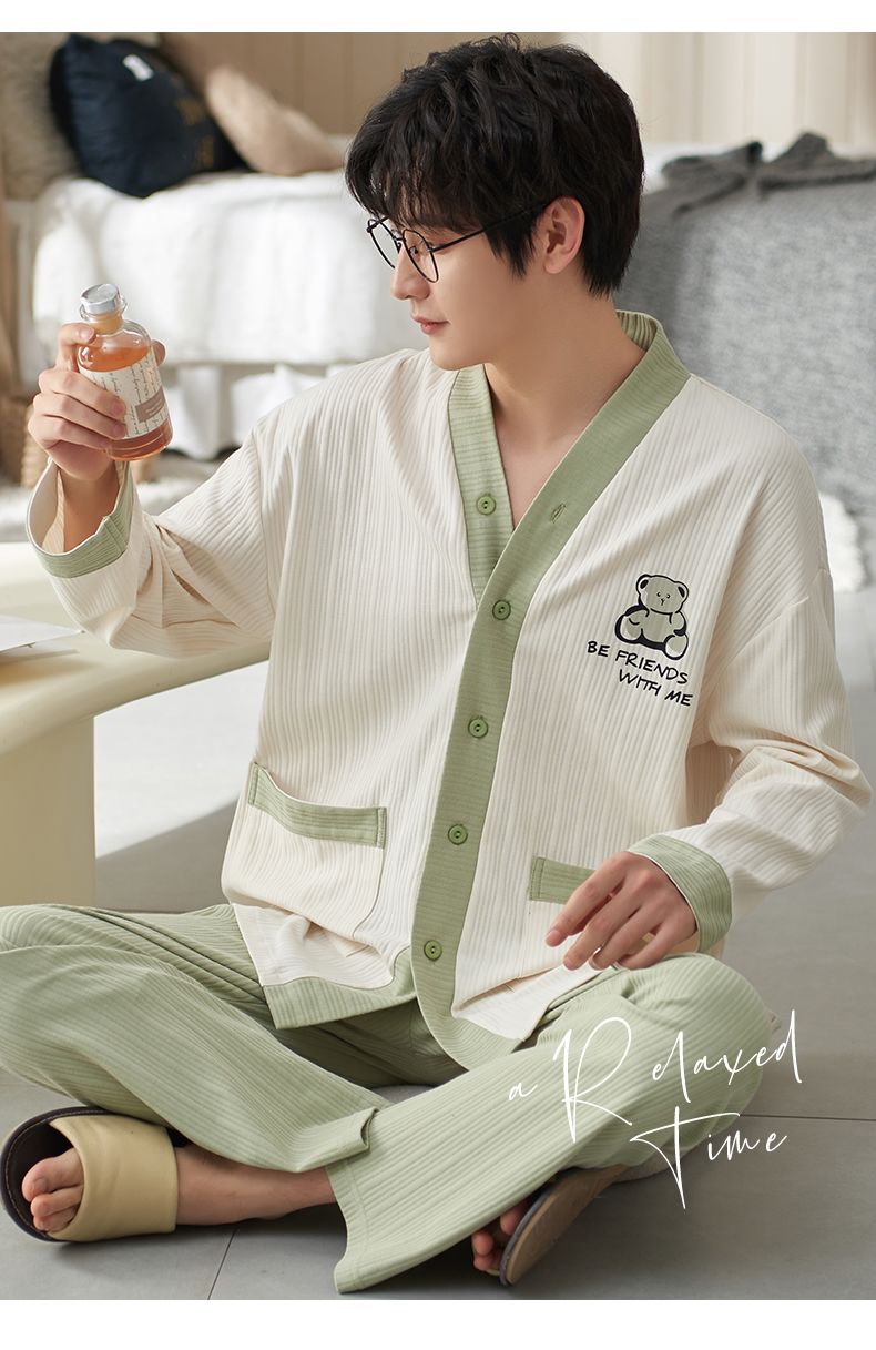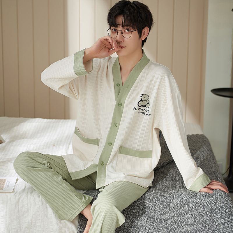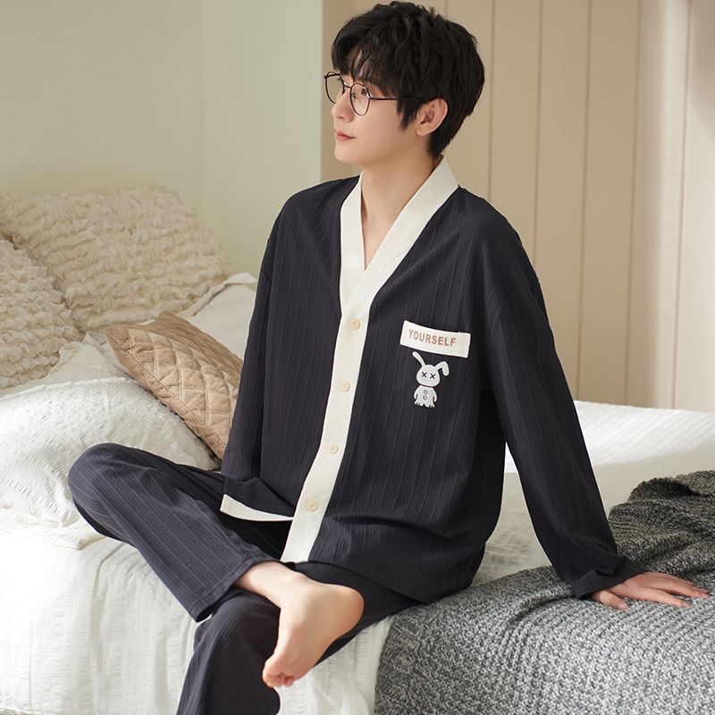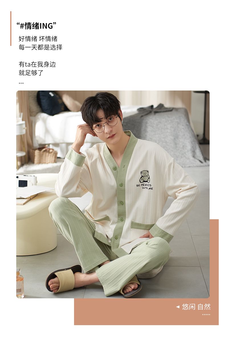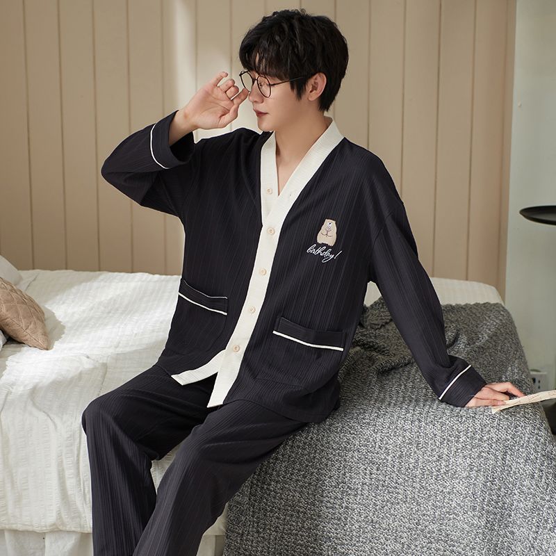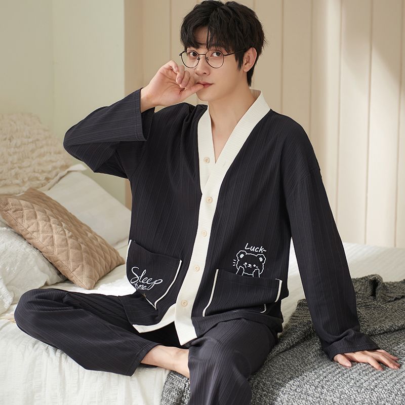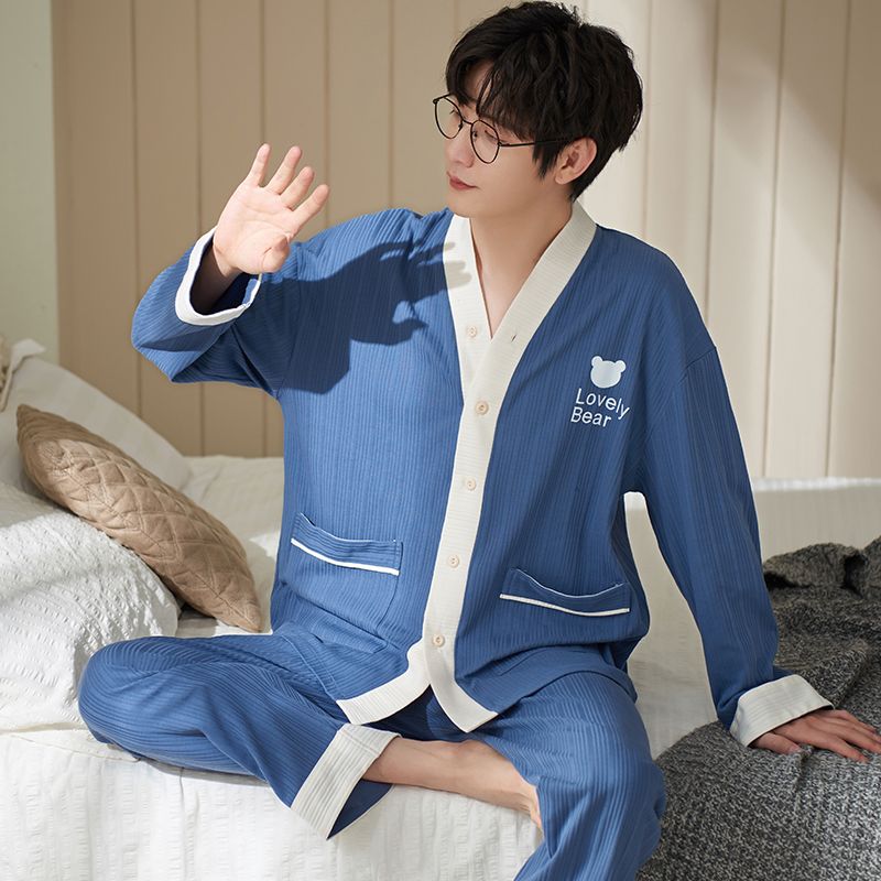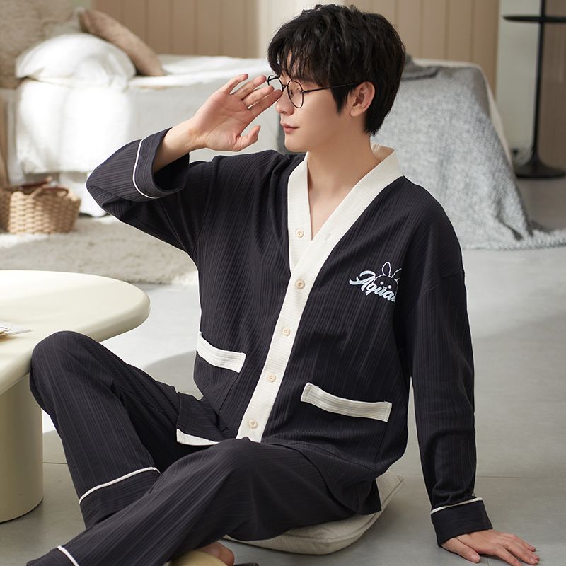 新款长袖长裤大码休闲家居服开衫睡衣男青少年高档长袖新款春秋季