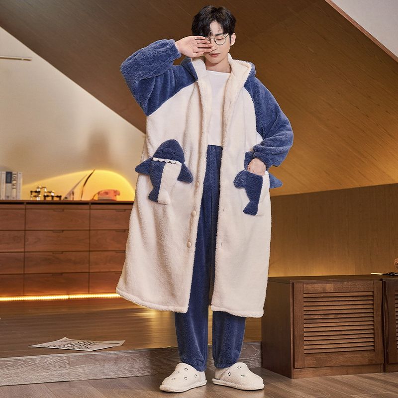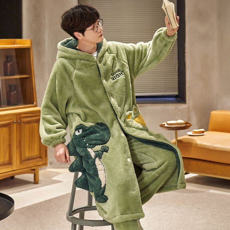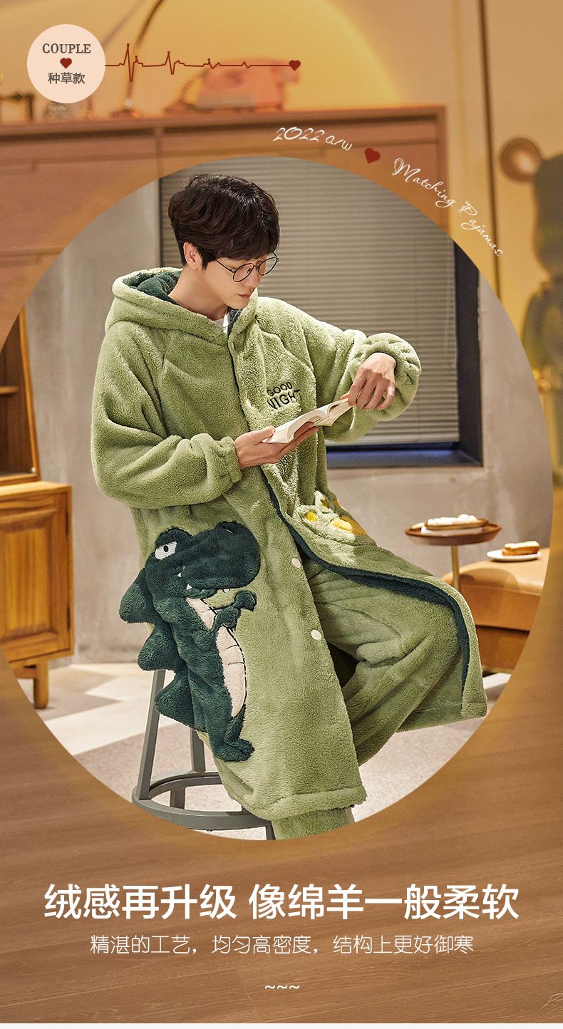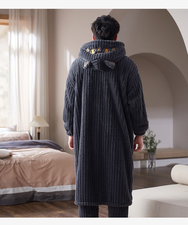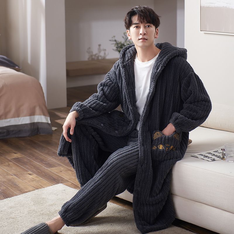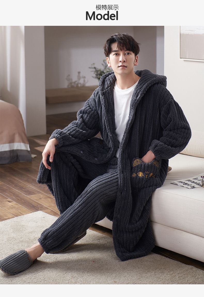 秋冬季男士睡衣加厚保暖法兰绒中长款睡袍冬天珊瑚绒家居服可外出