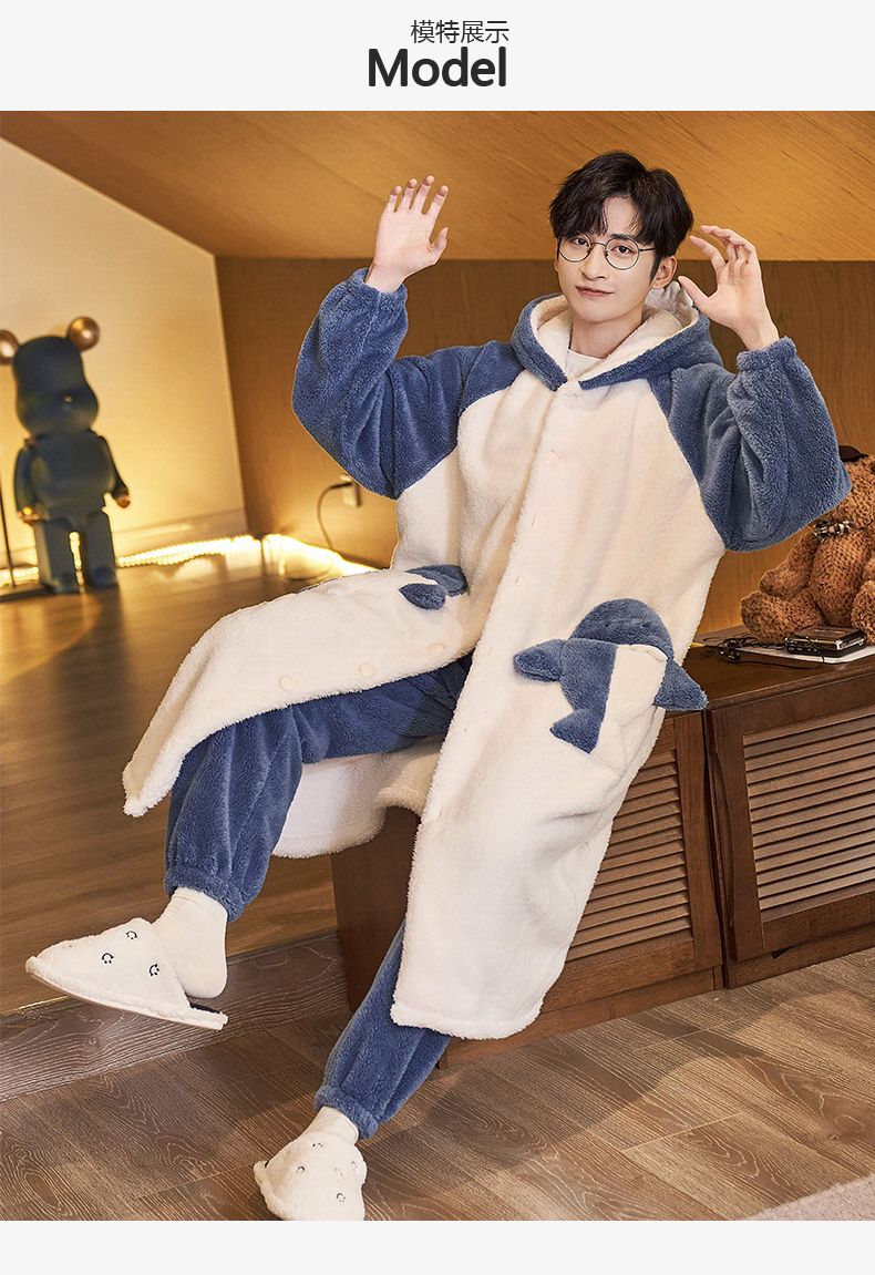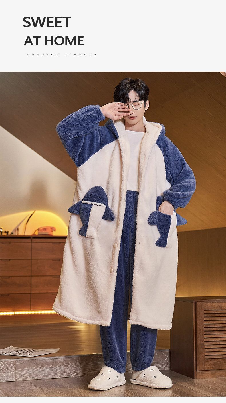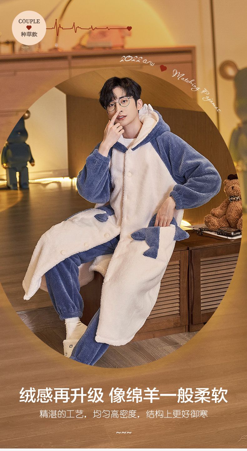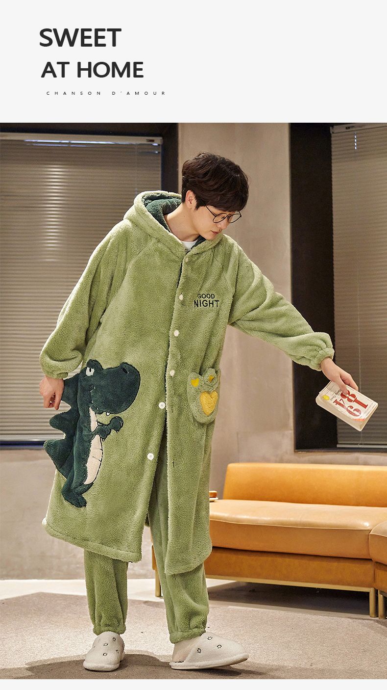 秋冬季男士睡衣加厚保暖法兰绒中长款睡袍冬天珊瑚绒家居服可外出