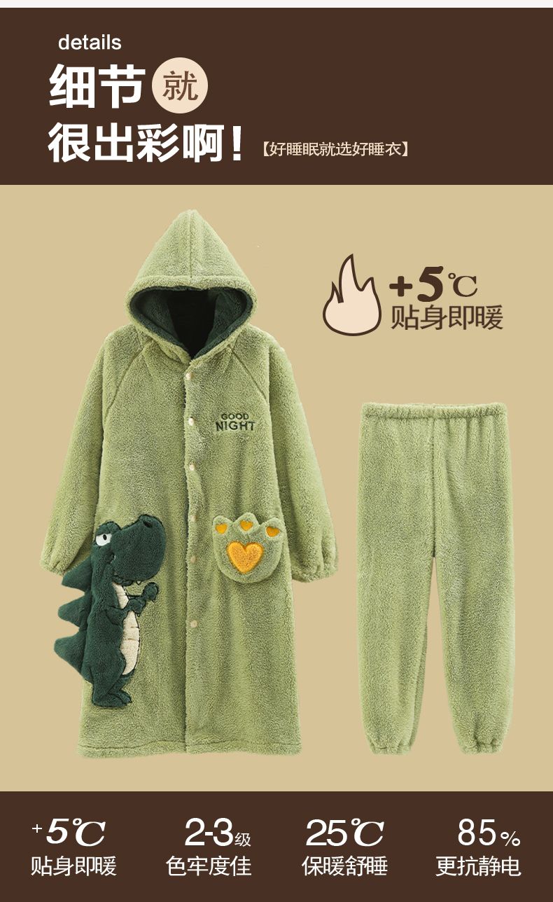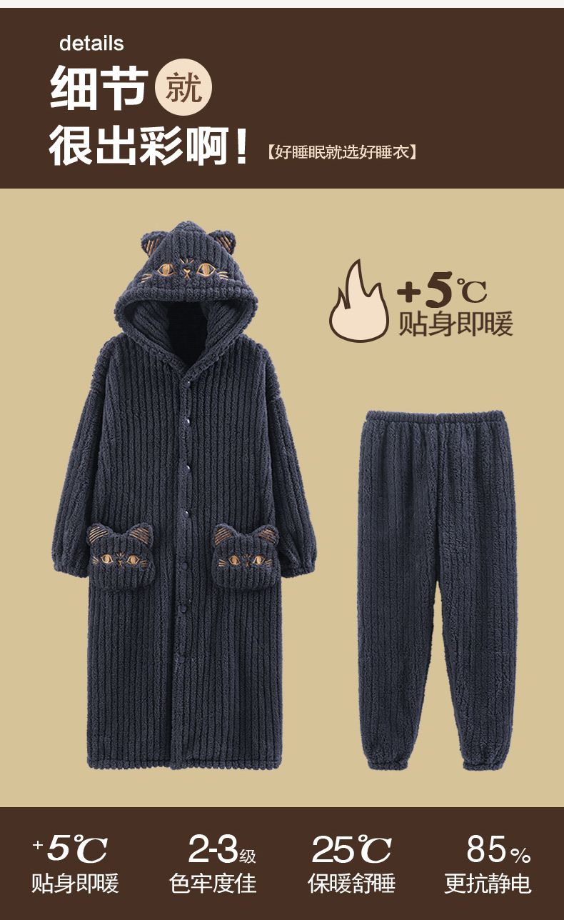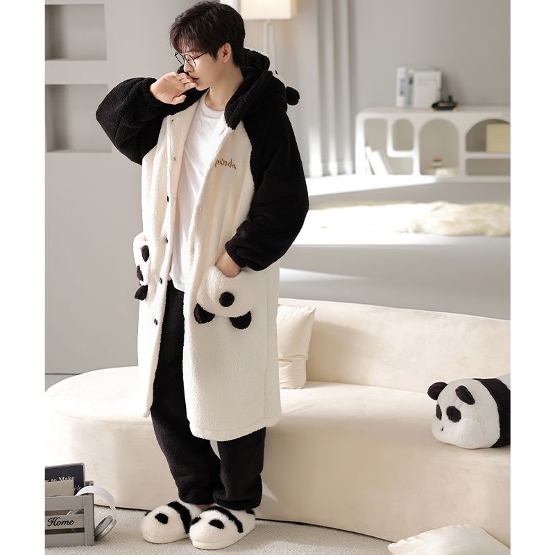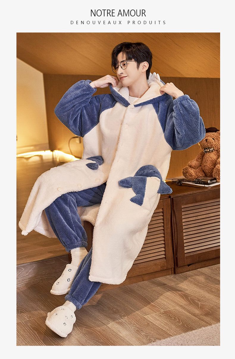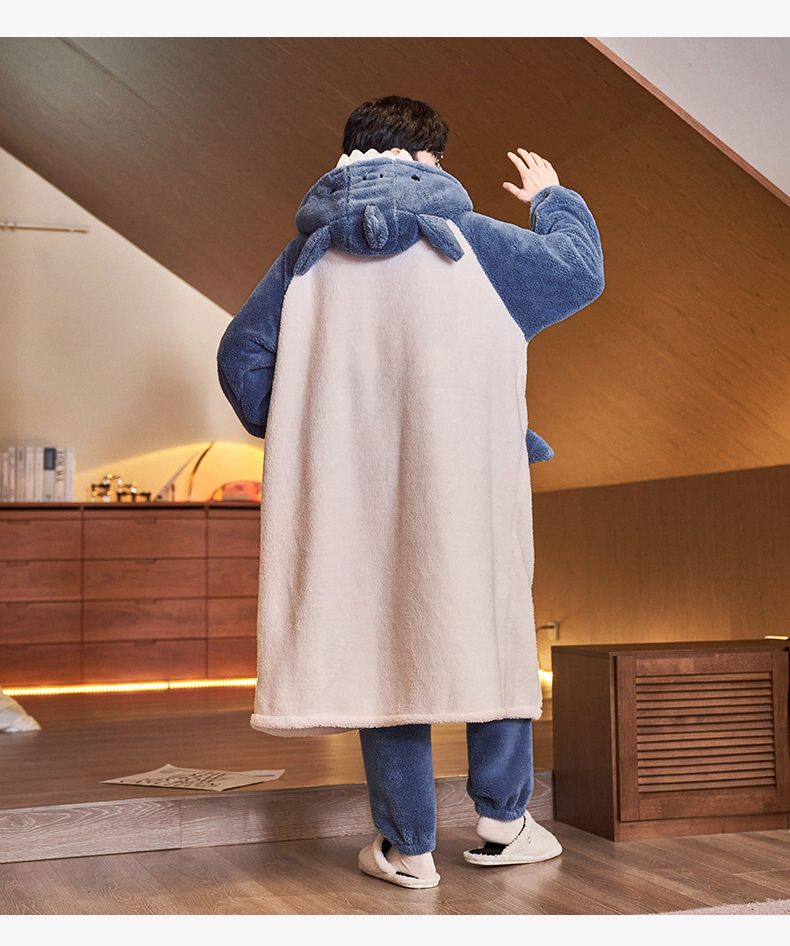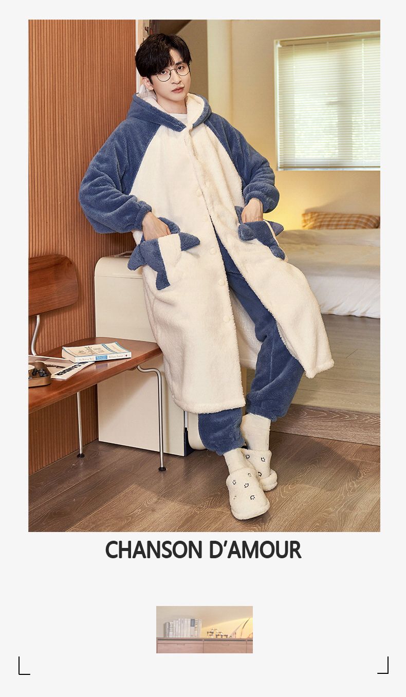 秋冬季男士睡衣加厚保暖法兰绒中长款睡袍冬天珊瑚绒家居服可外出