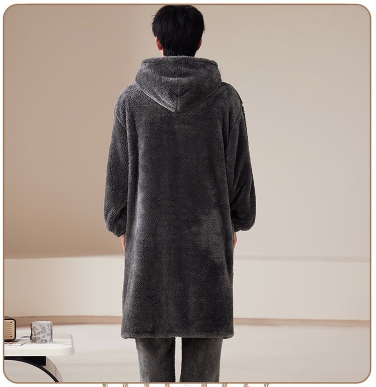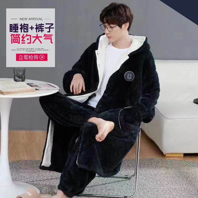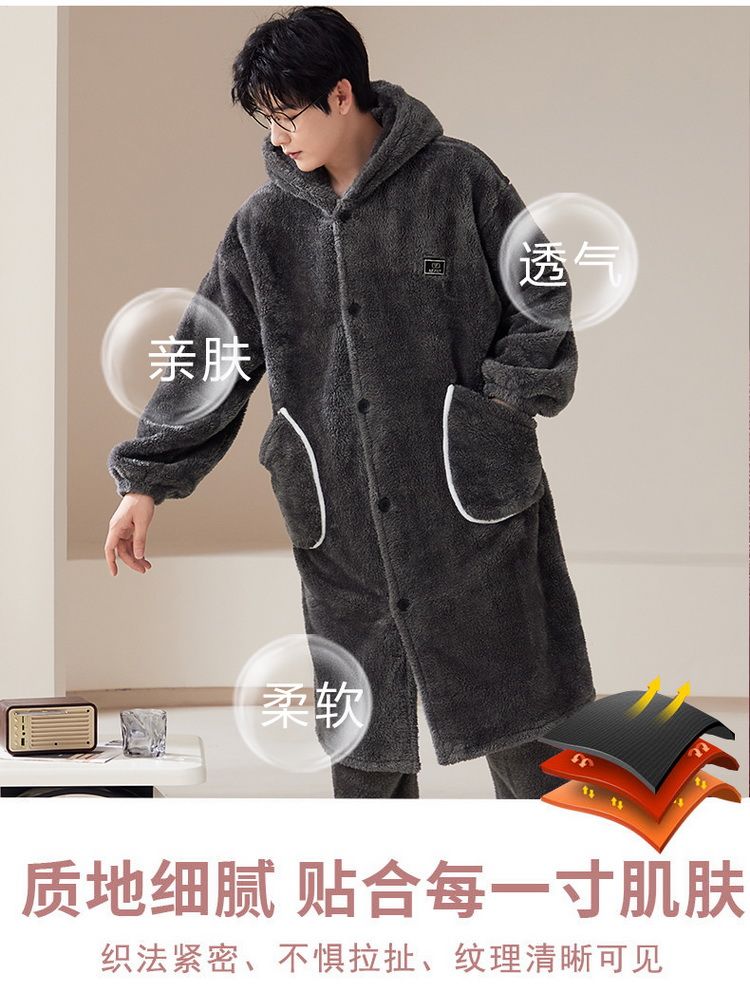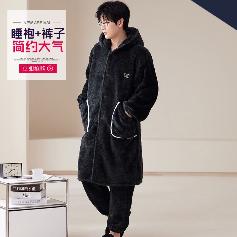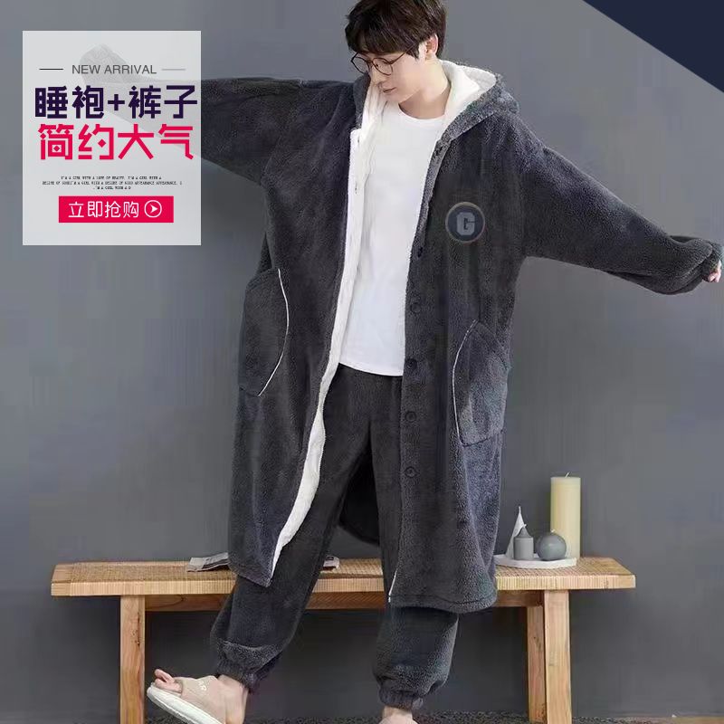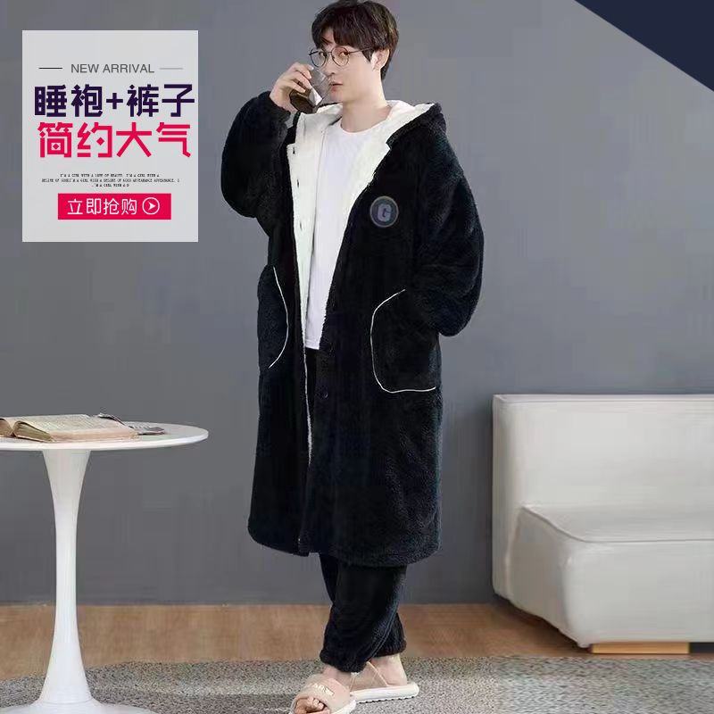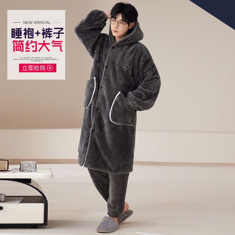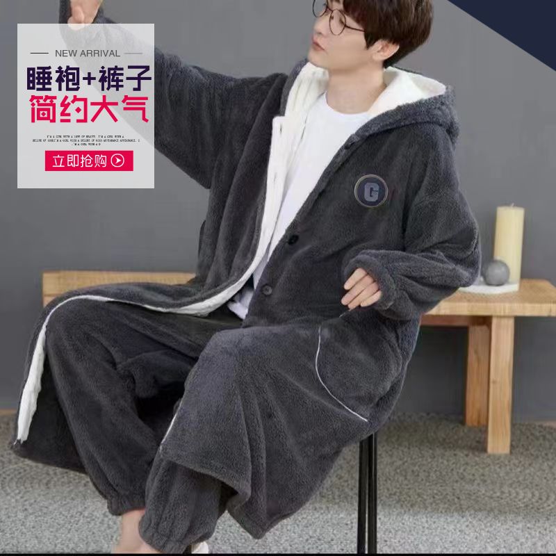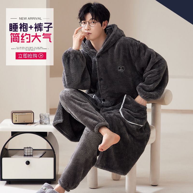 男士冬季睡袍套装加厚长款睡衣珊瑚绒连帽加绒新款浴袍学生家居服