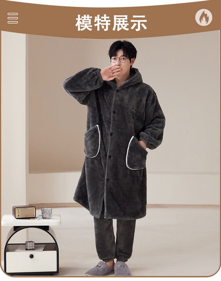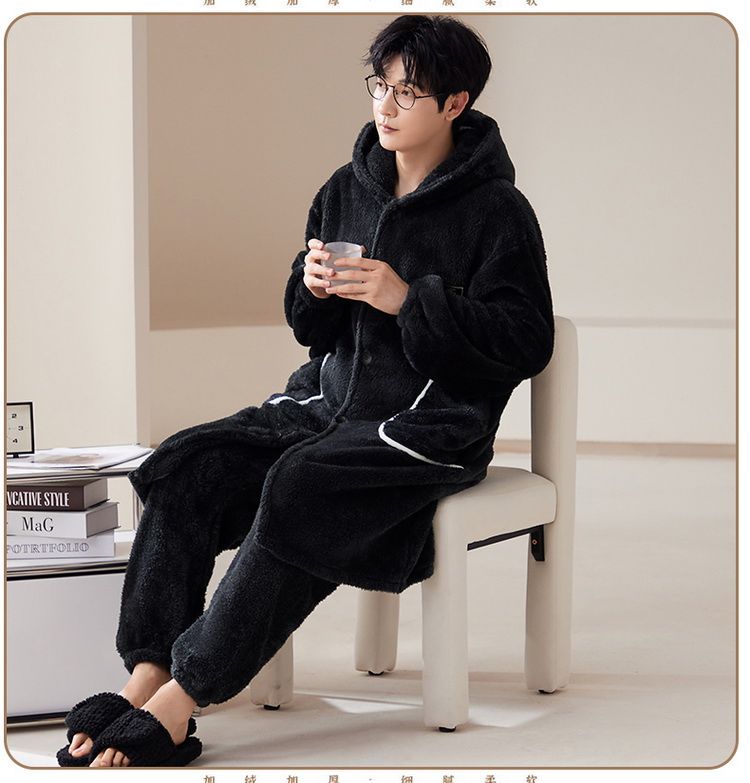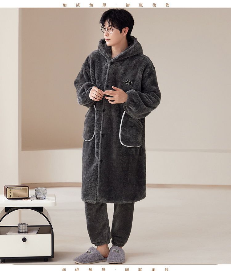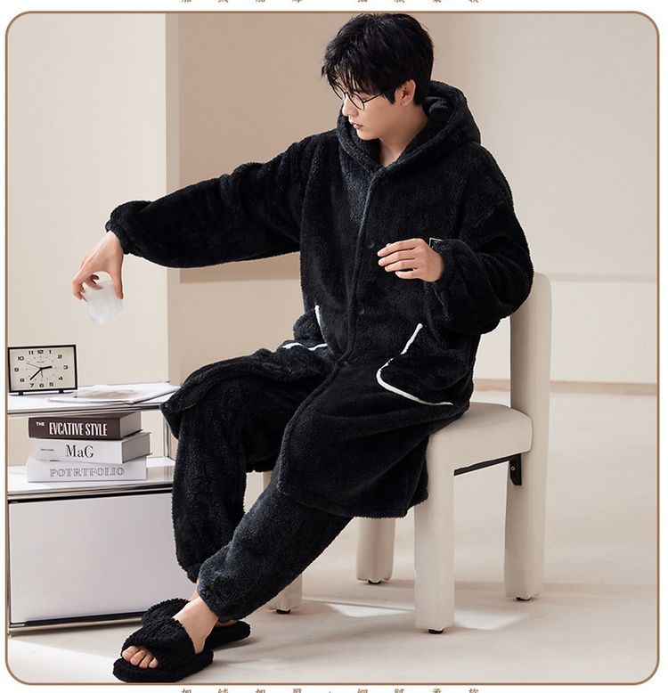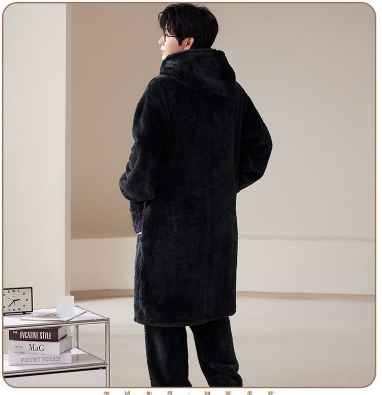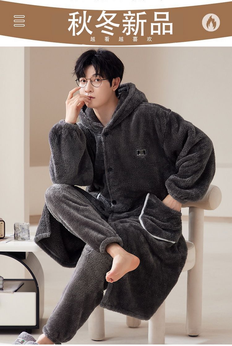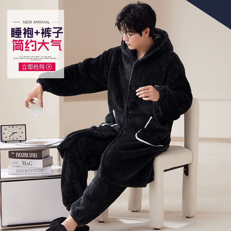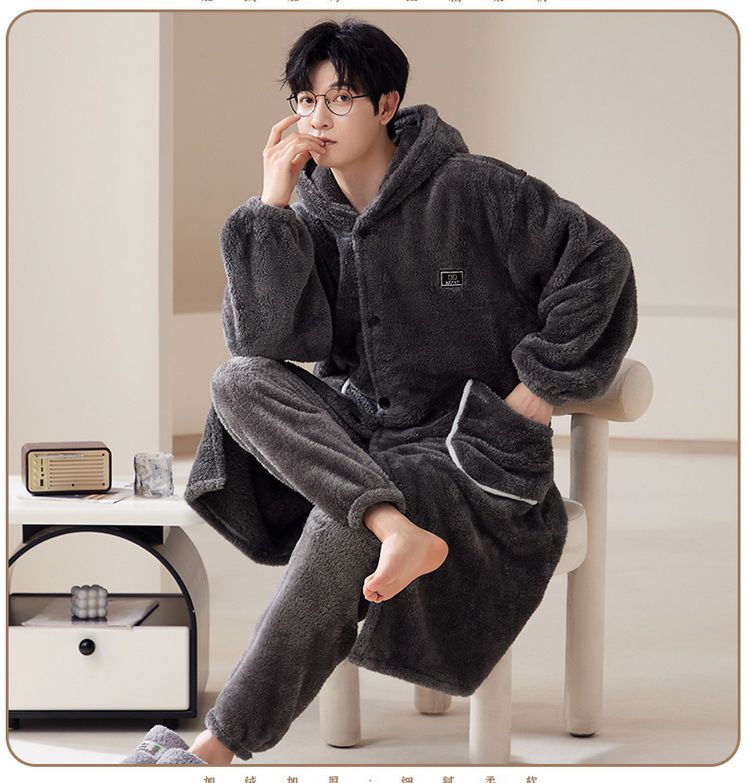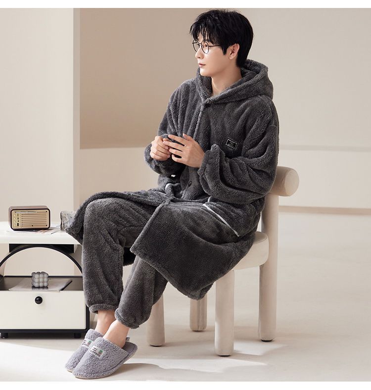 男士冬季睡袍套装加厚长款睡衣珊瑚绒连帽加绒新款浴袍学生家居服