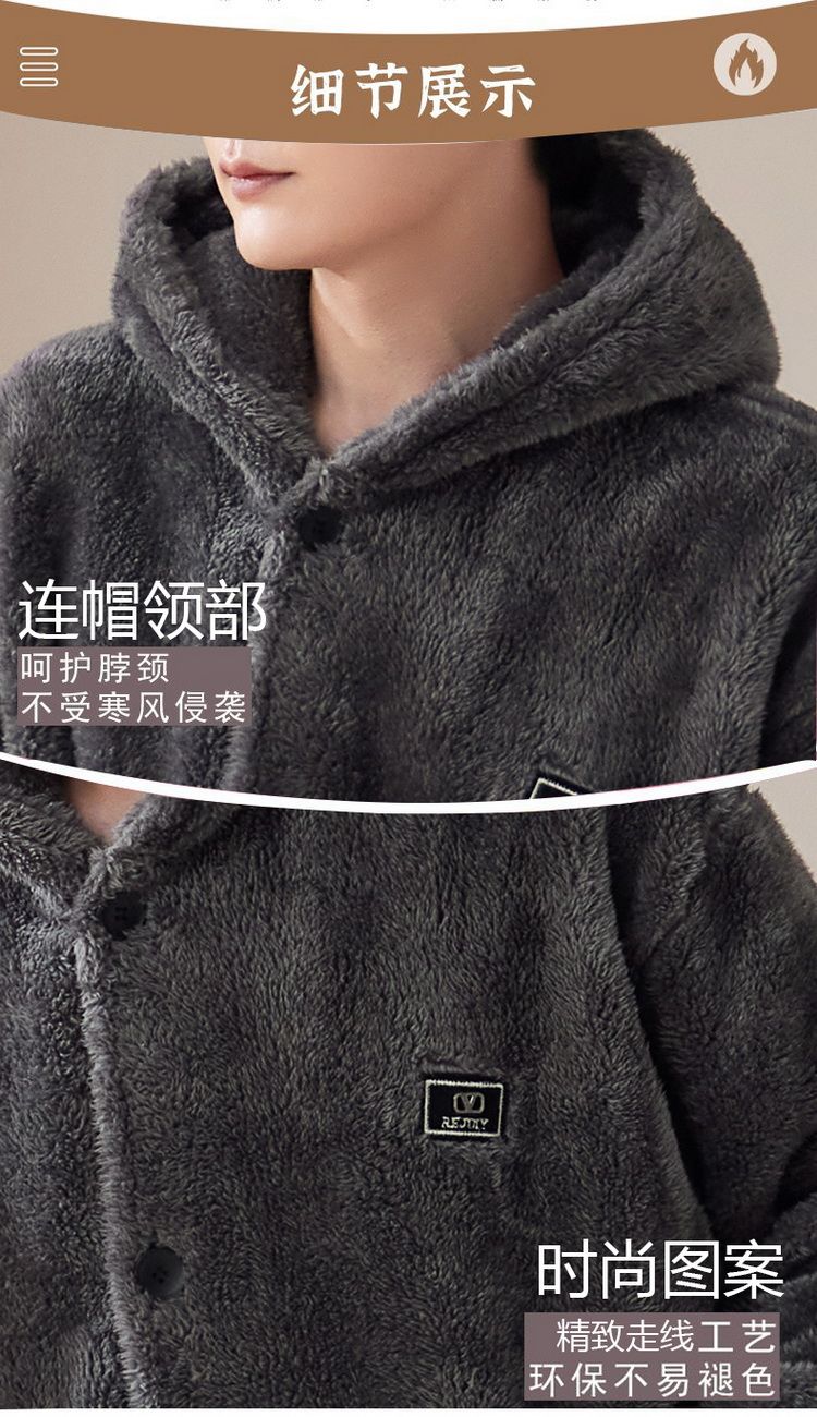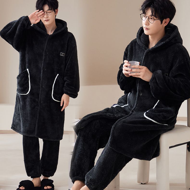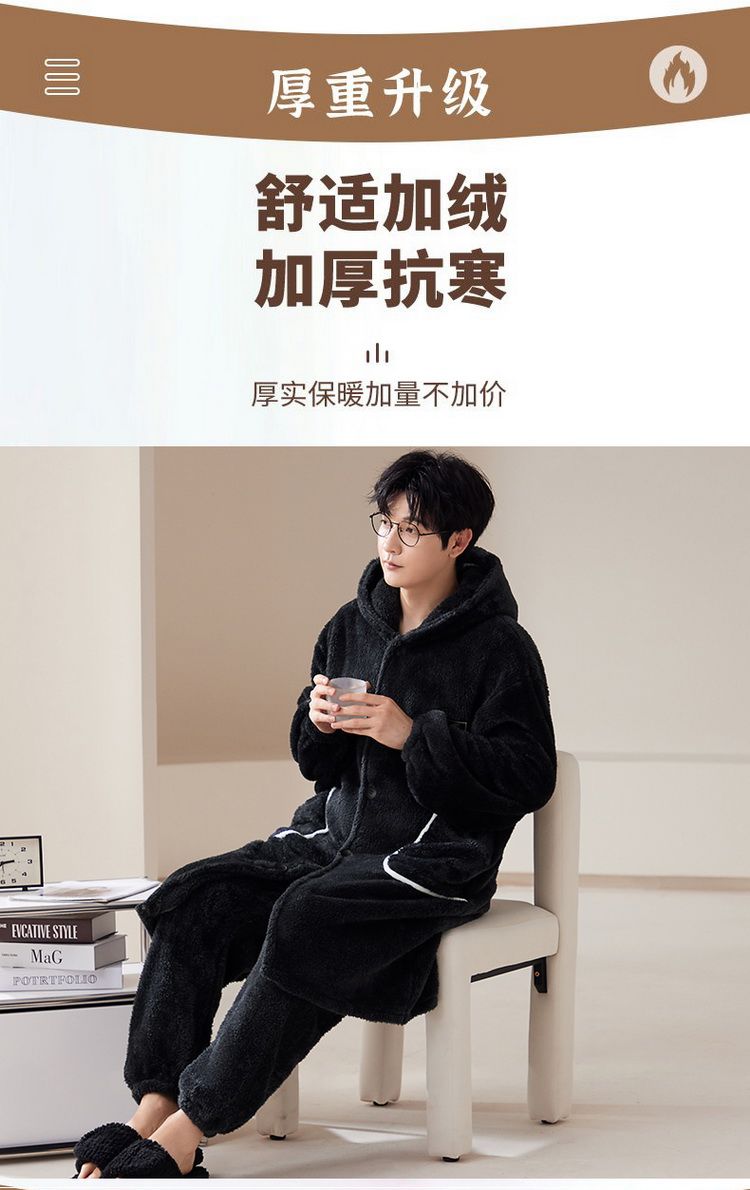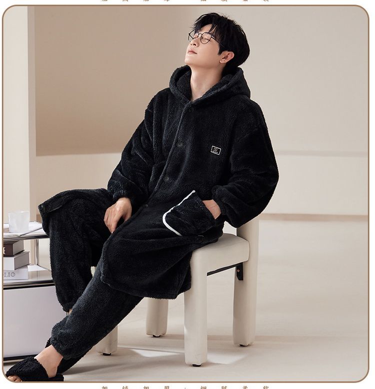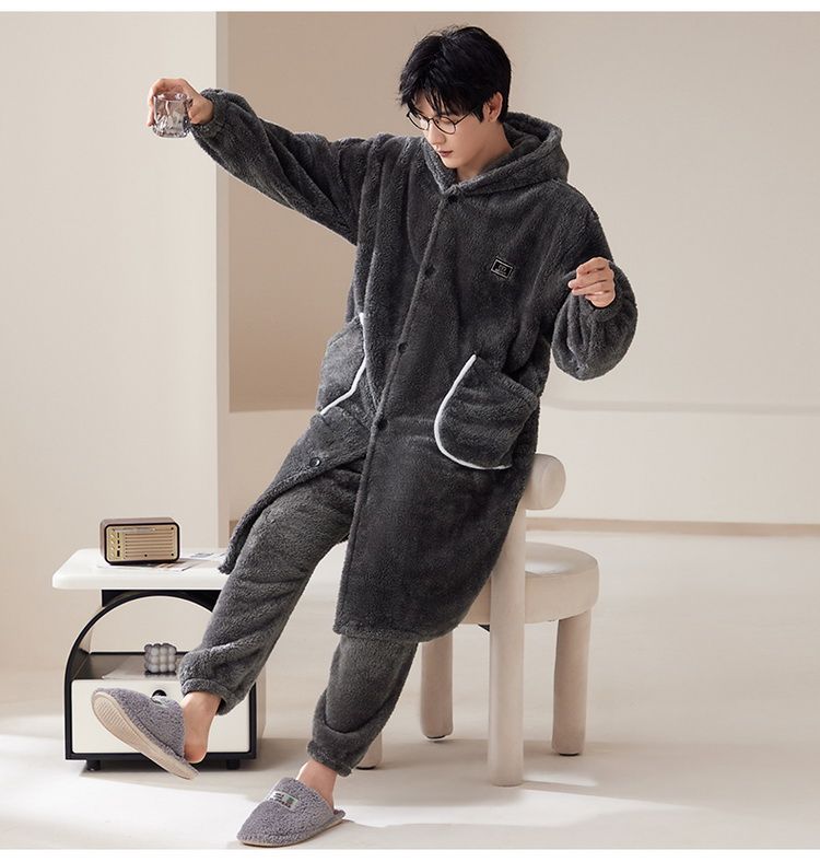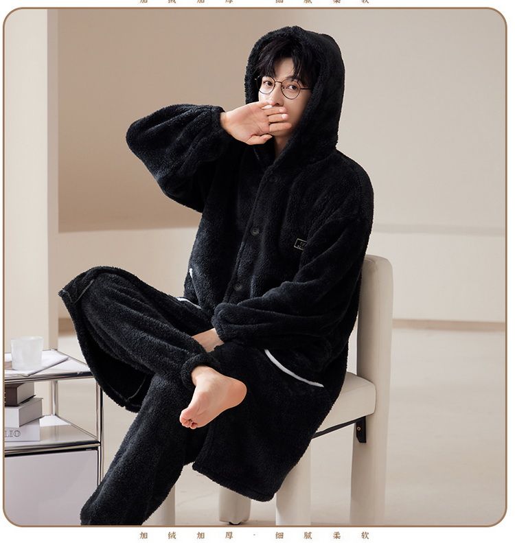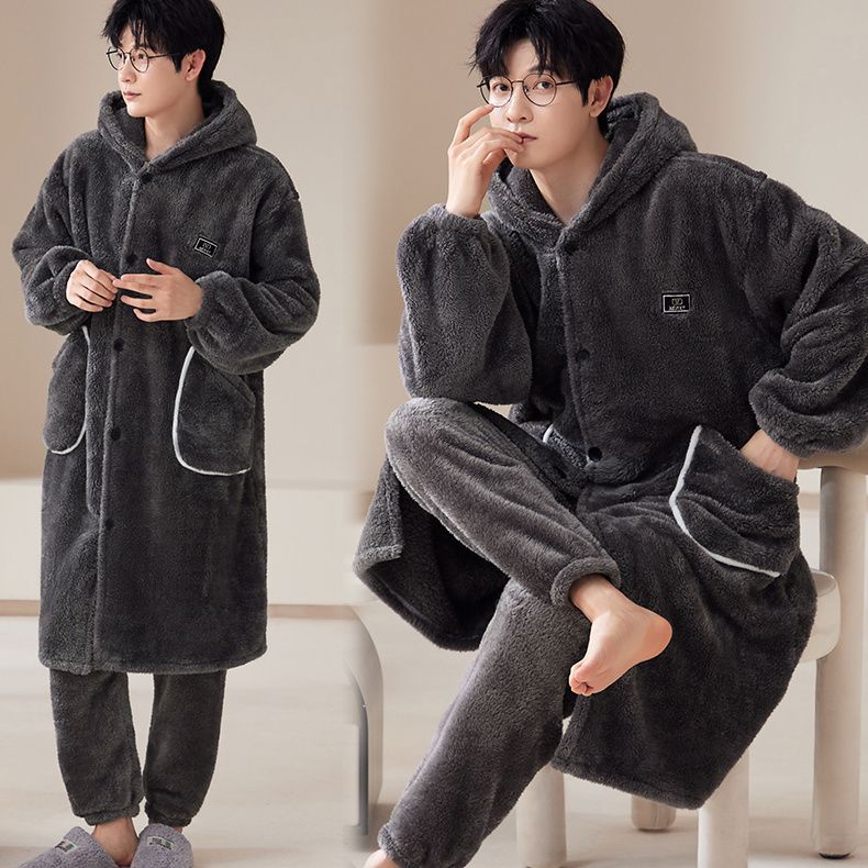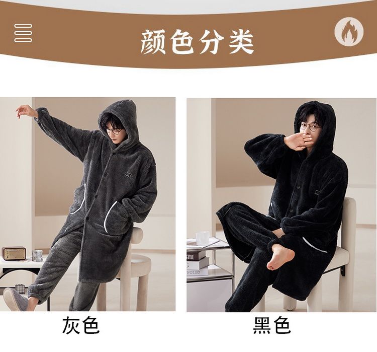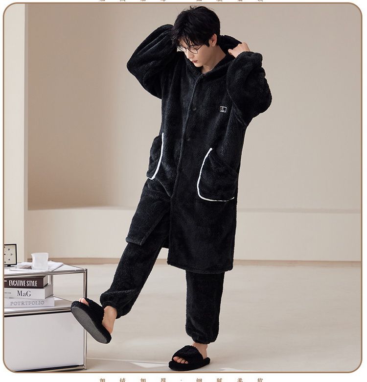男士冬季睡袍套装加厚长款睡衣珊瑚绒连帽加绒新款浴袍学生家居服