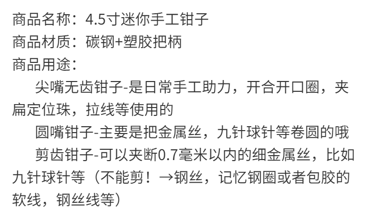 | pointed toothless pliers(尖嘴无齿钳子) | USD $1.62 | 99999 piece available |