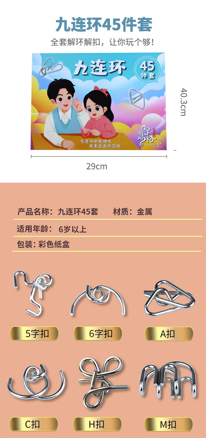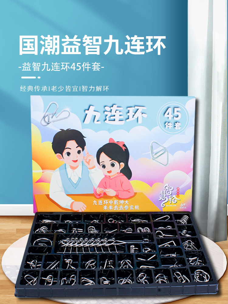 | boutique color box chinese string puzzle 45-piece set(精品彩盒九连环45件套) | USD $5.99 | 99999 piece available |