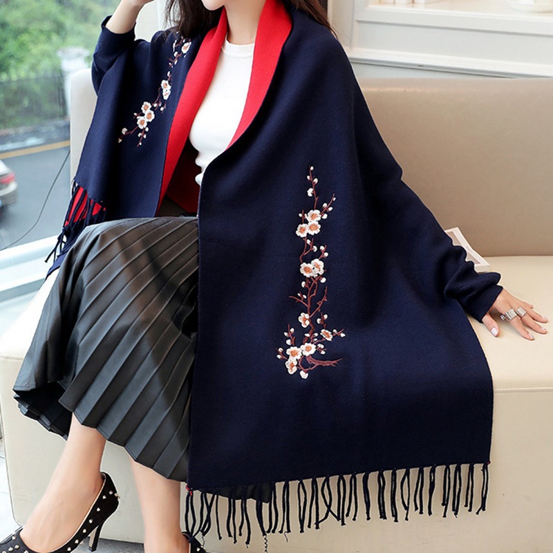 针织开衫披肩女2024秋冬绣花流苏显瘦蝙蝠衫外套长袖气质中长款潮