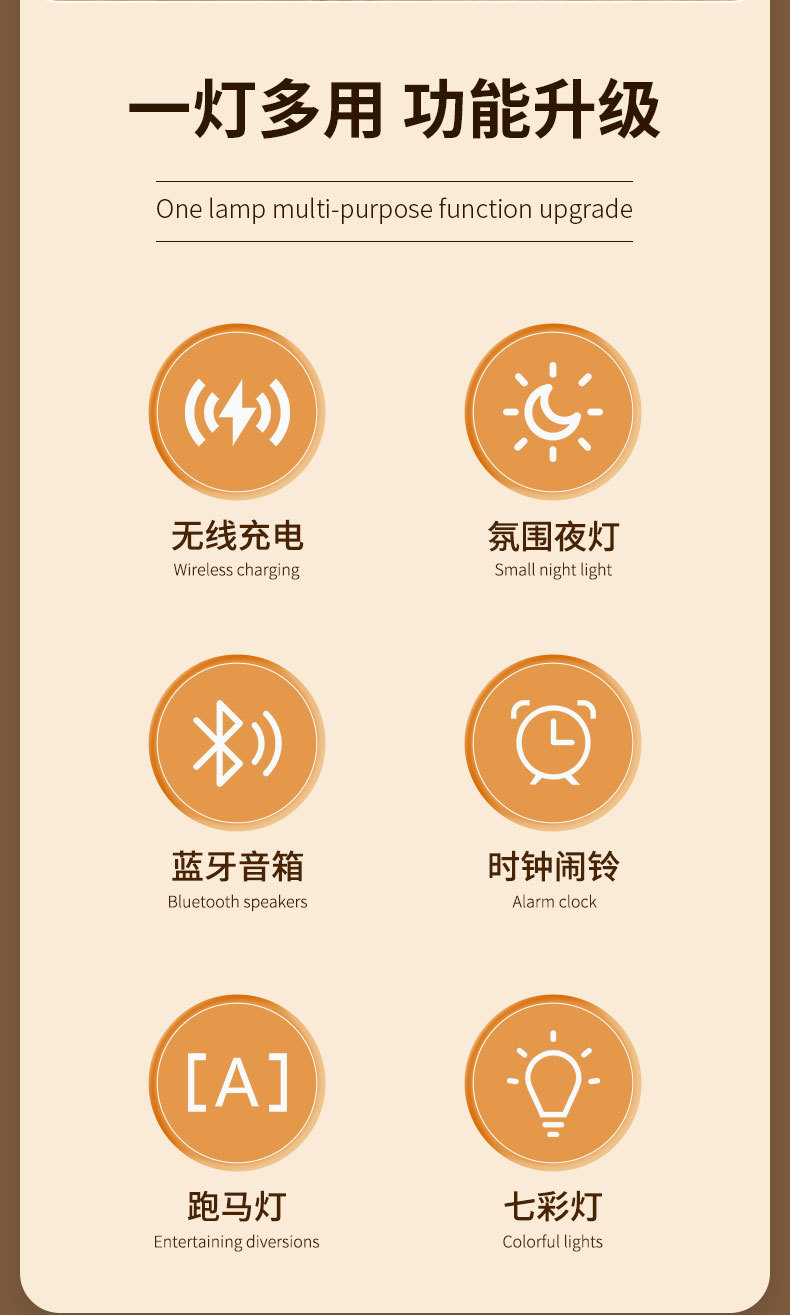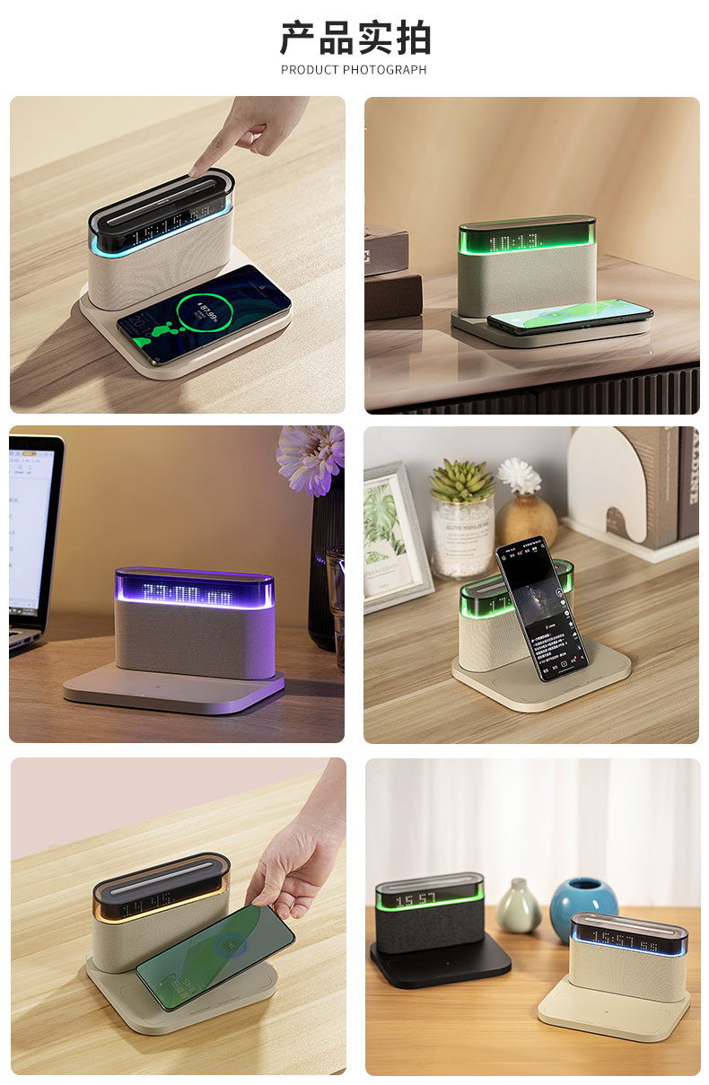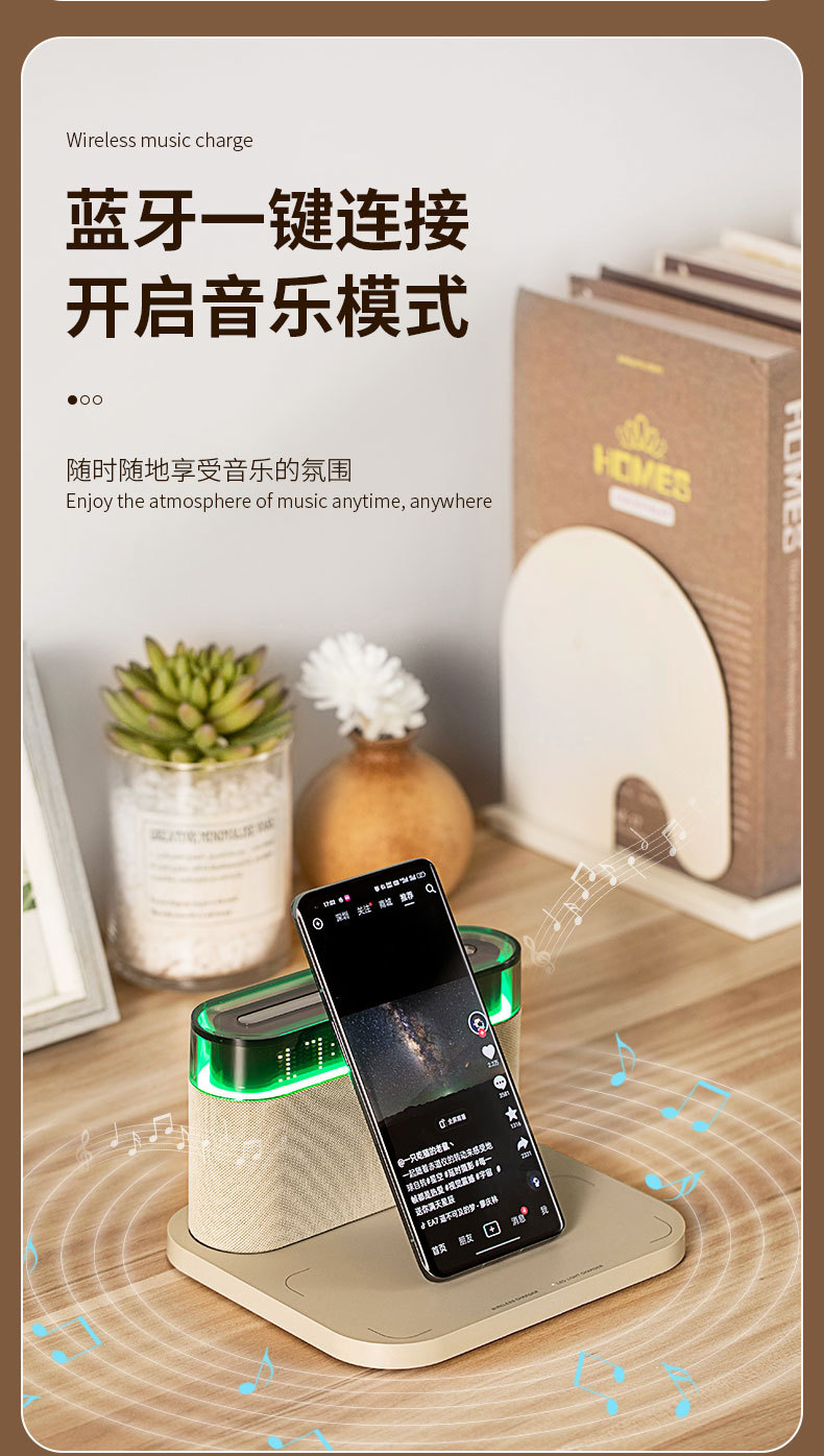 外贸专供六合一无线充小夜灯蓝牙音响家用数字闹钟充电音乐台灯