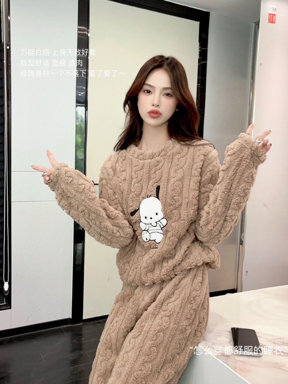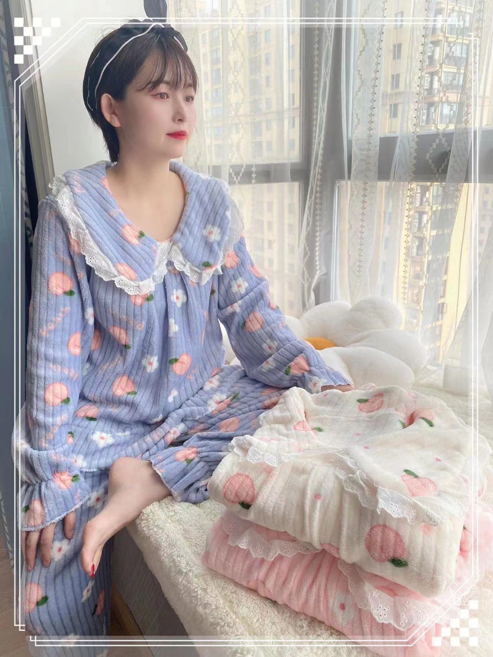 珊瑚绒睡衣女秋冬加厚外穿可爱法兰绒家居服宽松长款时尚开衫套装