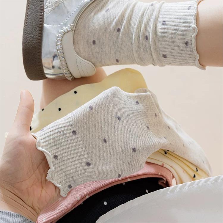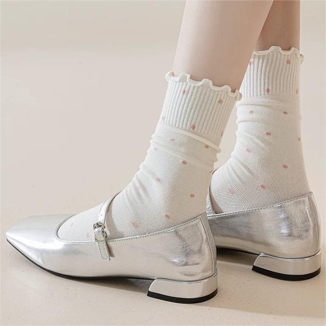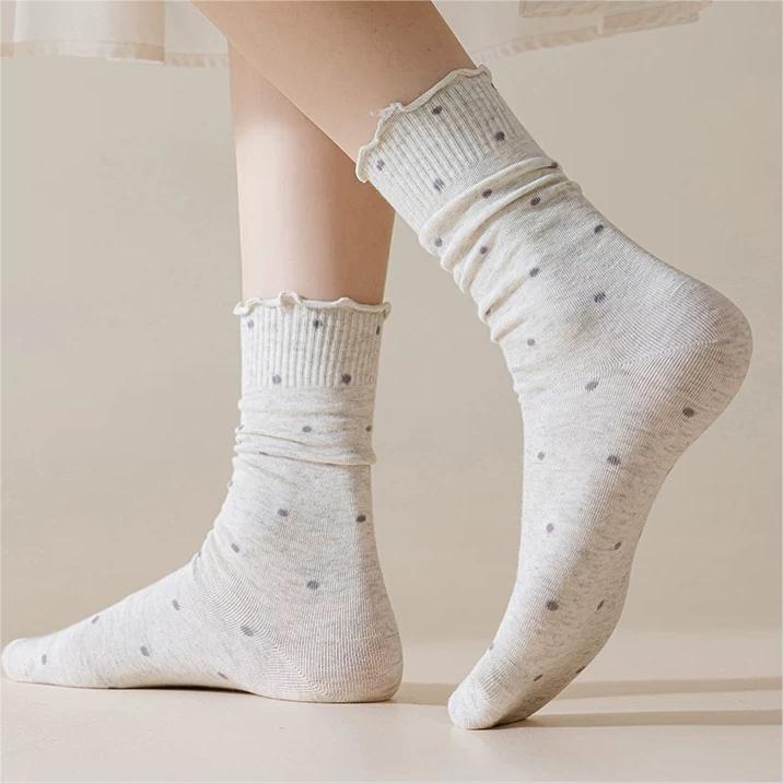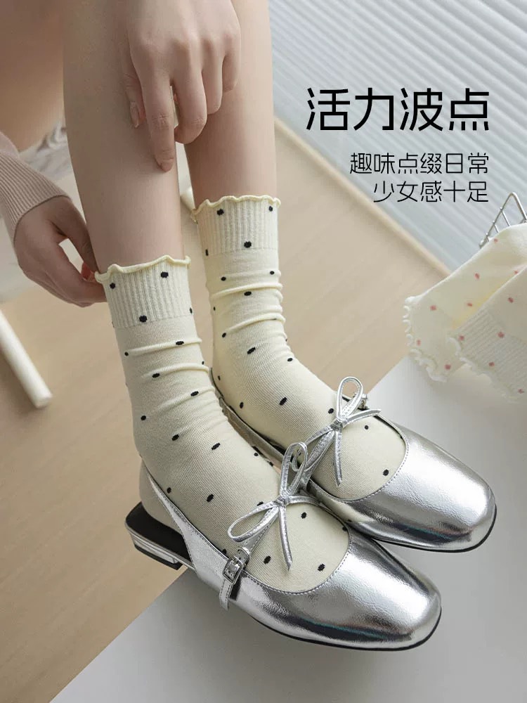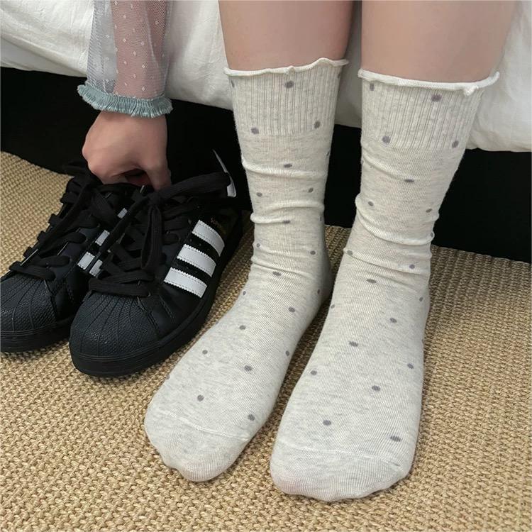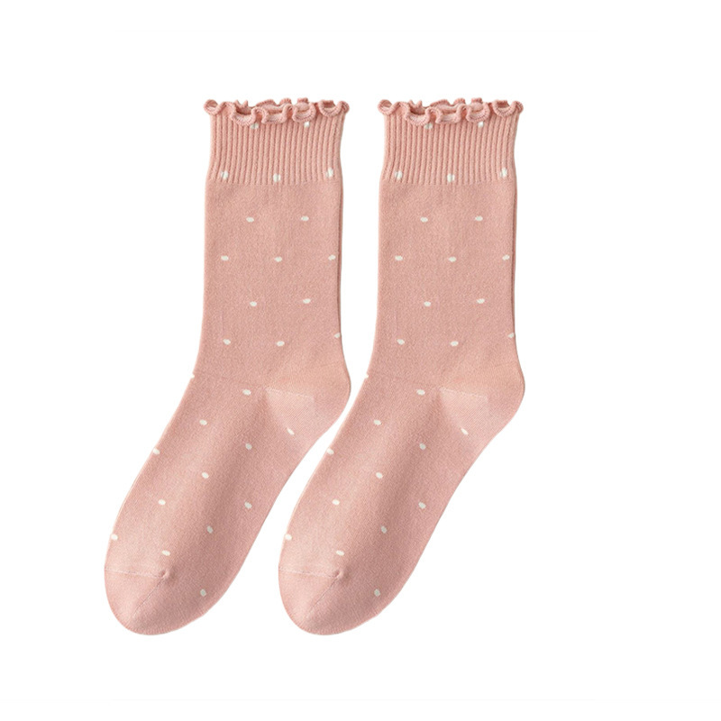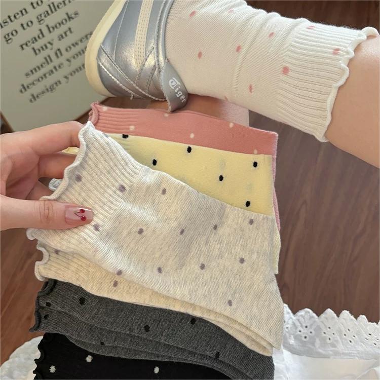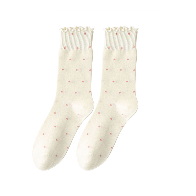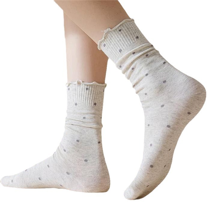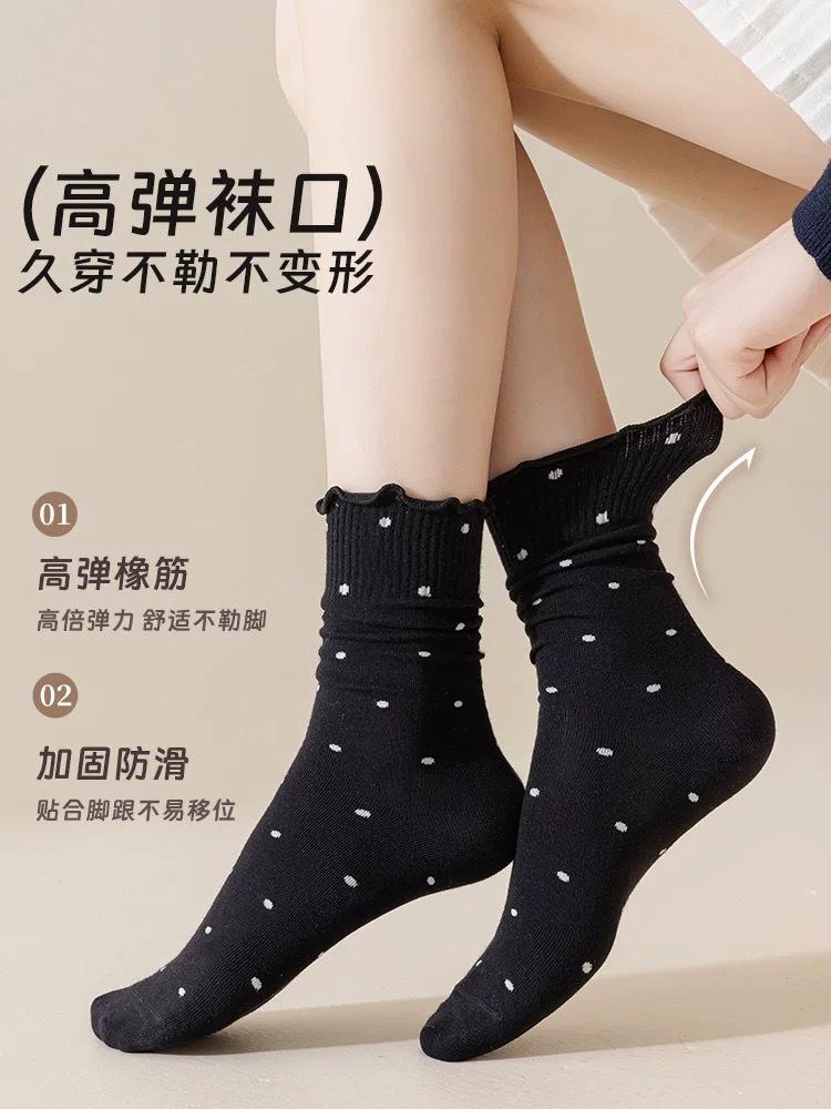 韩系可爱小圆点中筒袜甜美木耳边袜子春秋款百搭纯色学院风堆堆袜