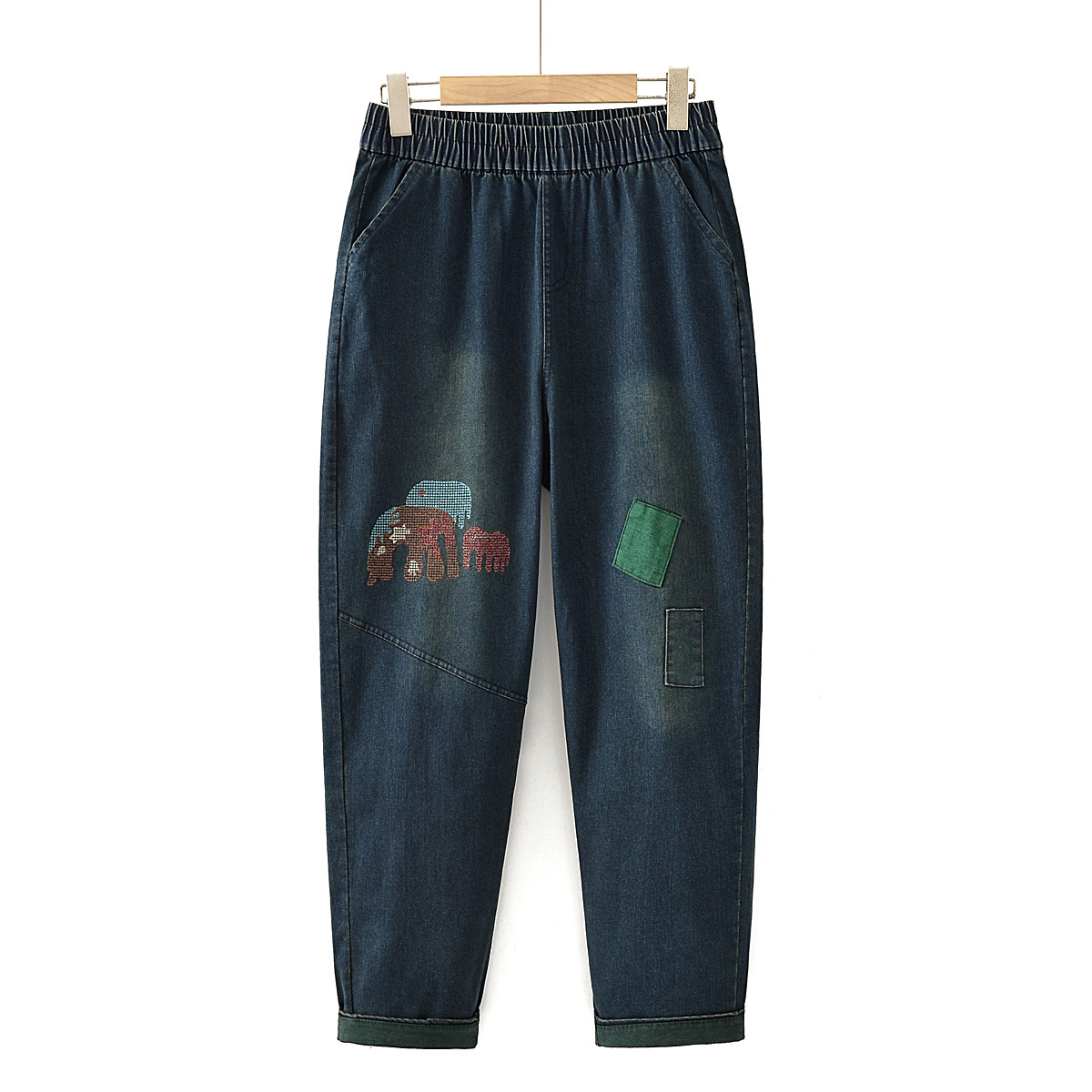 新款中年胖妈妈秋装牛仔裤大码洋气中老年女装刺绣松紧弹力老爹裤