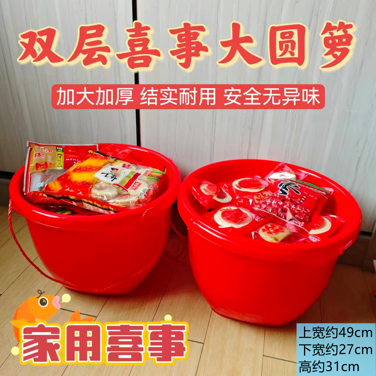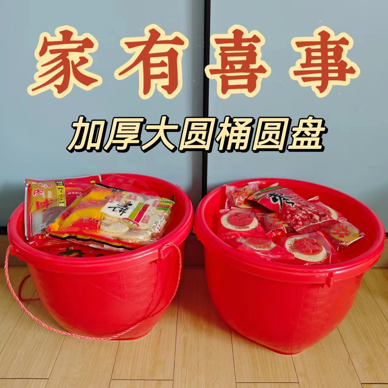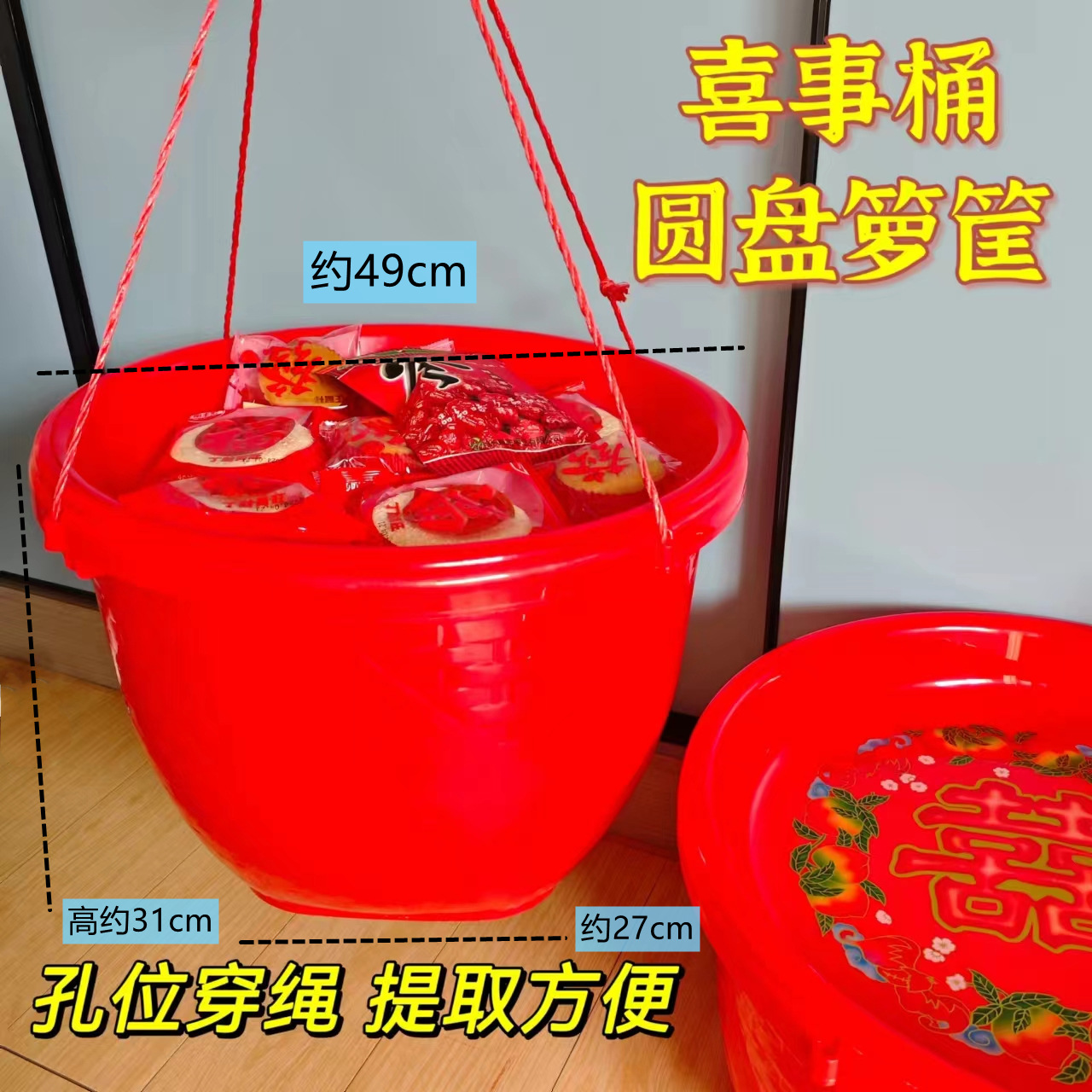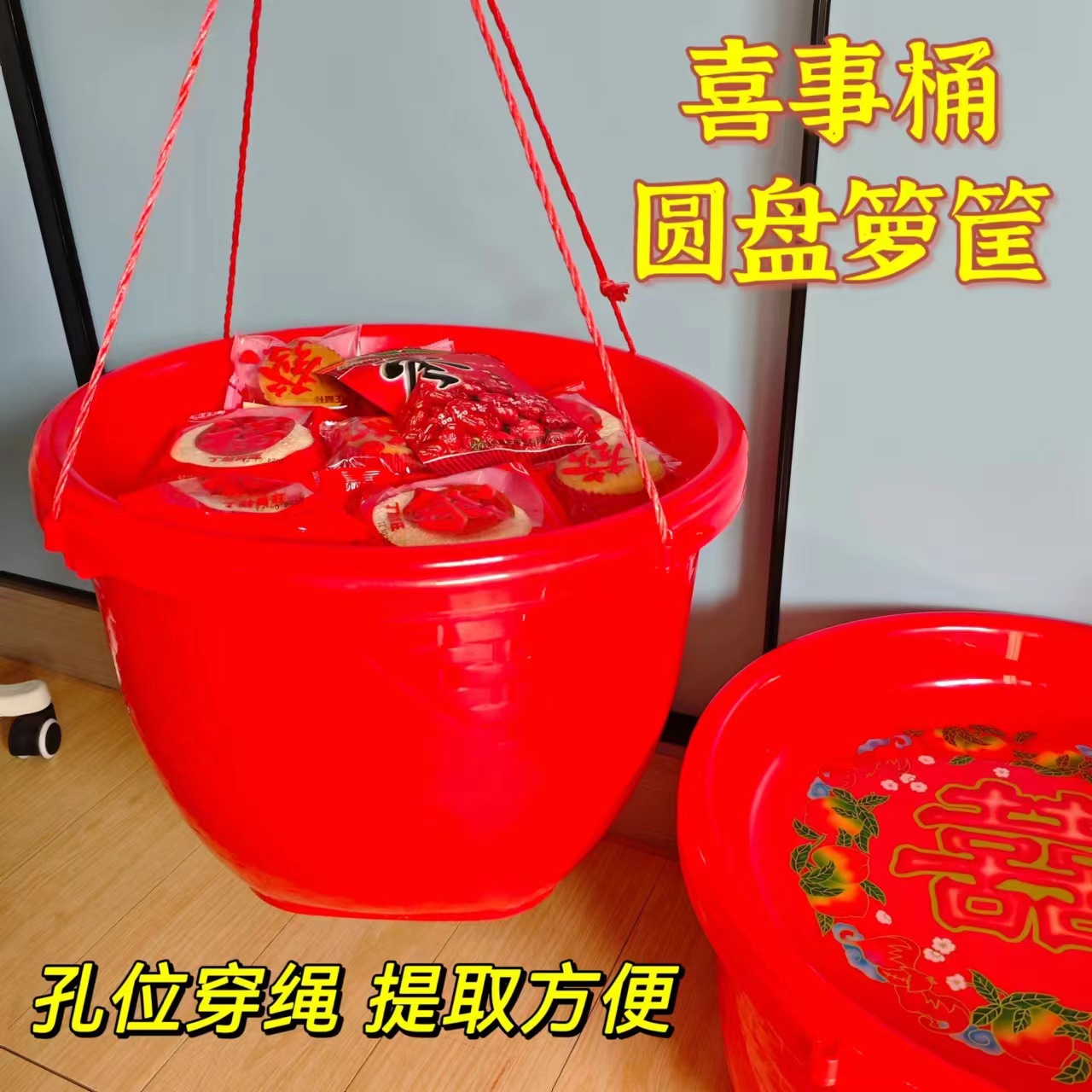 塑料圆箩加厚婚庆大红带圆盘箩筐结婚乔迁入伙子孙桶喜事桶喜事箩