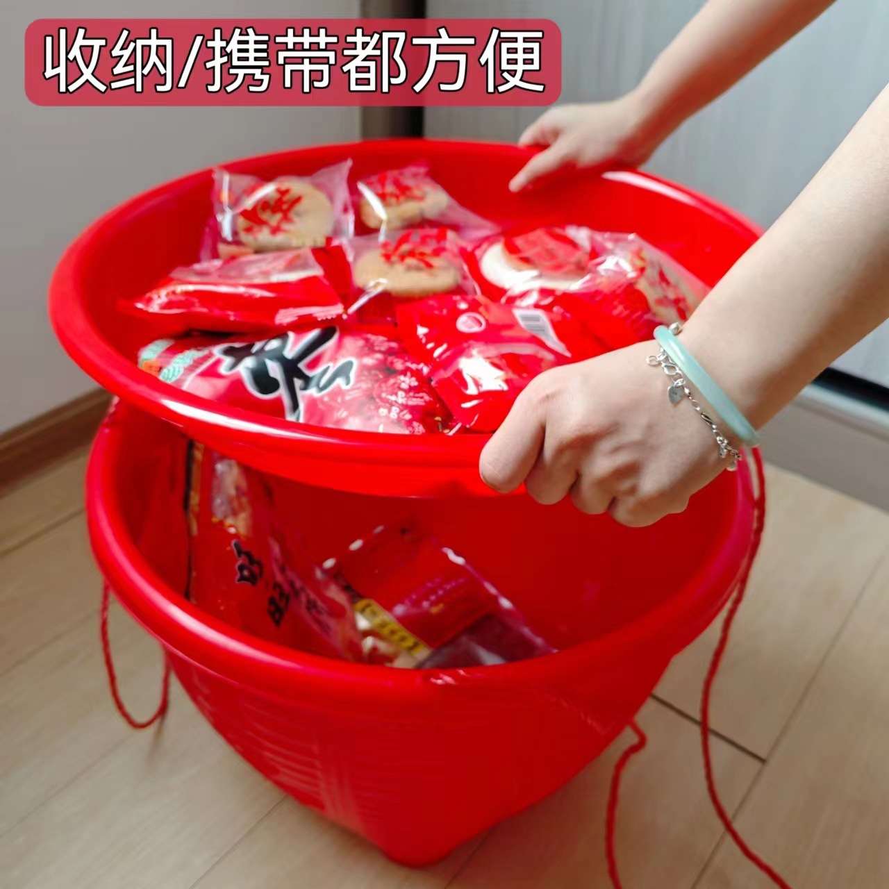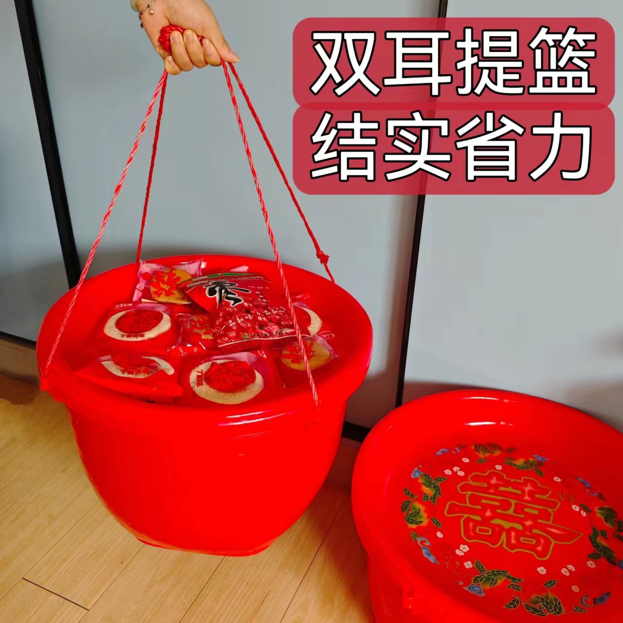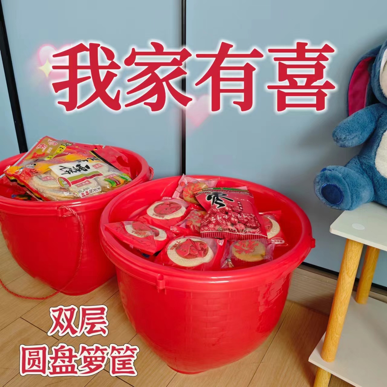塑料圆箩加厚婚庆大红带圆盘箩筐结婚乔迁入伙子孙桶喜事桶喜事箩