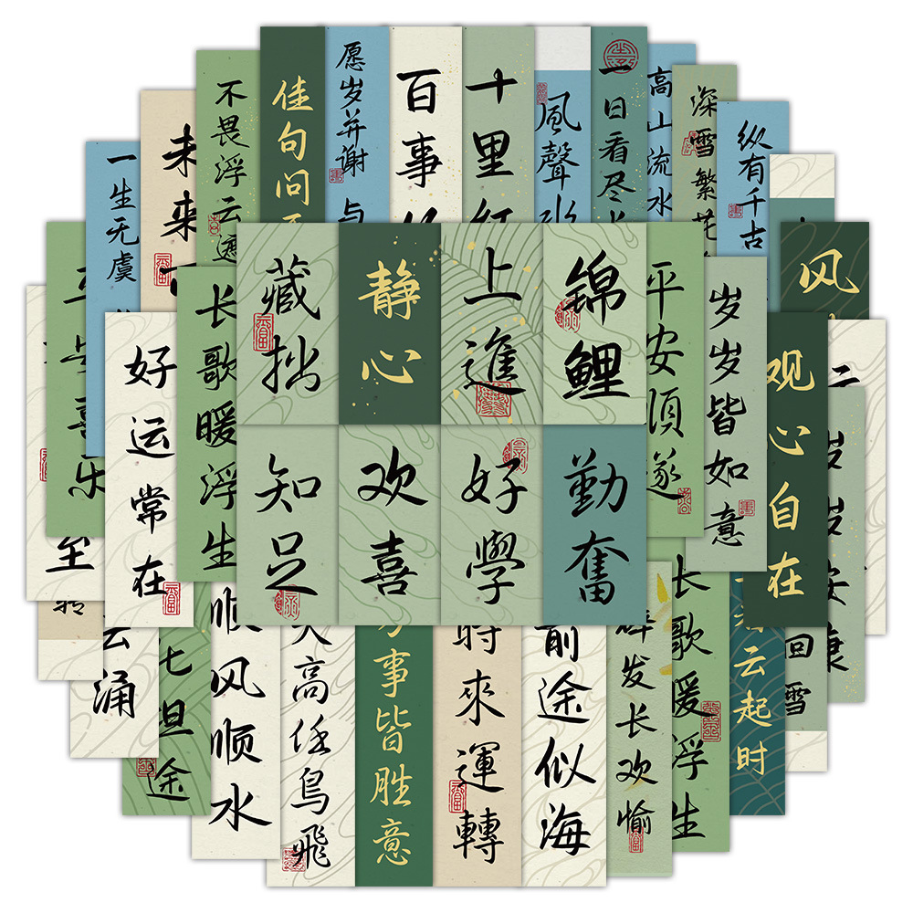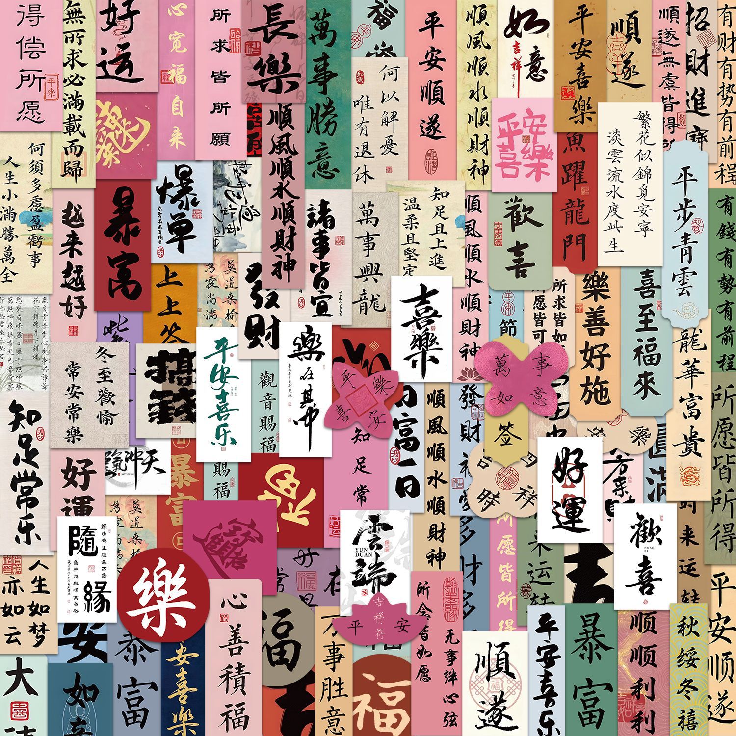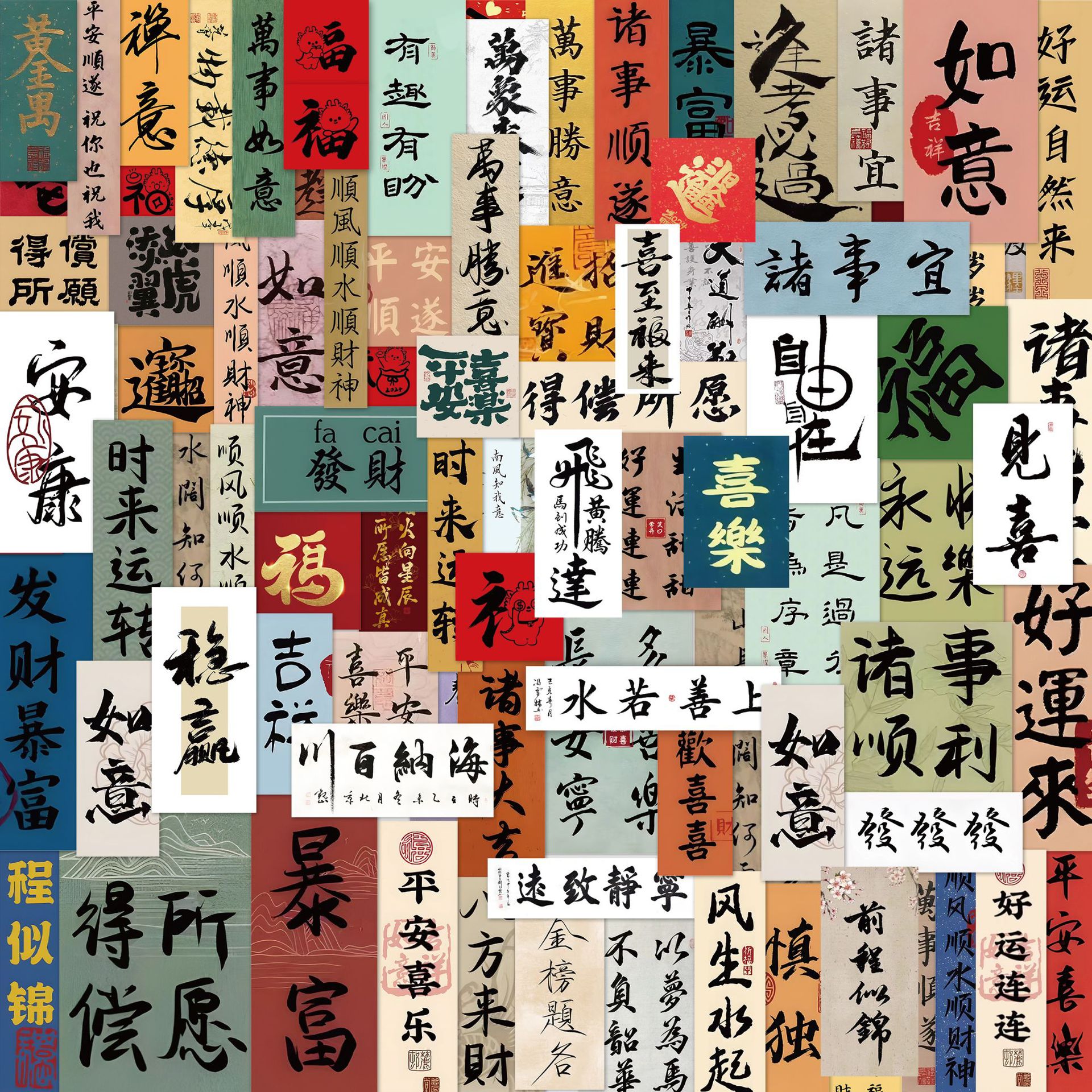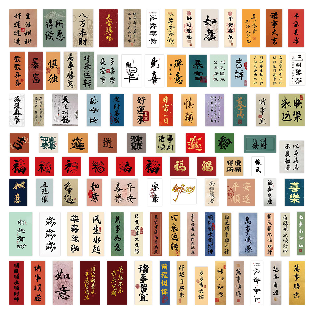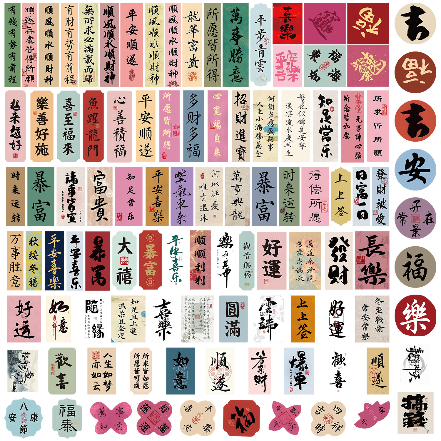 100张中国古风书法励志贴纸毛笔字福字小字条DIY手机行李箱小贴画