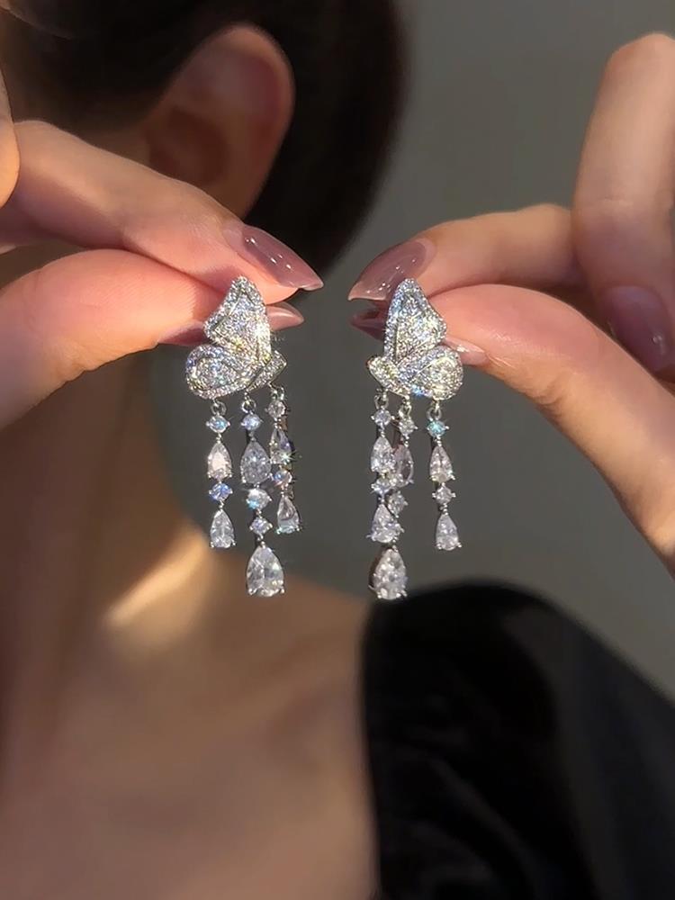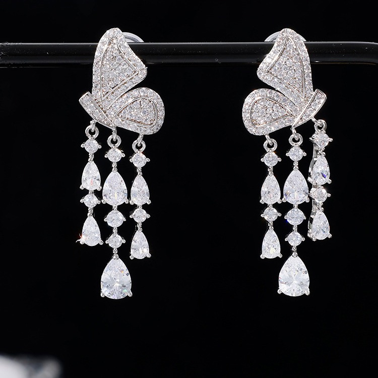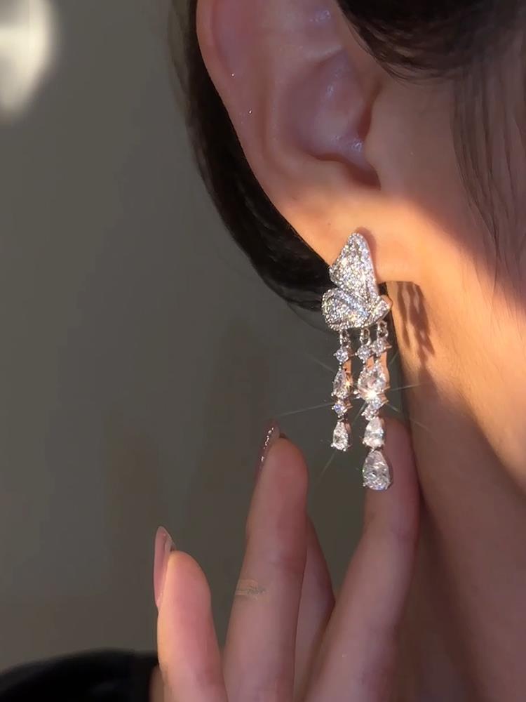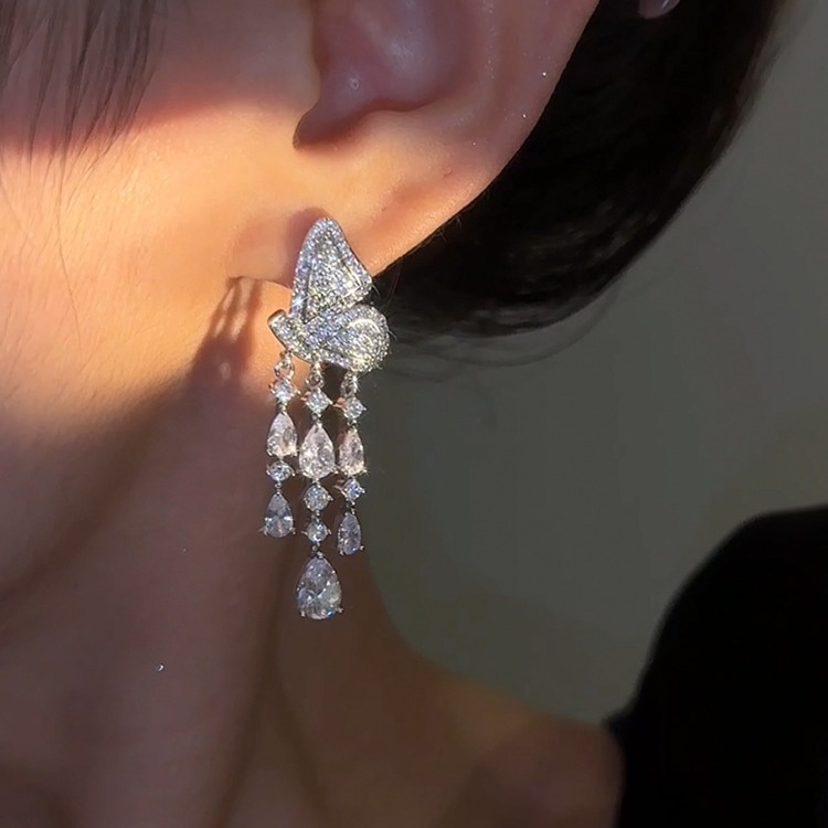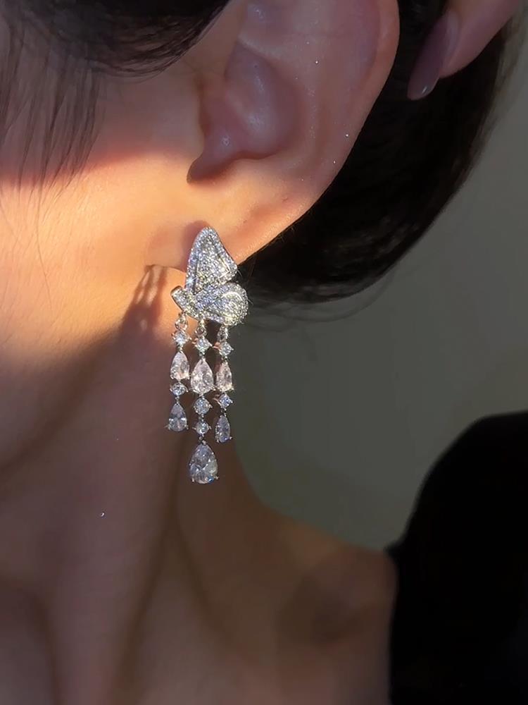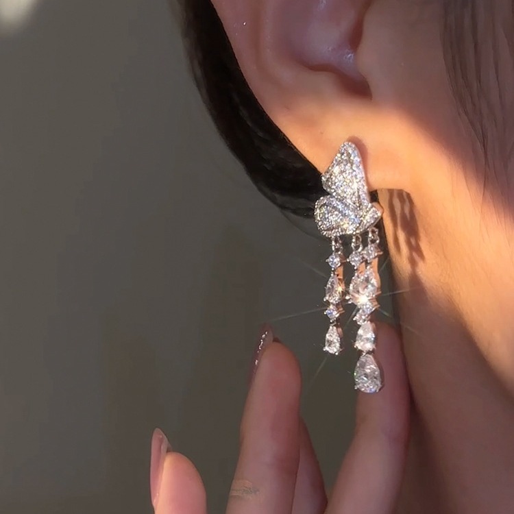 微镶锆石满钻蝴蝶流苏耳环轻奢风气质优雅重工精美S925银针耳饰